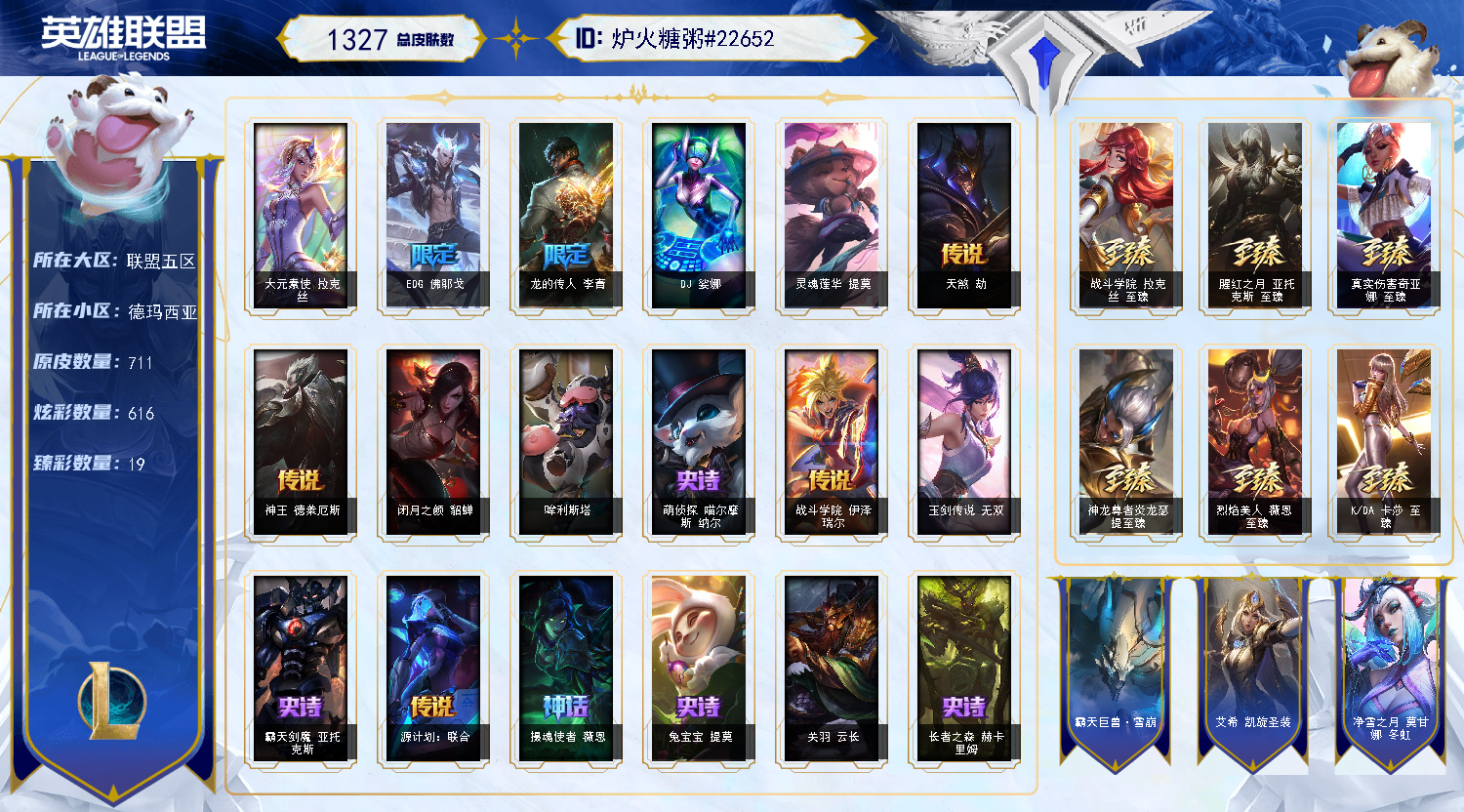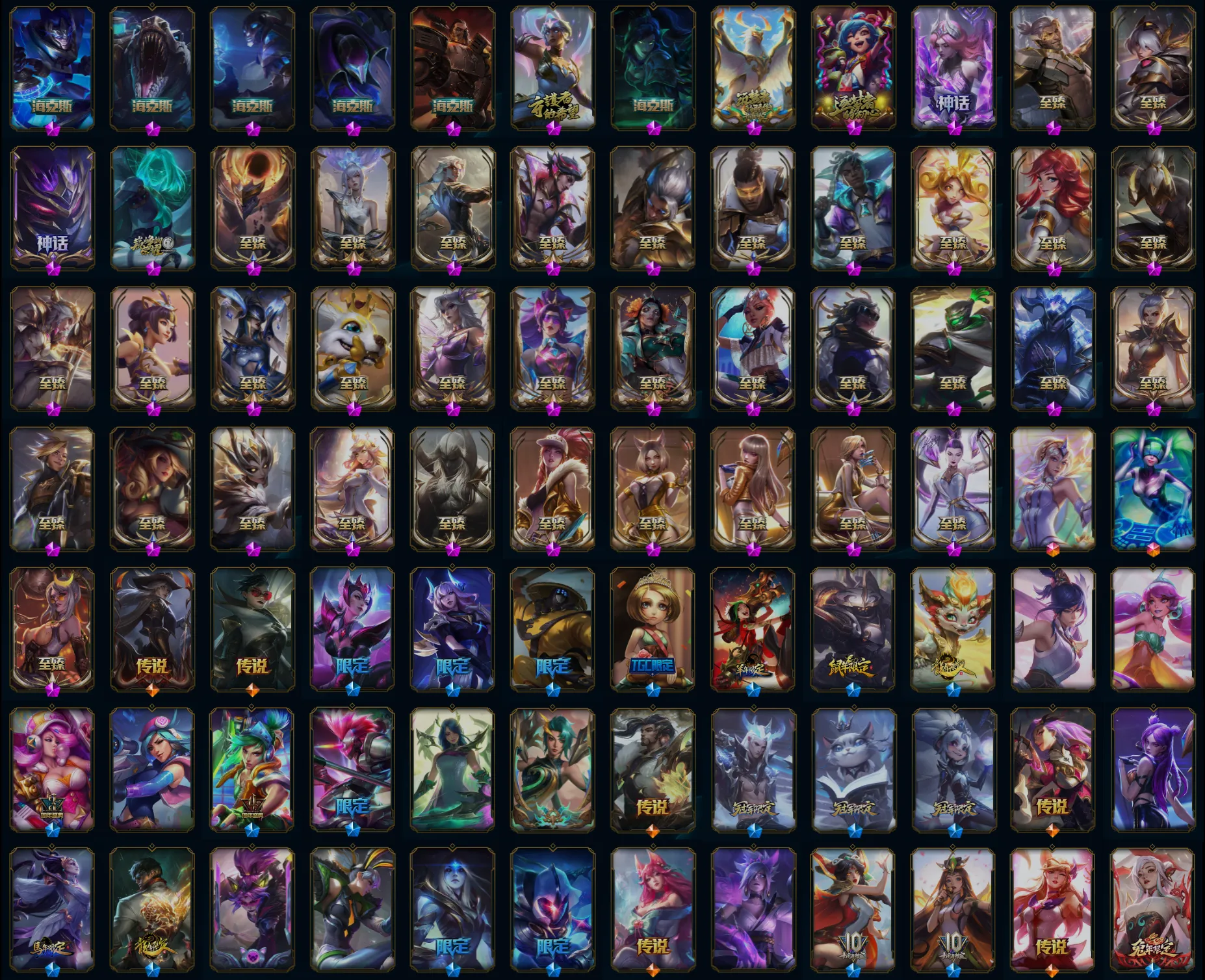 【重要皮肤】幻灵狮心蕾欧娜至臻 神龙尊者比翼之龙洛至臻 魂蔷薇烈娜塔至臻 DRX亚托克斯至臻 花仙使者卡特琳娜至臻 青花瓷丽桑卓至臻 海珀利安小队X09星环灵风迦娜至臻 星之守护者艾克至臻 青花瓷拉克丝至臻 魅惑女巫莫甘娜至臻 女帝黛安娜至臻 魔女婕拉至臻 未来战士卢锡安至臻 真实伤害赛娜至臻 星之守护者索拉卡至臻 灵能特工伊泽瑞尔至臻 源计划逆流塞拉斯至臻 暗星墨菲特至臻 神龙尊者炎龙瑟提至臻 黑夜使者凯隐至臻 征服者贾克斯至臻 KDA二代卡莎至臻 KDA一代卡莎至臻 KDA阿狸至臻 KDA伊芙琳至臻 KDA阿卡丽至臻 战斗学院拉克丝至臻 战斗学院拉克丝2022至臻 烈焰美人薇恩至臻 烈焰美人薇恩2022至臻 星之守护者妮蔻至臻 星之守护者妮蔻2022至臻 源计划正义艾瑞莉娅至臻 源计划正义艾瑞莉娅2022至臻 真实伤害奇亚娜至臻 绒毛菲兹至臻 绒毛菲兹2022至臻 玉剑传说武剑仙至臻 玉剑传说武剑仙2022至臻 腥红之月亚托克斯至臻 腥红之月亚托克斯2022至臻 黑夜使者李青至臻 黑夜使者李青2022至臻 海克斯科技雷克顿 海克斯科技玛尔扎哈 海克斯科技嘉文四世 海克斯科技魔腾 水晶泰坦诺提勒斯 水晶圣骑蕾欧娜 黎明使者卡尔玛 恐惧新星德莱厄斯 摄魂使者薇恩 胜利剑圣易 胜利女神希维尔 舞会公主安妮 荣誉使者玛尔扎哈 养蜂人辛吉德 电玩女神厄运小姐 电玩勇者锐雯 电玩女神阿狸 神凰行者幽羽玄凰萨勒芬妮 神凰行者烈羽焰凰霞 玉剑传说神机花火 玉剑传说无劫 黎明使者薇恩 点心宝贝阿木木 剪纸仙灵娜美 龙的传人李青 天龙之子斯莫德 剪纸仙灵艾瑞莉娅 神龙烈焰金克丝 玉净夜叉凯特琳 广寒仙子嫦娥 虎痴之拳蔚 烈焰美人薇恩 王国机神白虎贾克斯 胜利女神瑟庄妮 胜利之树茂凯 胜利机器人布里茨 胜利女神奥莉安娜 胜利枪神格雷福斯 胜利枪神卢锡安 胜利之剑亚托克斯 怦然心动凯特琳 觅心游侠卢锡安 觅心魔灵奥莉安娜 觅心之翼奎因 水晶玫瑰婕拉 双城之战2微光实验室辛吉德 寒冬精灵璐璐 圣诞捣蛋鬼金克丝 冰雪驯鹿波比 冰雪风暴希维尔 冰雪女神辛德拉 魄罗骑士瑟庄妮 平安夜女神娑娜 圣诞糖果棒厄运小姐 魅惑女巫崔丝塔娜 伯爵卡萨丁 大魔法锅布里茨 灵魂收割者索拉卡 泳池派对奥莉安娜 泳池派对塔莉垭 泳池派对塔里克 泳池派对菲奥娜 泳池派对李青 泳池派对蕾欧娜 泳池派对雷克顿 电玩战魂赫卡里姆 斩星魔剑易 御星魔矢艾希 DRX艾希 EDG佛耶戈 EDG悠米 EDG佐伊 DWG崔斯特 FPX薇恩 iG洛 SKTT1卡莉丝塔 SKTT1伊莉丝 SKTT1雷克顿 SSW雷恩加尔 SSW泰隆 SKTT1李青 SKTT1薇恩 暗杀星蒙多 暗杀星努努和威朗普 暗杀星慎 Fnatic库奇 Fnatic嘉文四世 冰雪节辛吉德 防暴士兵格雷福斯 防暴士兵辛吉德 防暴天使凯尔 钢铁之翼艾尼维亚 冠军之刃锐雯 冠军之刃锐雯2016 春晖神女艾希 鬼影森森茂凯 海贼瑞兹 胡桃夹子萨科 警用试作体K9内瑟斯 蓝色忧郁崔斯特 魅惑女巫娜美 魅惑女巫悠米 南瓜头费德提克 圣诞精灵崔丝塔娜 圣诞开心鬼提莫 圣诞老人古拉加斯 圣诞驯鹿克格莫 糖果使徒费德提克 卧虎藏龙贾克斯 无头骑士赫卡里姆 喜庆之树茂凯 邪恶圣诞老人维迦 幸福女神乐芙兰 雪默丁格 野兽猎人德莱文 野兽猎人瑟庄妮 永恒之森乐芙兰 勇者阿狸 征服者卡尔玛 暗影沃里克 机械迷城加里奥 战场BOSS吉格斯 都铎王朝图奇 十周年纪念安妮 源代码乐芙兰 神凰行者瑞羽圣凰艾尼维亚 胜利凤凰艾尼维亚 DJ娑娜 大元素使拉克丝 绝息圣堂洛 魔女娜美