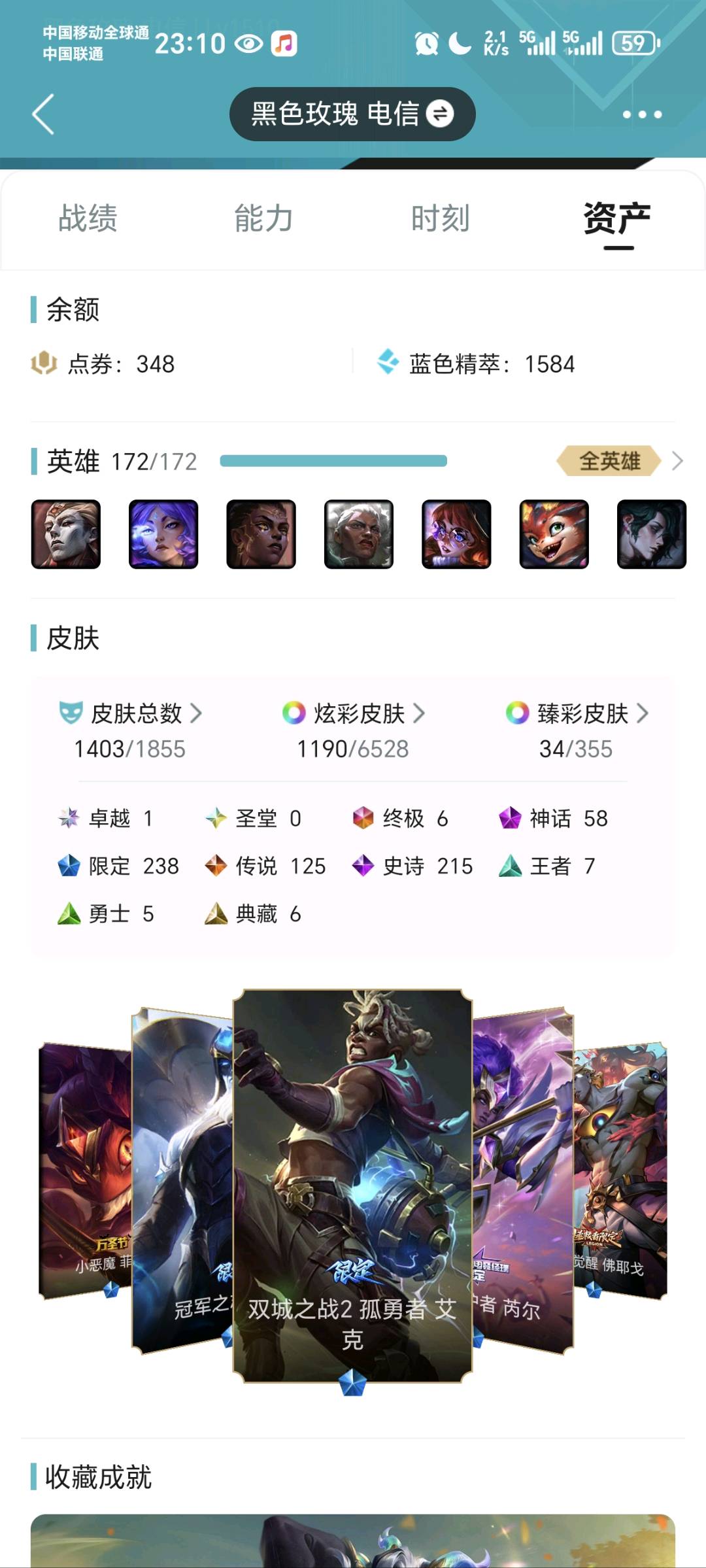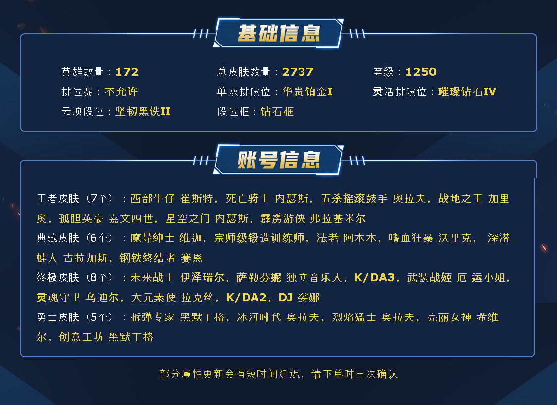 最新1200元诺克!!!这是一个相当值得收藏的号!!!回头客超多!!!(请不要挂机,挂机必拉黑!!!!)2200皮,1300+原皮,热门皮肤几乎全部都有,全部英雄都有皮肤 ~~热门英雄几乎都拥有至臻皮肤~~租之前尽量查一下游戏ID,确保段位是您需要的,避免浪费您的时间~~请勿挂机逃跑故意送人头,谢谢合作,谢谢~~~~喜欢记得收藏~~可排位~~全英雄,有活动抽奖 !皮肤陆续增加中。