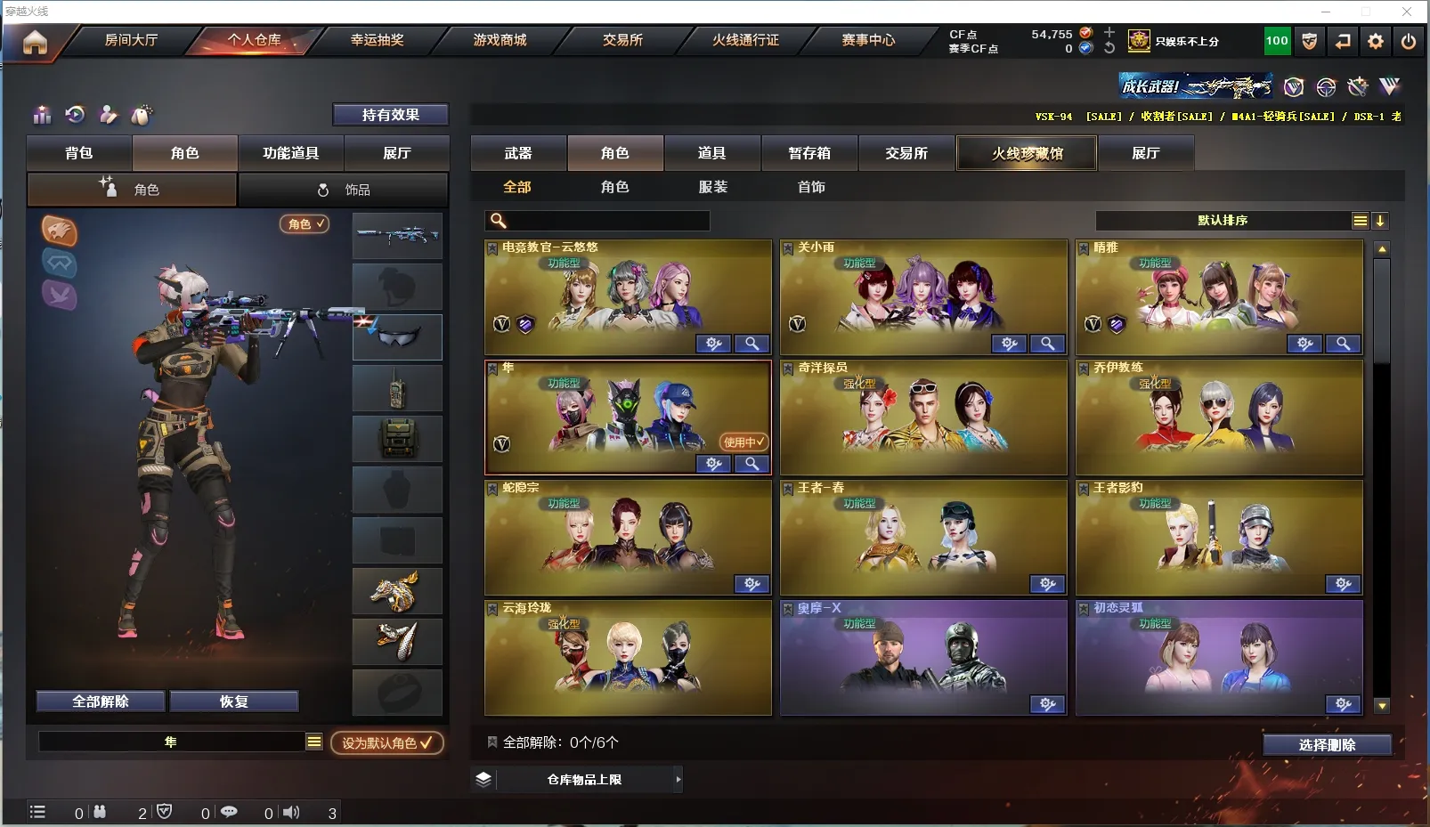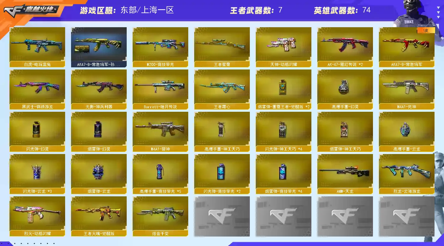 【道 具】:白泽玩偶、兔子泰迪玩偶、铁骑玩偶、审判者玩偶、关羽玩偶、小红玩偶、7个背包、AC(防弹衣+防弹头盔)、C4工具钳、手雷包、挑战弹夹、夺命之镰、变异宝贝、灵魂忍者、生化弹夹、防化服、机枪弹夹、冲锋枪弹夹、散弹枪弹夹、手枪弹夹、狙击枪弹夹、步枪弹夹、减少停顿包