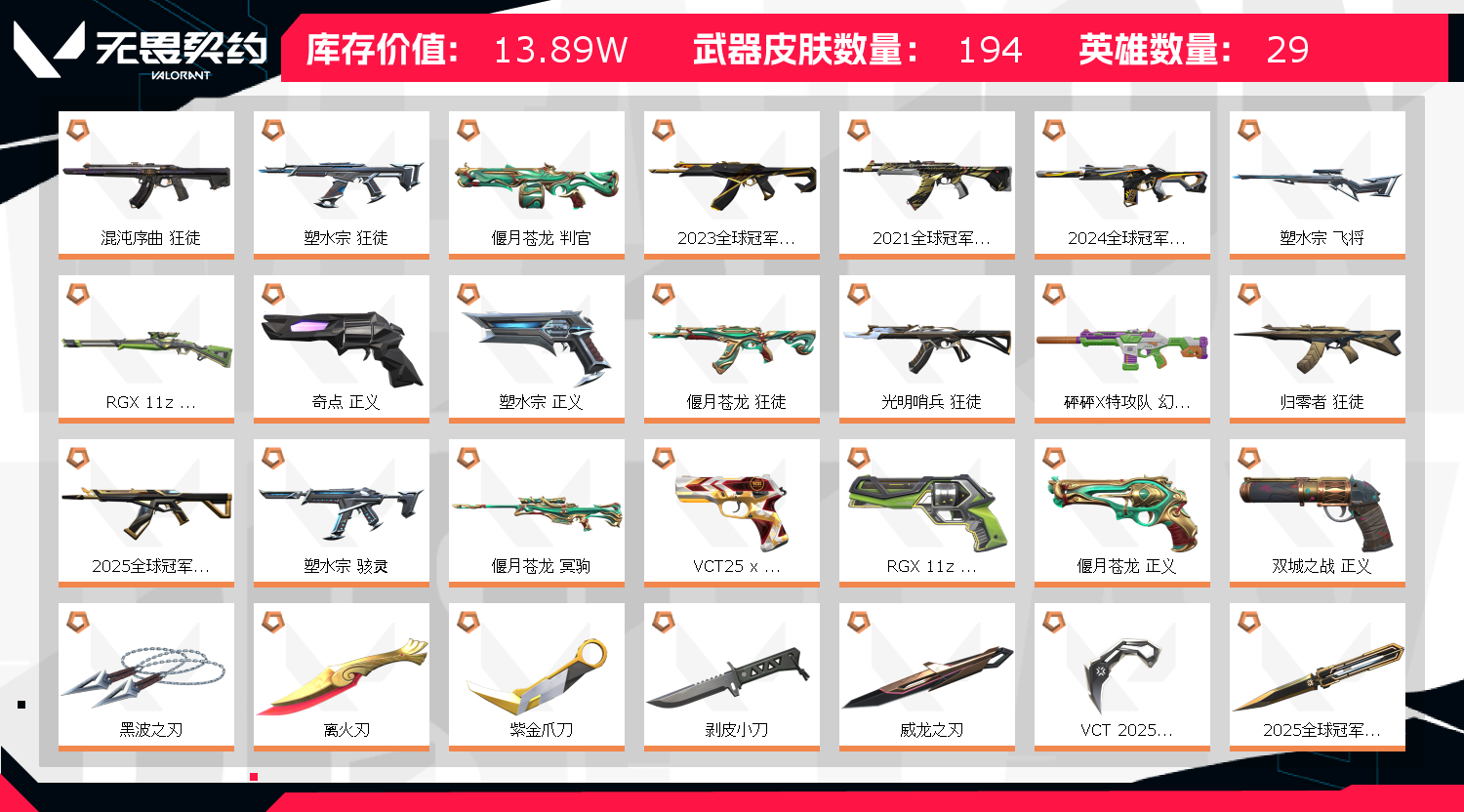 【当前段位:白银II】29刀✨离火刃篆刀✨5套冠军齐全✨显卡爪剥皮黑波鬼丸魔法棒✨混沌盖亚狂徒✨塑水套苍龙套威龙神兵堕天套