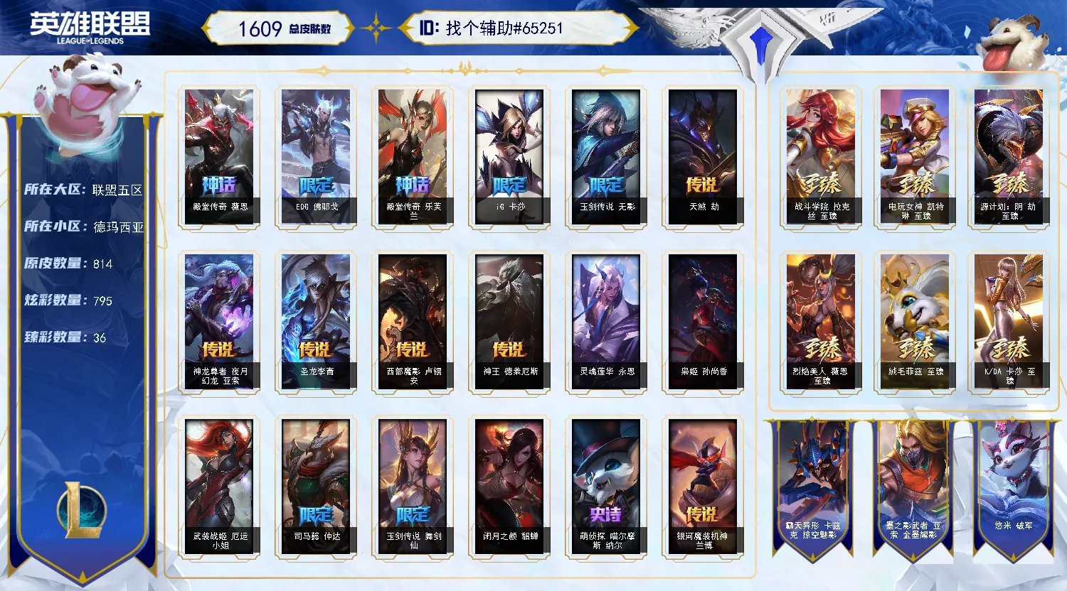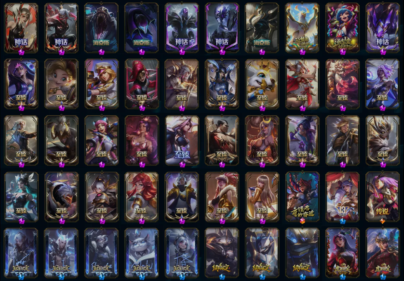 【重要皮肤】凯旋将军德莱厄斯至臻 黑色玫瑰假面舞会卡特琳娜至臻 暗星女王黛安娜至臻 绝息圣堂厄运小姐至臻 剪纸仙灵希维尔至臻 青花瓷丽桑卓至臻 灵魂莲华易至臻 星之守护者辛德拉至臻 月蚀骑士赛娜至臻 幻灵战斗猫金克丝至臻 神凰行者烈羽焰凰霞至臻 女帝黛安娜至臻 魔女婕拉至臻 奥术师佐伊至臻 真实伤害亚索至臻 灵能特工伊泽瑞尔至臻 源计划阴劫至臻 黑夜使者凯隐至臻 神龙尊者均衡之龙沃利贝尔至臻 KDA一代卡莎至臻 KDA卡莎2022至臻 KDA阿卡丽至臻 战斗学院拉克丝至臻 烈焰美人薇恩至臻 电玩女神凯特琳至臻 源计划正义艾瑞莉娅至臻 源计划正义艾瑞莉娅2022至臻 绒毛菲兹至臻 黑夜使者李青至臻 殿堂传奇薇恩 殿堂传奇乐芙兰 灰烬骑士派克 灰烬杀手塞拉斯 海克斯科技安妮 海克斯科技雷克顿 海克斯科技克格莫 海克斯科技阿木木 海克斯科技魔腾 水晶掠夺者卡兹克 暗星科加斯 零之枪骑赫卡里姆 胜利剑圣易 胜利女神娑娜 胜利之王泰达米尔 胜利巨口克格莫 养蜂人辛吉德 电玩勇者锐雯 电玩女神阿狸 星之守护者伊泽瑞尔 玉剑传说无影 玉剑传说舞剑仙 女帝格温 玉剑传说神机花火 灵能特工易 点心宝贝阿木木 点心宝贝辛德拉 天龙之子斯莫德 剪纸仙灵盖伦 剪纸仙灵加里奥 烈焰仙子黛安娜 猛虎下山赵信 美猴王孙悟空 紫金罗刹莫甘娜 张辽文远 司马懿仲达 醒狮克格莫 王国机神苍狼瑟提 王国机神白虎贾克斯 王国机神玄武盖伦 福牛守护者安妮 福牛守护者阿利斯塔 胜利女神瑟庄妮 胜利机器人布里茨 胜利枪神卢锡安 胜利之剑亚托克斯 怦然心动凯特琳 黯然心伤阿木木 水晶玫瑰迦娜 碎心之拳蔚 甜心之羽霞 觅心萝莉金克丝 觅心猫猫悠米 水晶玫瑰斯维因 北极星神黛安娜 雪球也能爆炸吉格斯 圣诞捣蛋鬼金克丝 冰雪风暴希维尔 魄罗骑士瑟庄妮 夺命美人卡特琳娜 圣诞糖果棒厄运小姐 魅惑女巫崔丝塔娜 灵魂收割者索拉卡 海之歌奈德丽 海之歌萨勒芬妮 海之歌永恩 海之歌泽丽 泳池派对凯特琳 泳池派对辛德拉 泳池派对李青 电玩战魂赫卡里姆 斩星魔剑易 御星魔矢艾希 DRX亚托克斯 DRX千珏 EDG厄斐琉斯 EDG佛耶戈 EDG格雷福斯 EDG悠米 EDG佐伊 FPX锤石 FPX薇恩 iG卡莎 SSG塔莉垭 SSG伊泽瑞尔 SKTT1辛德拉 SKTT1艾克 SKTT1奥拉夫 SKTT1阿利斯塔 SKTT1卡莉丝塔 SKTT1瑞兹 SKTT1伊莉丝 SSW锤石 SSW雷恩加尔 SSW泰隆 SSW图奇 SSW辛吉德 SKTT1劫 SKTT1薇恩 暗杀星蒙多 暗杀星努努和威朗普 Fnatic迦娜 Fnatic嘉文四世 Fnatic卡尔萨斯 防暴士兵辛吉德 防暴天使凯尔 冠军掠夺者卡兹克 冠军之矛卡莉丝塔 冠军之刃锐雯2016 冠军之血希瓦娜 春晖大帝锤石 海贼瑞兹 胡桃夹子萨科 惊悚派对费德提克 警用试作体K9内瑟斯 密林猎手提莫 圣诞狂欢努努和威朗普 圣诞老人古拉加斯 圣诞玩偶波比 圣诞驯鹿克格莫 无头骑士赫卡里姆 喜庆之树茂凯 雪默丁格 雪球也能爆炸吉格斯 野兽猎人德莱文 野兽猎人瑟庄妮 英勇玩具兵普朗克 征服者卡尔玛 征服者韦鲁斯 暗影沃里克 冠军之箭艾希 魅惑女巫菲奥娜 阿木木主人不要我了 2023全球总决赛雷克顿 2021全球总决赛嘉文四世 波比的巧克力工坊 地底世界崔斯特 都铎王朝图奇 十五周年纪念希维尔 十周年纪念安妮 源代码乐芙兰 神凰行者瑞羽圣凰艾尼维亚 胜利凤凰艾尼维亚 斗魂觉醒佛耶戈 斗魂觉醒莎弥拉 武装战姬厄运小姐 绝息圣堂洛