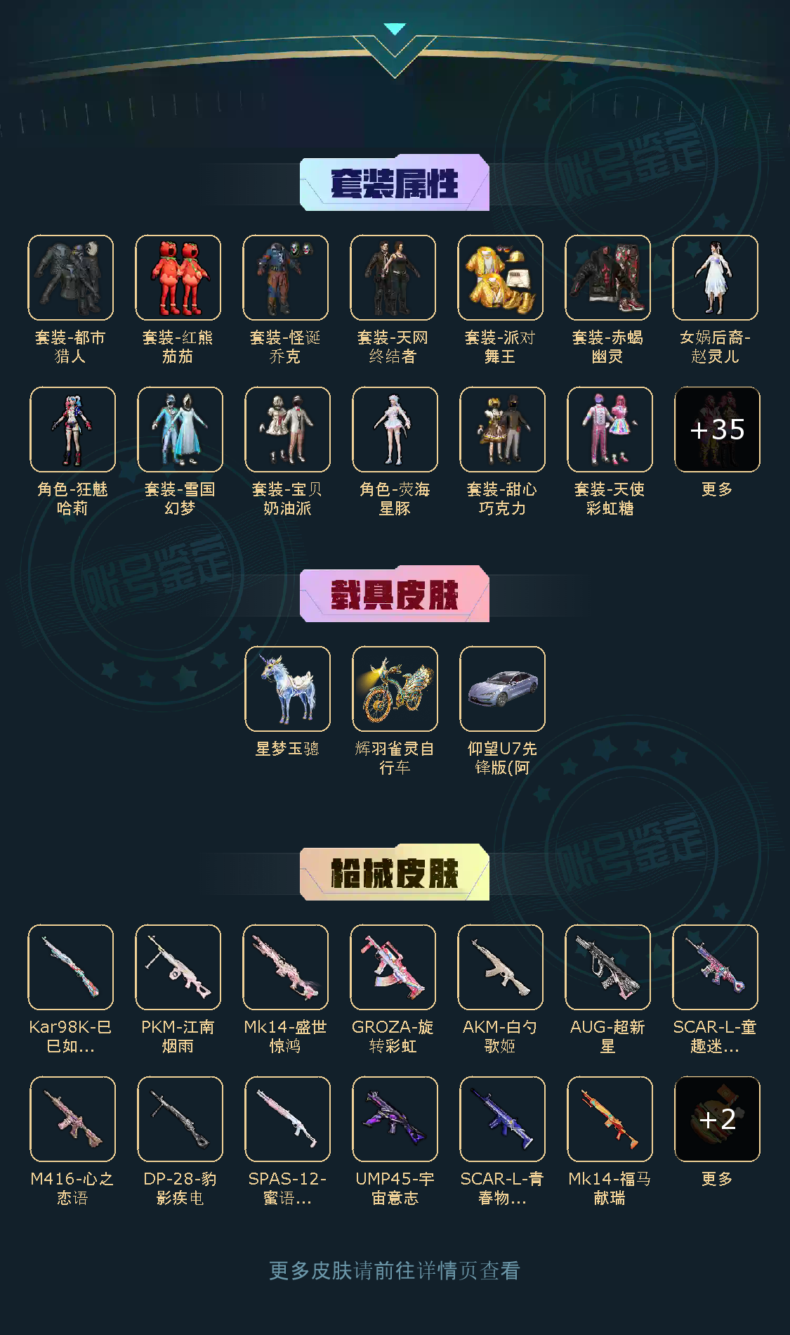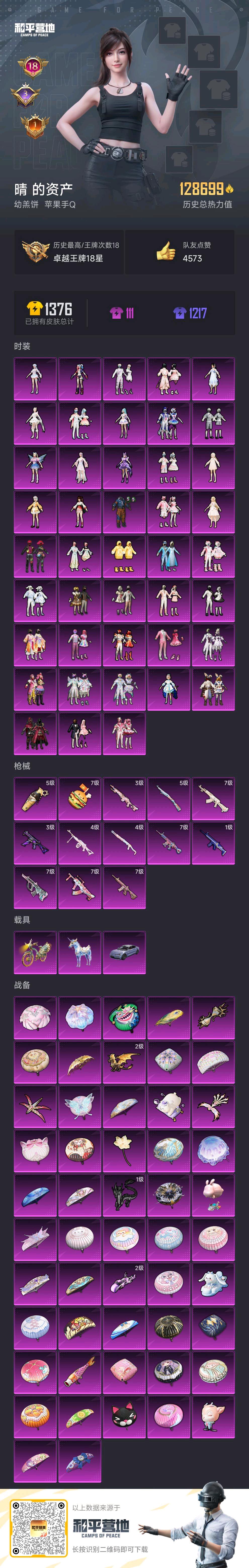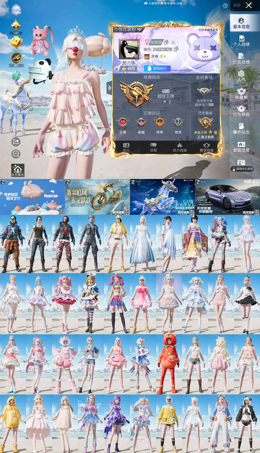 43粉,3载具,274套装,18王牌印记 SCAR-L-童趣迷兔/GROZA-旋转彩虹/M416-心之恋语/AKM-白勺歌姬/SCAR-L-青春物语/AUG-超新星/SPAS-12-蜜语绒猫/Mk14-盛世惊鸿/PKM-江南烟雨/UMP45-宇宙意志/破片手榴弹-热量炸弹/烟雾弹-猫咪绅士/Kar98K-巳巳如意/仰望U7先锋版(阿盖尔紫)/星梦玉骢/辉羽雀灵自行车/