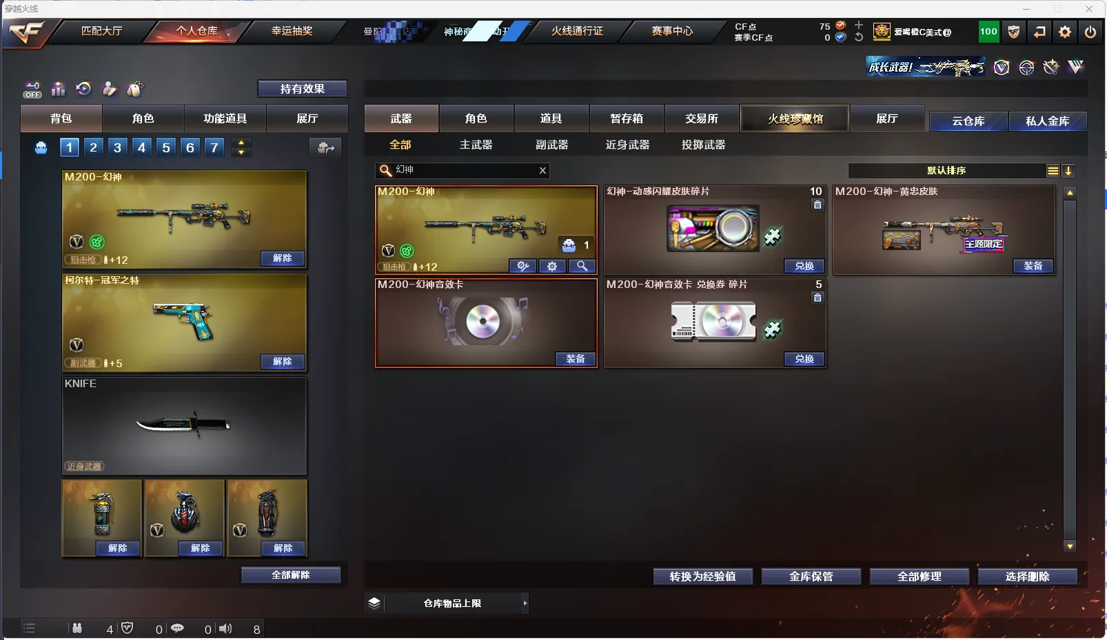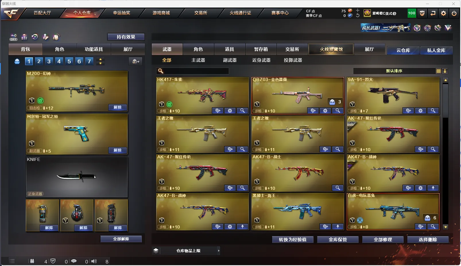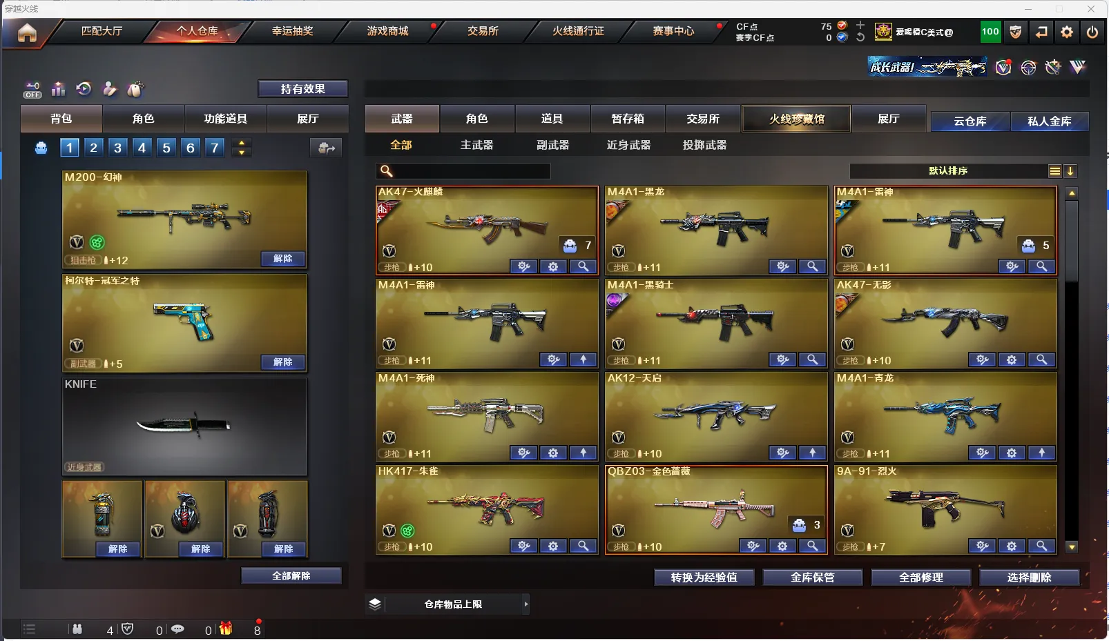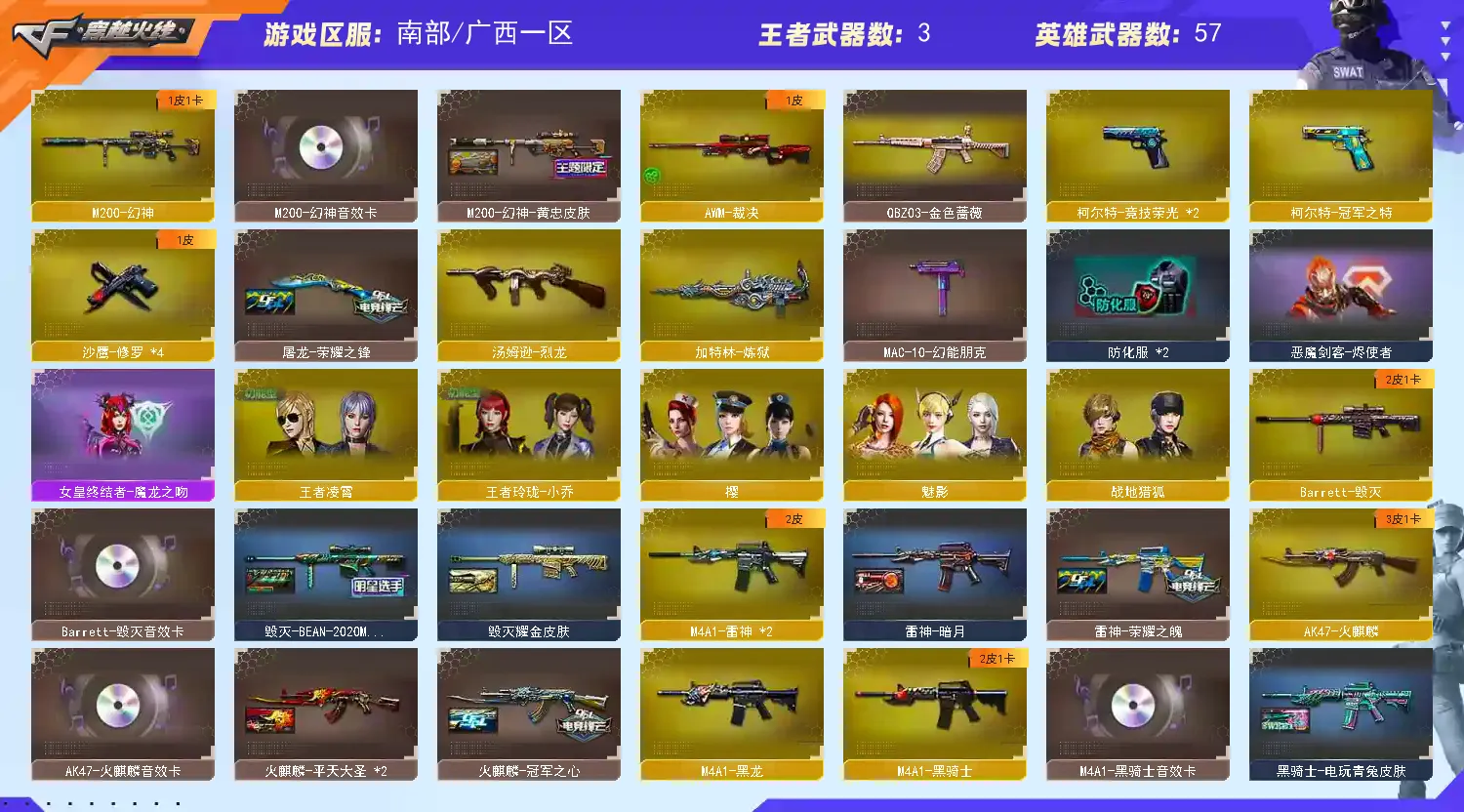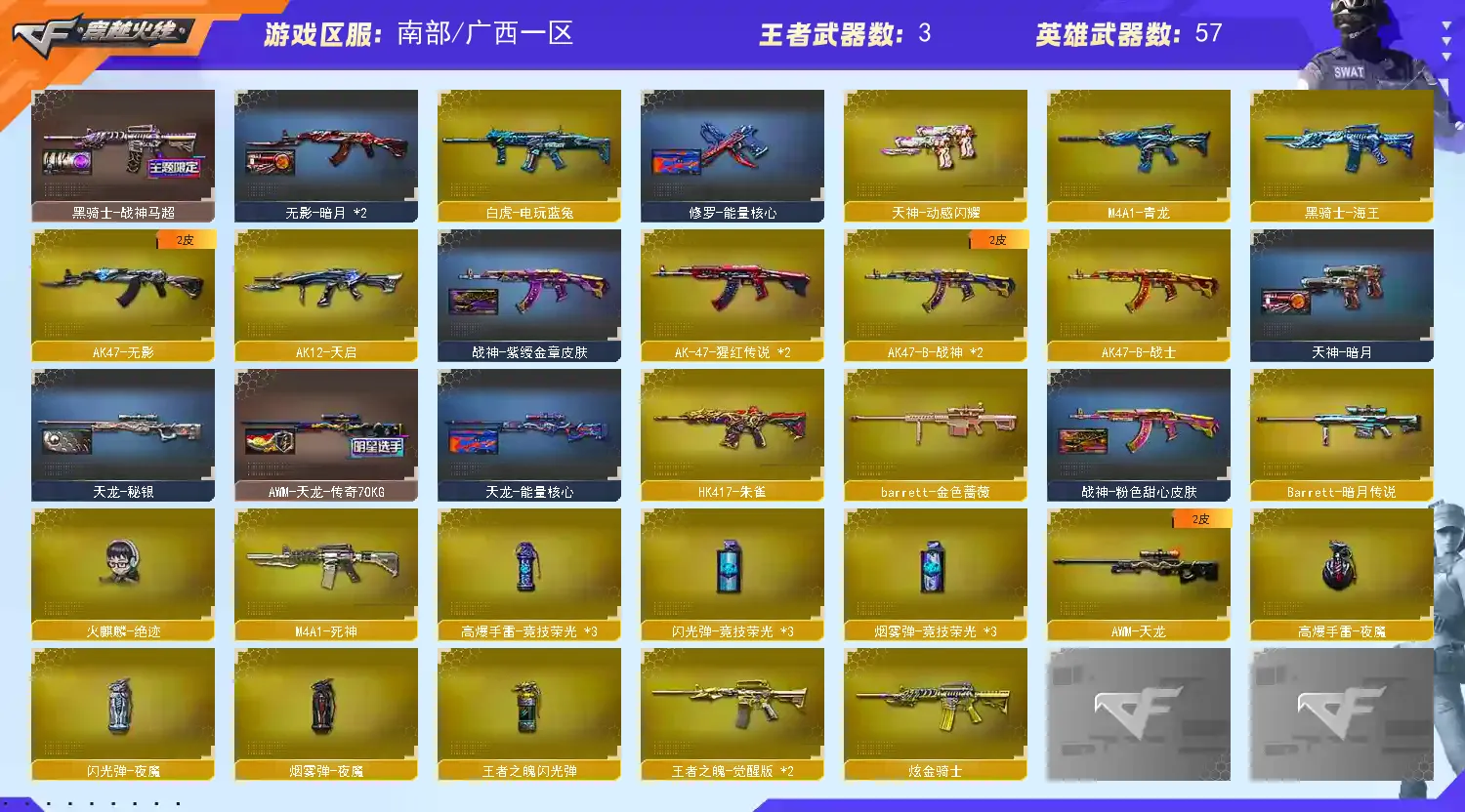 V武器 AK47-火麒麟,AK47-无影,M4A1-雷神,M4A1-黑骑士,M4A1-死神,M4A1-黑龙,M4A1-青龙,Barrett-毁灭,AWM-天龙,AWM-裁决,M200-幻神,AK12-天启,HK417-朱雀,QBZ03-金色蔷薇,9A91-烈火,汤姆逊-烈龙,加特林-炼狱,沙鹰-修罗,沙鹰-天神,屠龙,龙啸,麒麟刺,擎天,黑骑士-海王,柯尔特-竞技荣光,擎天-竞技荣光,Barrett-暗月传说,AK47-B-战士,AK47-B-战神,AK-47-猩红传说,白虎-电玩蓝兔,柯尔特-冠军之特,天神-动感闪耀,屠龙-动感闪耀,马来剑-夜魔