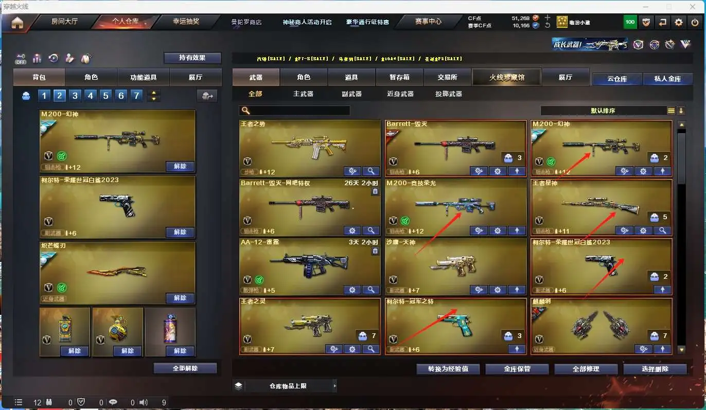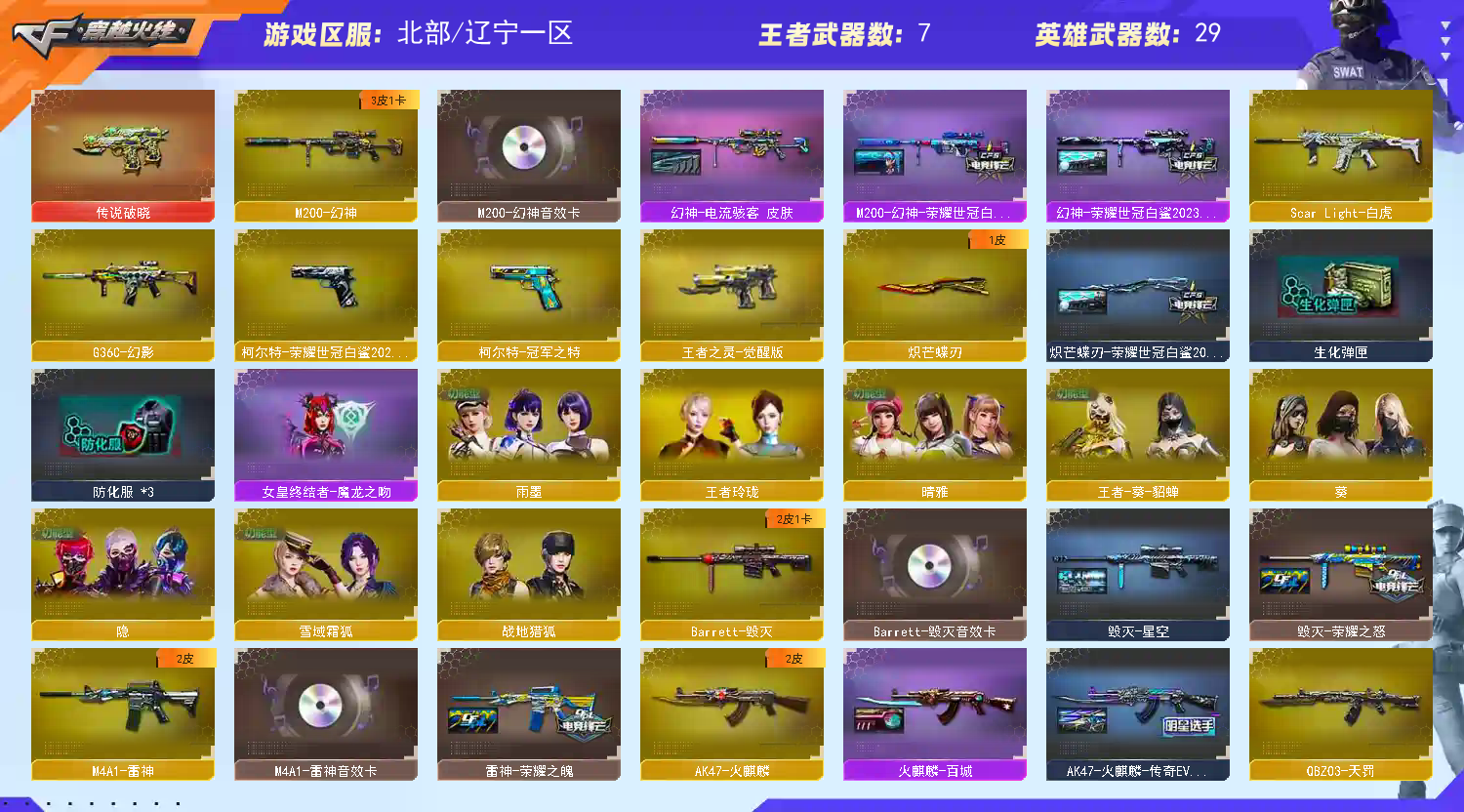 【亮点解析 幻神三件套 荣耀世冠白鲨2023套】 【m200-幻神+音效卡+电流骇客+荣耀世冠白鲨+幻神-荣耀世冠白鲨2023】 【竞技荣光套】 【王者星神】 【传说破晓】 【g36c幻影】 【scar白虎】 【火麒麟+火麒麟-even】 【雷神+音效卡+heartshot+雷神-荣耀之魄】 【毁灭+音效卡+毁灭-荣耀之怒】 【天罚】 【5手呛 天神 柯尔特荣耀世冠白鲨2023 王者之灵 冠军之特】 【4近战 麒麟刺 炽芒蝶刃蝴蝶刀+荣耀世冠白鲨2023 】 【手雷 竞技荣光 雷霆王者】 【四防 王者葵貂蝉】 【角色 葵 晴雅 隐 修道士 王者玲珑】 【幻神音效卡】