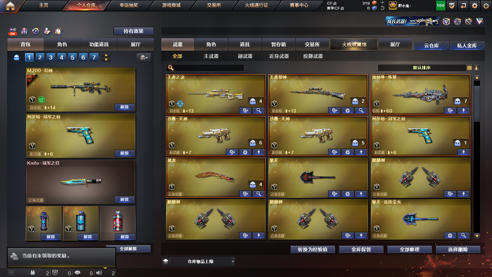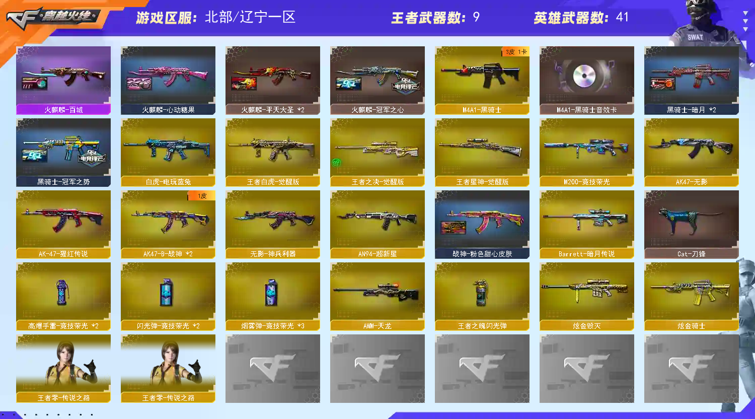 本游戏账号:英雄武器41个; 王者武器6个。 可以玩爆破号、生化号、双全装、稀有武器、等模式。装备不多,但是主武器、副武器、近身武器够用 拥有完美游戏体验。重要的是,特殊装备有:麒麟刺、AK47-火麒麟、QBZ03-金色蔷薇、加特林-炼狱、M200-幻神、AN94-超新星、传说圣灵、Scar Light-白虎、M4A1-黑骑士、M4A1-雷神、AWM-天龙、Barrett-毁灭、烟雾弹-竞技荣光、擎天-竞技荣光、M200-竞技荣光、闪光弹-竞技荣光、高爆手雷-竞技荣光、王者之魄闪光弹、炫金毁灭、王者白虎-觉醒版、炫金骑士、潘多拉、堕天使、职业选手、王者-迷迭香、圣诞潘多拉-X、王者凌霄、王者沙漠玫瑰、Barrett-毁灭音效卡、M200-幻神音效卡、QBZ03-金色蔷薇音效卡、M4A1-黑骑士音效卡、等,随意畅选。