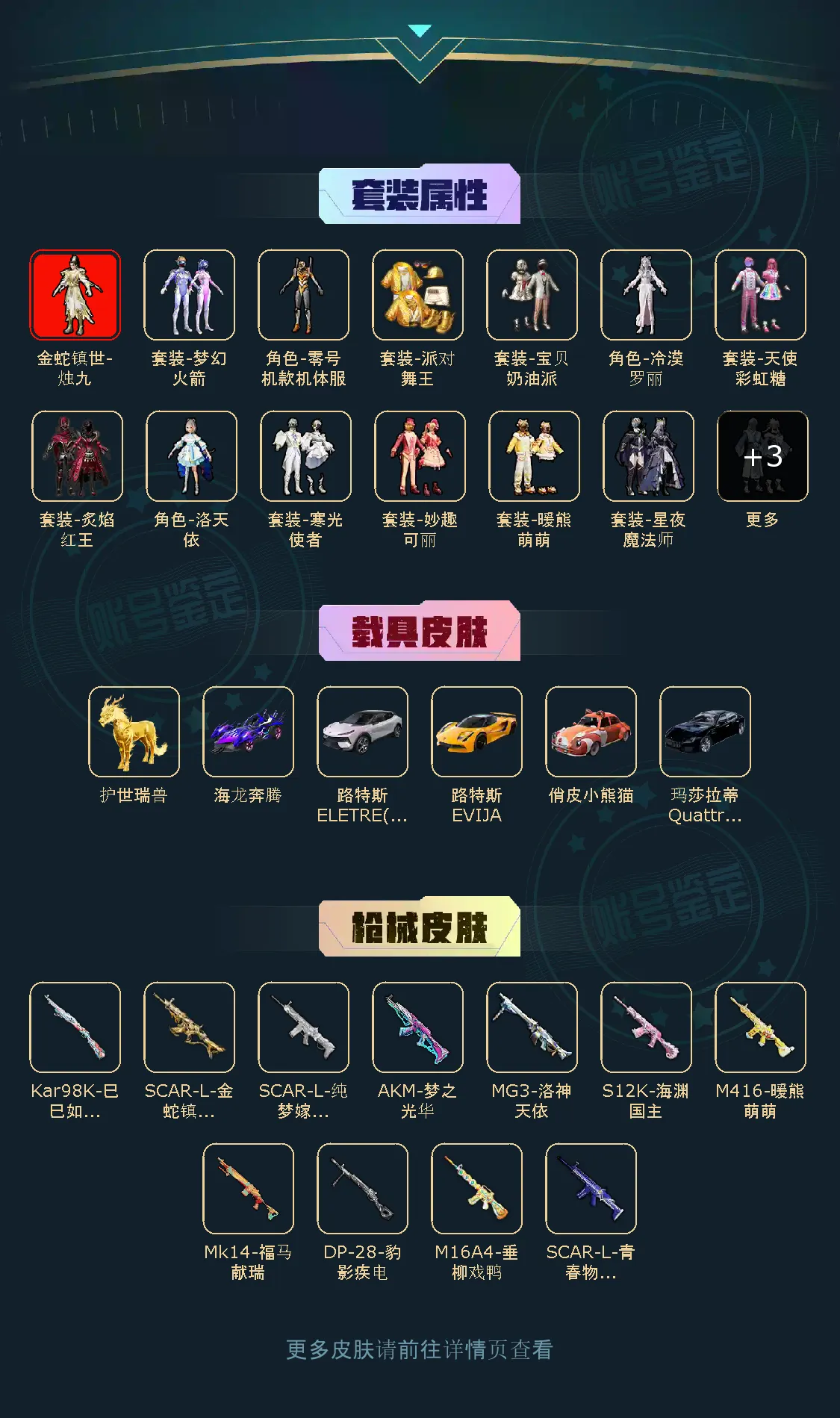 【稀有资产】金蛇镇世-烛九[1级]/角色-零号机款机体服/角色-明日香款战斗服/角色-薰款战斗服/套装-派对舞王/套装-奇异狩猎者/套装-暗夜魅影/套装-浪漫天命/套装-雪山精英/套装-暗影哥特/套装-龟仙人/套装-迅捷狂鲨/角色-俏兔智灵/套装-缤纷假日/套装-动感兔斯基人偶服