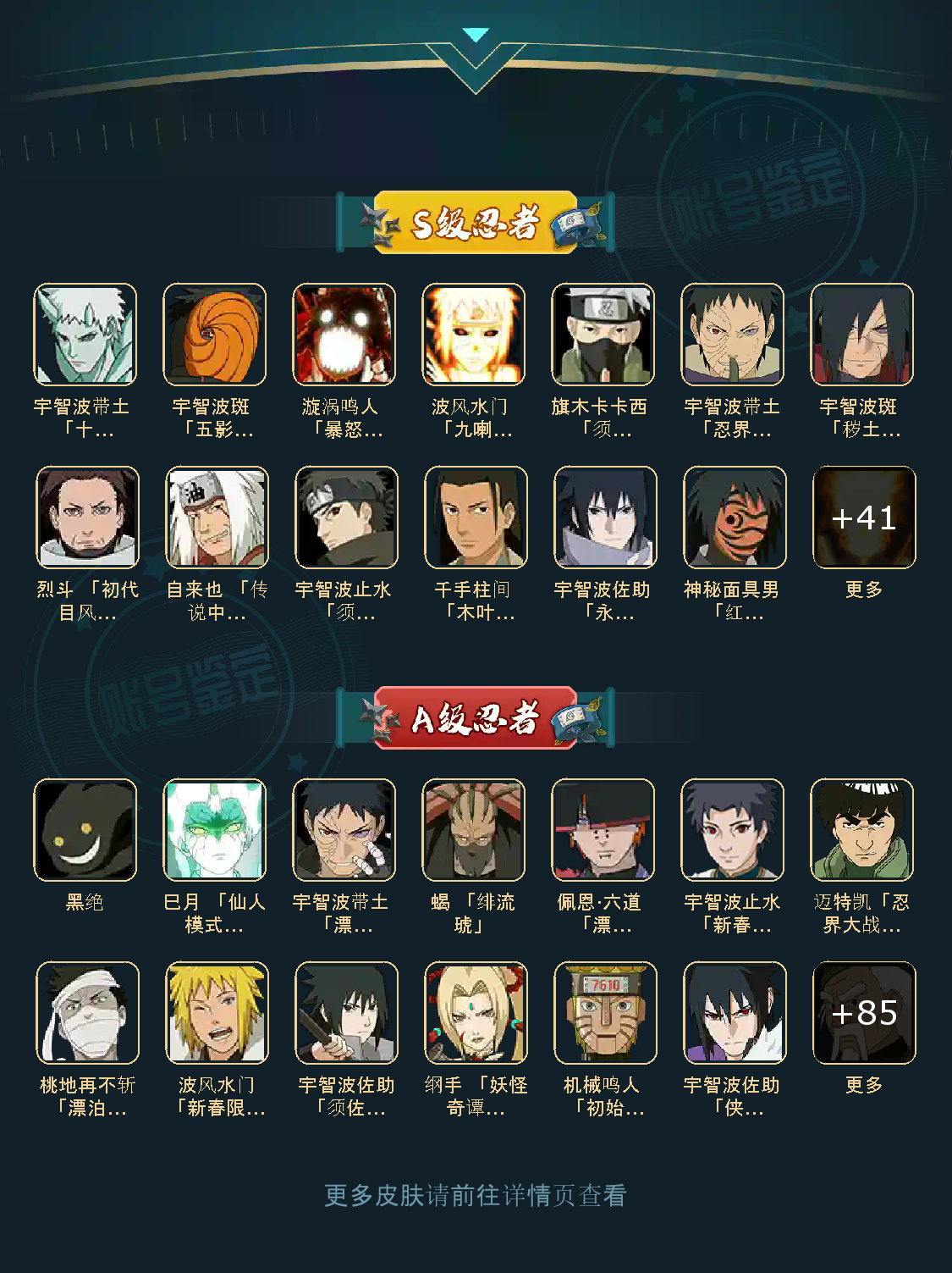仙人自来也 纲手 波风水门 百战水门 猿飞日斩 千手柱间 宇智波斑 宇智波鼬 舞之自来也 大蛇丸 百战大蛇 秽土四代 秽土三代 秽土长门 仙人兜 黄猿九喇嘛鸣人 紫狗永恒佐助 樱婊忍战樱 秽土鼬 普通自来也 百豪纲手 死门凯 二代扉间 秽土二代 秽土初代 秽土柱间 白面具 须佐卡卡西 小胡子鬼灯幻月 雷影 土影 无 佩恩 百战佩恩 青年柱间 创立初代 秽土斑 青年斑 解斑 须佐止水 虎皮 破面带土 红夜带土 罗砂 秽土三代风影 忍战雷影 三代雷影 金角银角 秽土半藏 忍战大野木 小土豆 天道超 大筒木桃式 大筒木金式 钢铁之躯凯 桀骜之刃阿斯玛 狂野之鲨鬼鲛 飞段 黑飞段 百豪樱 忍战李 大卡卡西 五代水影照美冥 宇智波鼬 仙鸣 九尾查克拉鸣人 鹰佐 奇拉比 青年艾 半蛇兜 晓蛇 新春鼬 面麻 须佐佐助 疾风咒印佐助 忍战宁次 忍战天天 最终章雏田 幻容卡卡西 神卡 忍战卡卡西 泳装卡卡西 忍战凯 青春哥 惊门凯 爱情哥 新春止水 新春水门 青年水门 青水 新春我爱罗 泳装照美冥 侠隐照美冥 侠隐纲手 侠隐兜 漂泊再不斩 漂泊佩恩 漂泊二代 漂泊小南 漂泊佩恩 三船 青年三船 青年长门 泳装南 新春南 黑绝 新春大蛇丸 晓创生角度 晓创生蝎 晓创生飞段 泳装鼬 鲛肌融合鬼鲛 新春迪达拉 秽土迪达拉 恶灵之影飞段 暴怒带土 忍战黄土 卑留呼 桃博 黑土