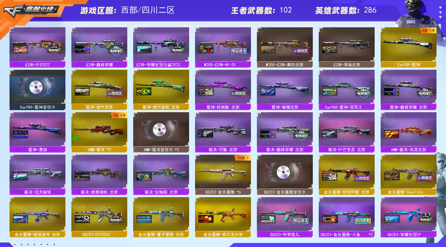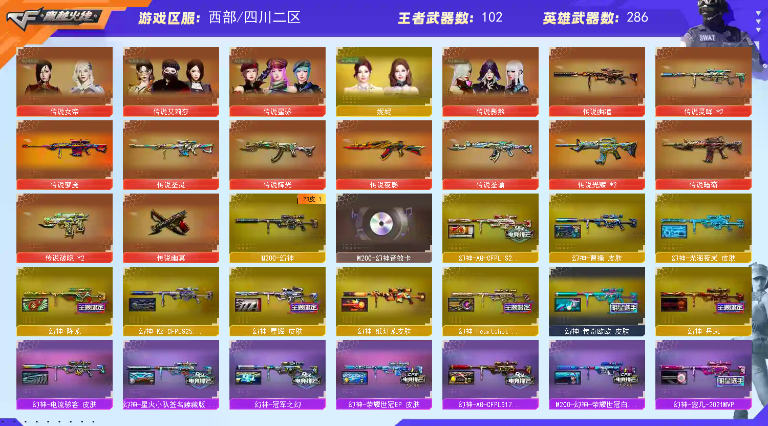 【超核收藏玩家】神豪毕业号,6年所有活动都打穿!爆破生化挑战全装。拥有皮肤292个,占比98%以上!幻神22皮无重复,荣耀之魄CFPL十周年臻藏版,满传说武器、满传说角色,序列号光耀9999,满虎牙,满斗鱼,冠军系列满皮,CFS系列满皮,CFPL满皮,HeartShot满皮,巅峰荣耀满皮,五虎将满皮,荣耀世冠满皮,MVP明星选手满皮。满常规音效卡,满战队背包、满战队击杀图标,角色174个,所有王者全激活。