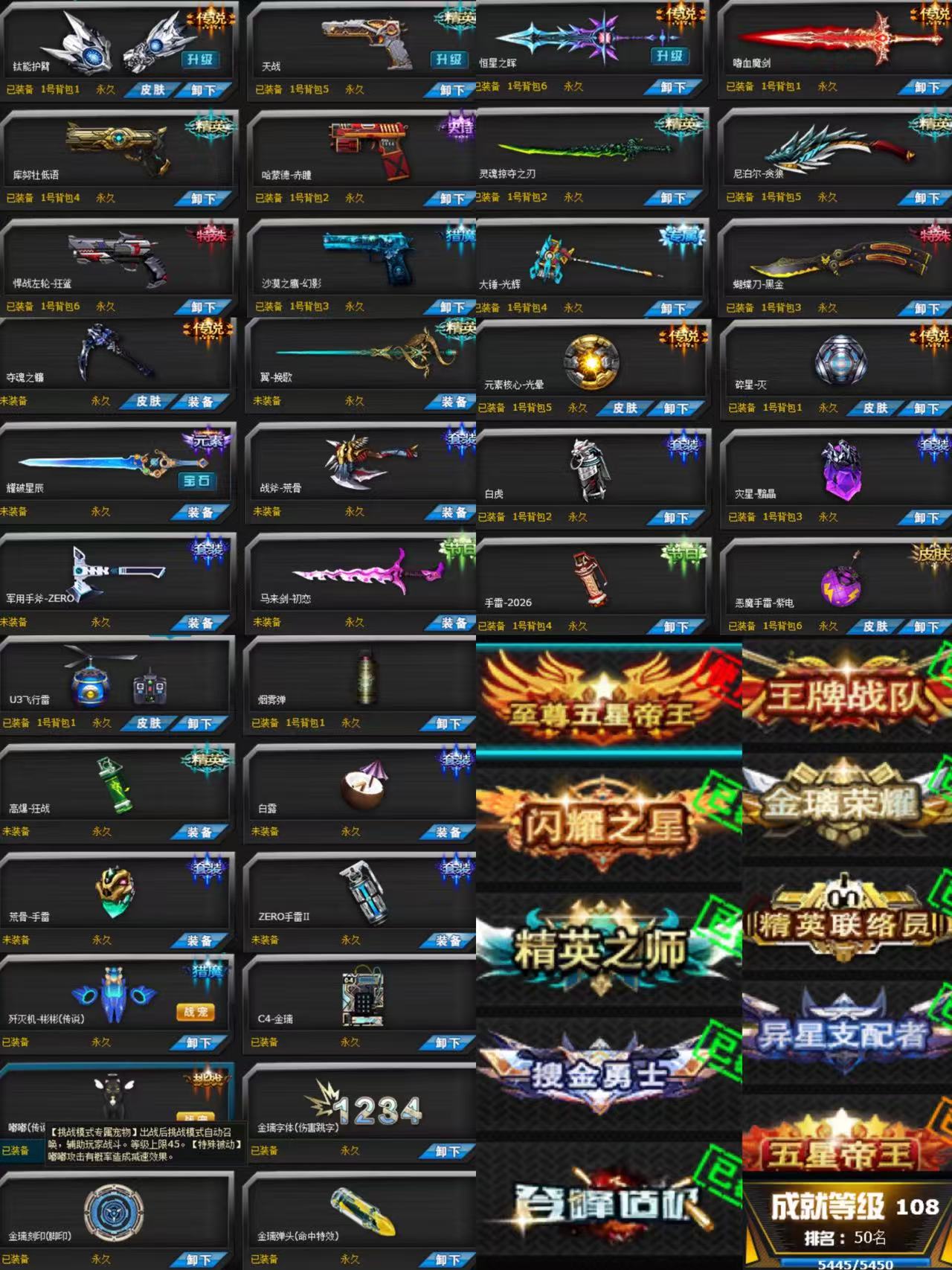 血清已开!精英之狮,至尊帝王号,图鉴354,李吒,亚瑟魔剑,成就108级,角色93级,22五星23精英,三切独角兽背包,巨蟹1,天秤一,真龙一!护臂一,卡牌套,幻魔,血与光,碎星,光晕,鎏金,黑曜科技,小飞机,变羊枪,变异体女王,蜘蛛,辛达,阿塔克,英雄阿巴顿,怀旧老角色都有,雷神之怒!欺霜!蝴蝶刀!灭世全系列!(怀旧生化,无限火力,竞技,挑战)