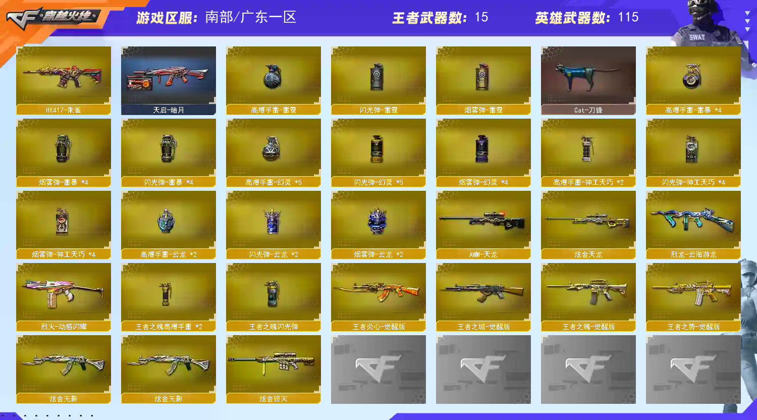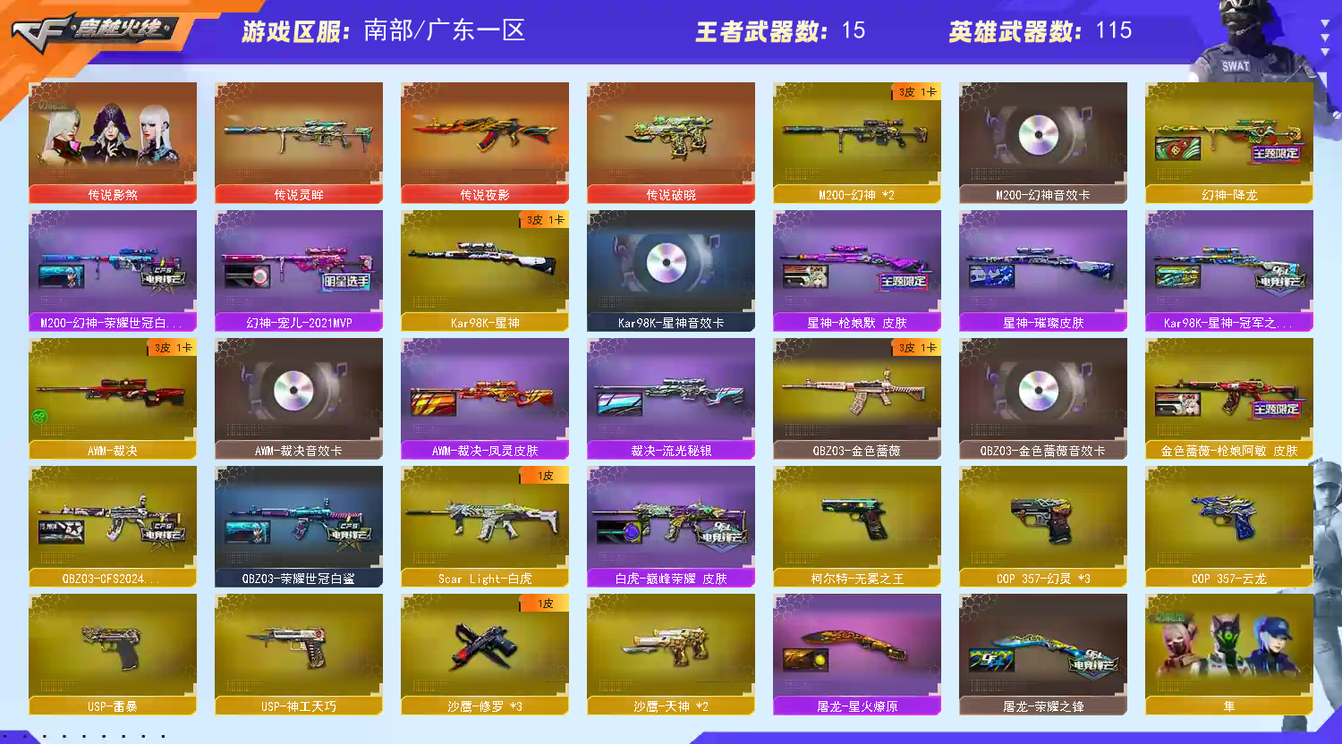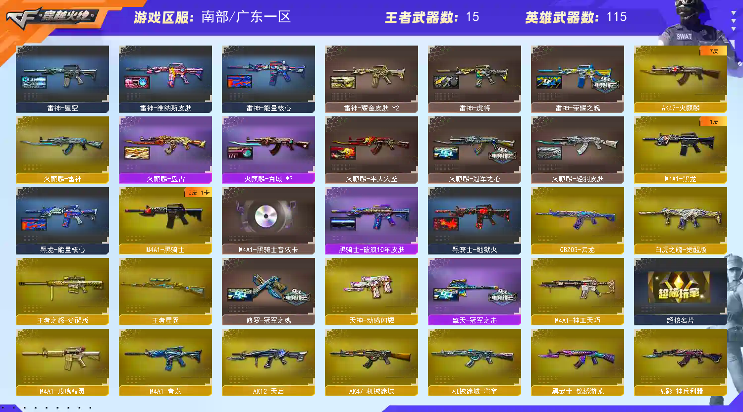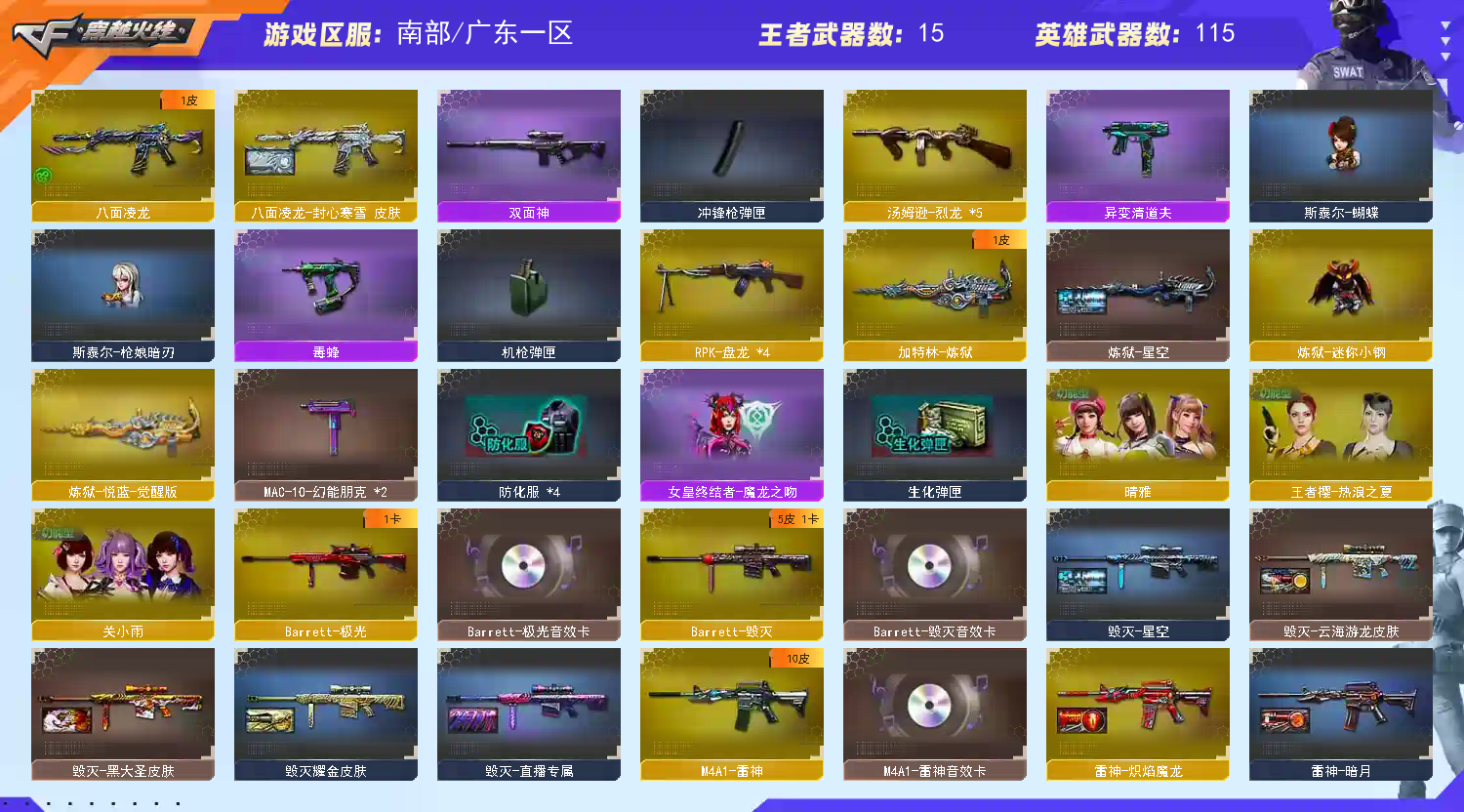 多四防角色,各种皮肤武器光效玩偶道具,欢迎来体验!武器太多,截不了那么多图!【此号全部装备太多截不了太多图,还有很多神器未截图,普通CF点武器也是一百多个就不截图了(满背包满道具爆破、生化、挑战武器应有尽有多个玩偶主流武器多光效),主流枪械都有皮肤】