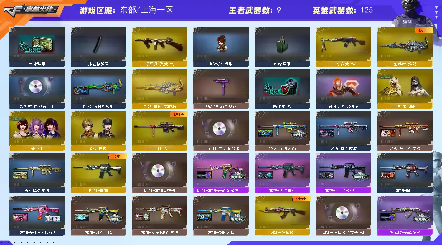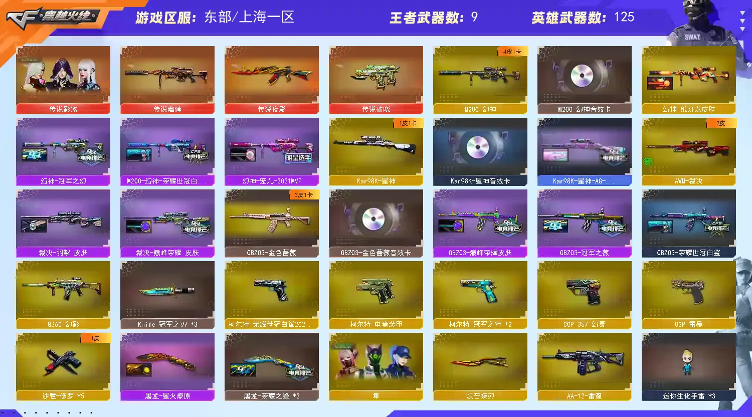 【亮点解析 四防传说角色 幻神三件套 98k星神三件套 生化烈龙+蝴蝶+蝴蝶刀+四防影煞 生化爆破号】 【四防传说影煞】 【传说幽瞳】 【M200-幻神+音效卡+纸灯龙+幻神-宠儿+幻神-冠军之幻+荣耀世冠白鲨】 【98k星神+音效卡+ag21冠军】 【王者星霆】 【王者风神】 【传说夜影】 【g36c幻影】 【传说破晓】 【qbz金色蔷薇+音效卡+巅峰荣耀+荣耀世冠白鲨】 【生化 6盘龙 2炼狱 6烈龙 蝴蝶】 【挑战 绝版擎天柱】 【裁决+巅峰荣耀】 【毁灭+音效卡+毁灭-荣耀之怒】 【火麒麟+音效卡巅峰荣耀】 【黑龙】 【雷神+音效卡+巅峰荣耀+雷神-lgd18冠军+雷神-宠儿+雷神-荣耀之魄+雷神-冠军之魄】 【黑骑士+音效卡】 【王者之怒】 【死神 黑武士 hk417-朱雀+音效卡】 【16手枪 修罗*5 天神 usp雷暴 cop幻灵 柯尔特荣耀世冠白鲨2023 冠军之特*2】 【20近战 冠军之刃*3 屠龙*7 龙啸 擎天 斩神刀雷暴 炽芒蝶刃蝴蝶刀 王者之锋*2 王者云击】 【手雷 雷霆雷 雷暴雷*4 电竞装甲*2 幻灵雷*5 云龙雷*2】 【四防 隼 王者葵貂蝉】