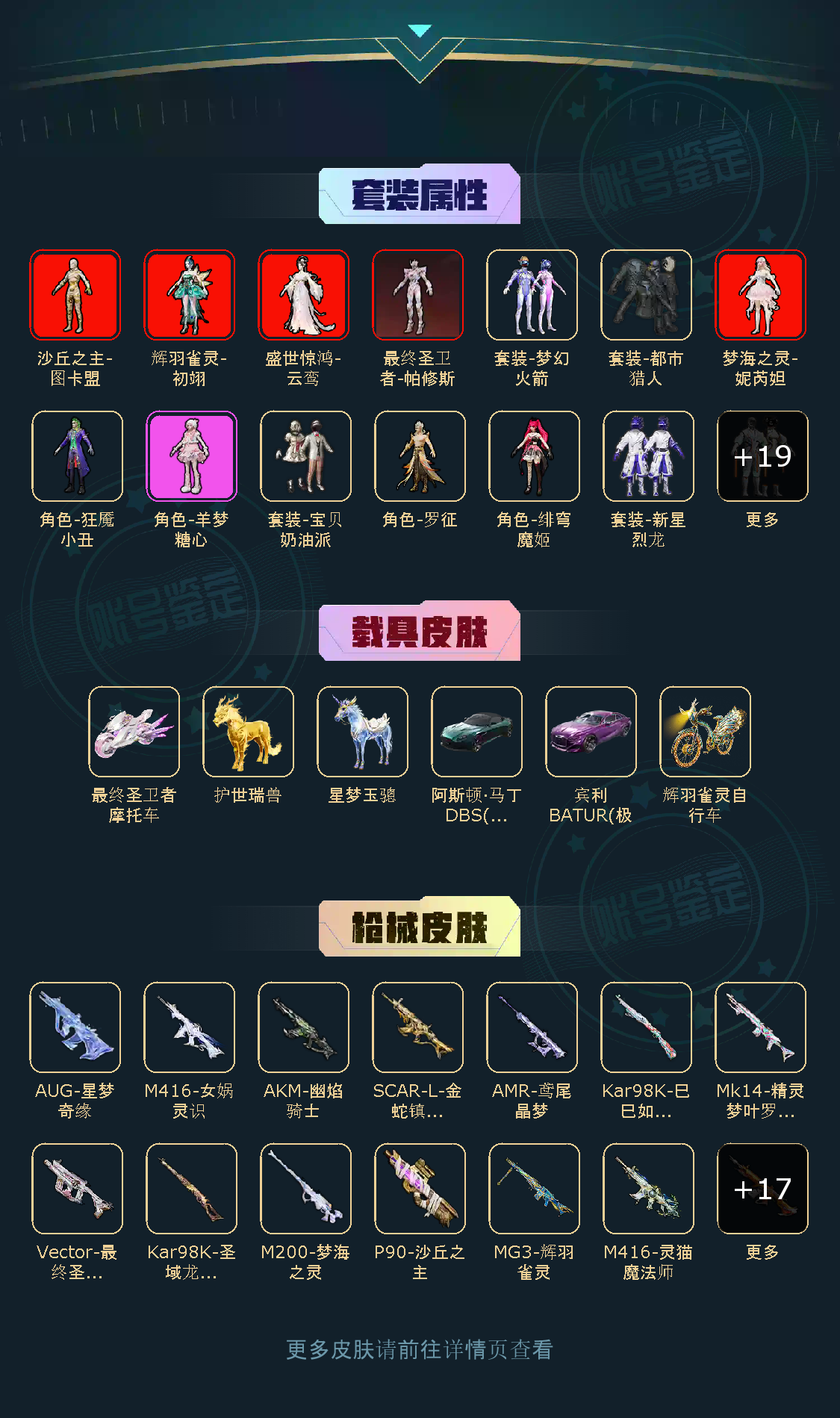🈵级星梦奇缘AUG 7级灵猫M4 6级金蛇6级幽焰5级圣卫🔥5红装 3级图卡盟 29特25粉6车 12把计数枪 30粉,6载具,208套装,16王牌印记,卓越王牌16星历史最高段,145598热力值 M416-灵猫魔法师/AUG-星梦奇缘/M416-电玩时刻/GROZA-旋转彩虹/AKM-幽焰骑士/SCAR-L-纯梦嫁纱/AUG-圣斗士星矢/M416-女娲灵识/M416-墨龙九天/M762-冷魅冰骑/M416-至情至圣/SCAR-L-金蛇镇世/AKM-星际浪客/AUG-超新星/Mk14-精灵梦叶罗丽/MG3-辉羽雀灵/MG-36-沧焰双生/DP-28-豹影疾电/AKS-74U-信仰神谕/Vector-最终圣卫者/野牛-青空秋雨/P90-沙丘之主/UMP45-启明星/破片手榴弹-热量炸弹/Kar98K-圣域龙灵/AWM-花间之火/AMR-鸢尾晶梦/Kar98K-巳巳如意/M200-梦海之灵/阿斯顿·马丁DBS(绿)/宾利BATUR(极速紫)/护世瑞兽/星梦玉骢/辉羽雀灵自行车/最终圣卫者摩托车/