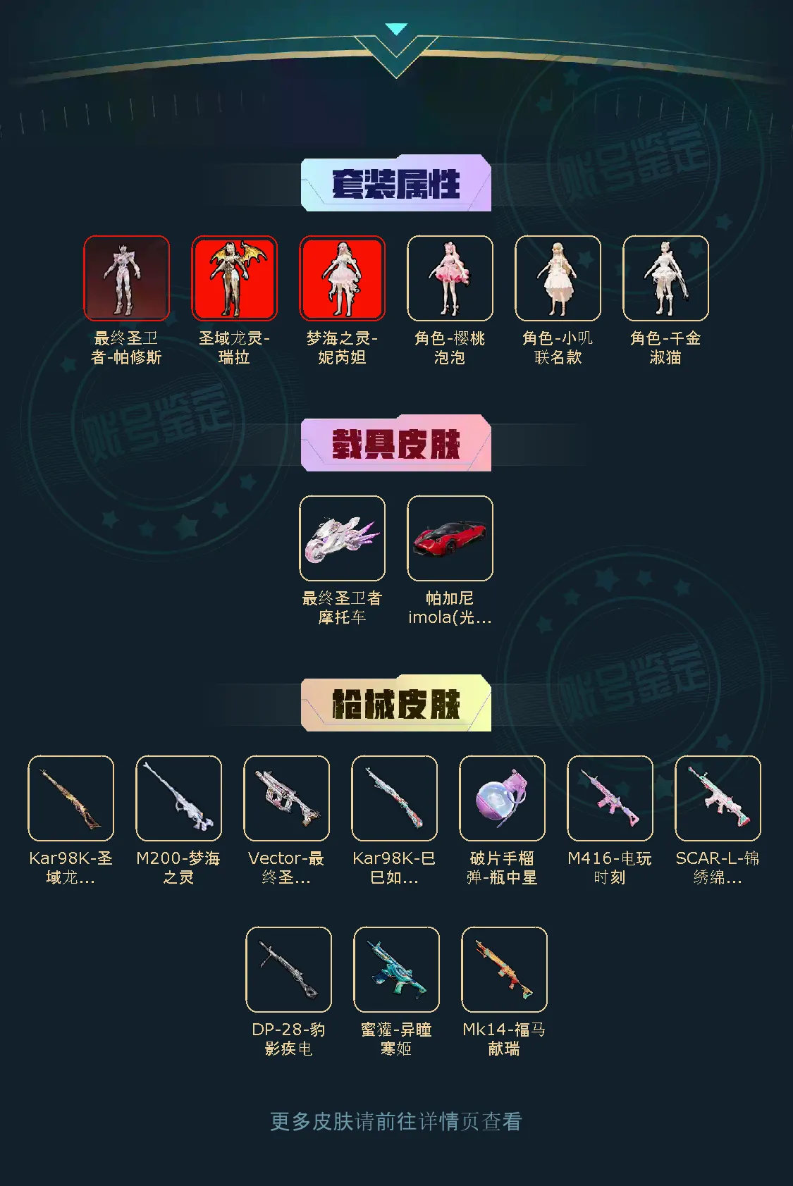 【粉色枪皮】蜜獾-异瞳寒姬/M416-电玩时刻/SCAR-L-锦绣绵绵/Kar98K-圣域龙灵/Kar98K-巳巳如意/M200-梦海之灵/Vector-最终圣卫者/DP-28-豹影疾电/破片手榴弹-瓶中星球