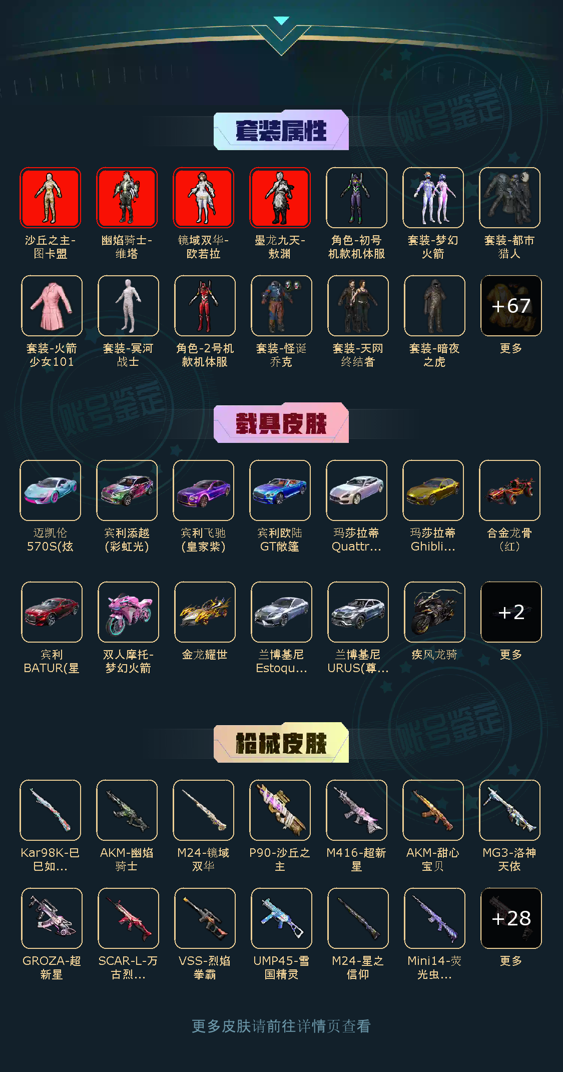 苹果V-4红装11稀有16载具67粉装40特效枪47热门380套装494枪皮 295539热力值 30印记 历史超级王牌22星 【4红装】 幽焰骑士-维塔 (1级) 墨龙九天-敖渊 (1级) 镜域双华-欧若拉 (1级) 沙丘之主-图卡盟 (2级) 【11稀有】 火箭少女101 木乃伊 奇异狩猎者 赤蝎幽灵 寒蝎幽灵 AWM-黄金龙骨 M416-星际漫游 都市猎人 派对舞王 天网终结者 派对舞王(金靴子) 【16载具】 宾利飞驰皇家紫 (4级) 宾利添越(彩虹光) (4级) 宾利欧陆GT深空蓝 (4级) 玛莎拉蒂Q幻星粉 (2级) 玛莎拉蒂金色 兰博轿车尊享铂 兰博SUV尊享铂 宾利BATUR(星火红) (2级) 迈凯伦570S炫冰蓝 (2级) 金龙耀世 合金龙骨红色 疾风龙骑 照夜玉狮子 双人摩托梦幻火箭 塞莎深潜蓝 (1级) 萌酷奶龙僚机 【67粉装】 红螳螂 紫螳螂 万古烈焰 圣堂之誓 梦幻火箭 蝶舞迷情 雪国幻梦 盖世英雄 水仙星 傲傲奶龙 宝贝奶油派 天使彩虹糖 甜心巧克力 洛天依 金风玉露 深海曼妙 月影灵韵 天星战神 炫光之旅 火曜朱雀 金曜白虎 怪诞乔克 冰炎战车 守护骑士 深渊皇后 双面双生 白勺歌姬 双星鱼跃 紫钛骑兵 射星猎手 室女星神 闲梦青缨 宙之时溯 星云暗核 金属狂野 静灵氛围 垂柳戏鸭 缤纷油彩 放客神游 莲影清波 牧神之羯 快乐主宰 荒野猎神 PEL轰鸣竞梦者 星之信仰 数码大师 极限特训 未来战士 麻辣鲜香锅 第五大道 极致幻想 锦绣火鲤 迷蝶贵族 暗夜鎏金 香水柠檬 翡翠骑士 绚金战神 童趣迷兔 冰霜白皇 炙焰红王 暗翼战神 星之彼岸 紫电风暴 赤焰黑爵 沙场疾风 天之羽翼 蓝莓炮弹 【40特效枪】 SCAR-L-梦幻火箭 (1级) M416-五爪金龙 (1级) SCAR-L-万古烈焰 (8级) M416-心之恋语 (1级) M416-墨龙九天 (1级) M416-超新星 (7级) AKM-熔岩统帅 (1级) P90-沙丘之主 (3级) AKM-甜心宝贝 (2级) M24-星之信仰 (1级) AKM-幽焰骑士 (7级) UMP45-雪国精灵 (6级) Kar98K-巳巳如意 (5级) Kar98K-伏魔团 (1级) M762-甜蜜誓约 (1级) DP-28-豹影疾电 (5级) PKM-天星战神 (4级) AWM-花间之火 (5级) AUG-超新星 (4级) Mini14-荧光虫舞 (7级) Mk14-闲梦青缨 (5级) AMR-智耀战神 (5级) AMR-炫光之旅 (1级) M24-镜域双华 (3级) GROZA-香水柠檬 (4级) SCAR-L-童趣迷兔 (1级) AUG-星之彼岸 (1级) DP-28-圣堂之誓 (4级) AKM-梦之光华 (1级) 汤姆逊-冰川粉黛 (4级) 野牛-青空秋雨 (4级) VSS-烈焰拳霸 (1级) GROZA-超新星 (8级) P90-粉樱探戈 (5级) M16A4-垂柳戏鸭 (1级) M762-冷魅冰骑 (1级) Vector-灵感创作师 (5级) MG3-洛神天依 (6级) M249-蓝莓炮弹 (1级) 平底锅-林间仙鹿 (5级) 【47热门】 奇迹天团 龟仙人 星光纪元 暗夜之虎 太空漫步 雪山精英 东方飞龙 潮萌小黄鸭 爱崽白熊 梦魇先生 万圣娃娃 鹰眼刺客 软萌银虎 奇迹天团 黄金大亨 暗夜之虎 迅捷狂鲨 大橘为重 浪客战士 裁决冥王 神秘黑猫 暗夜契约 暗影哥特 SS1特训 团圆交子 瑞龙福将 纯白誓言 忍者信条 水银刺客 漫步者 冰爽海盐 韶华初心 影双刃 娴静芝兰 静谧青瓷 机械英豪 破蛋小黄鸡 风华少年志 白月香洋装 软嫩糖心蛋 黑色刀锋 军刀雅典娜 弄潮海豚 M416-快乐主宰 M762-瑞龙福将 Kar98K-深海曼妙 M24-香水柠檬 【13飞行器】 龙翔九天飞行器 锦绣火鲤飞行器 心之恋语飞行翼 梦幻火箭飞行器 春暖花开飞行器 相思残雪飞行器 星之信仰飞行翼 深海曼妙飞行器 镜光幻境飞行翼 歌者泠鸢飞行器 千面幻镜飞行器 冷魅冰骑飞行器 PEL轰鸣竞梦者飞行器 【14头盔】 银河战甲头盔 梦幻火箭头盔 雪国精灵头盔 金曜白虎头盔 甜心宝贝头盔 百万伏特头盔 幻影战神头盔 金风玉露头盔 金属狂野头盔 静灵氛围头盔 缤纷油彩头盔 放客神游头盔 心之恋语头盔 花间之火头盔 【20背包】 梦幻火箭背包 雪国精灵背包 金曜白虎背包 甜心宝贝背包 百万伏特背包 幻影战神背包 金风玉露背包 金属狂野背包 静灵氛围背包 缤纷油彩背包 放客神游背包 萌熊伴侣背包 潮萌小黄鸭背包 深海曼妙背包 神秘黑猫背包 古堡领主背包 金羽特工背包 甜蜜誓约背包 心之恋语背包 花间之火背包 营地ID
