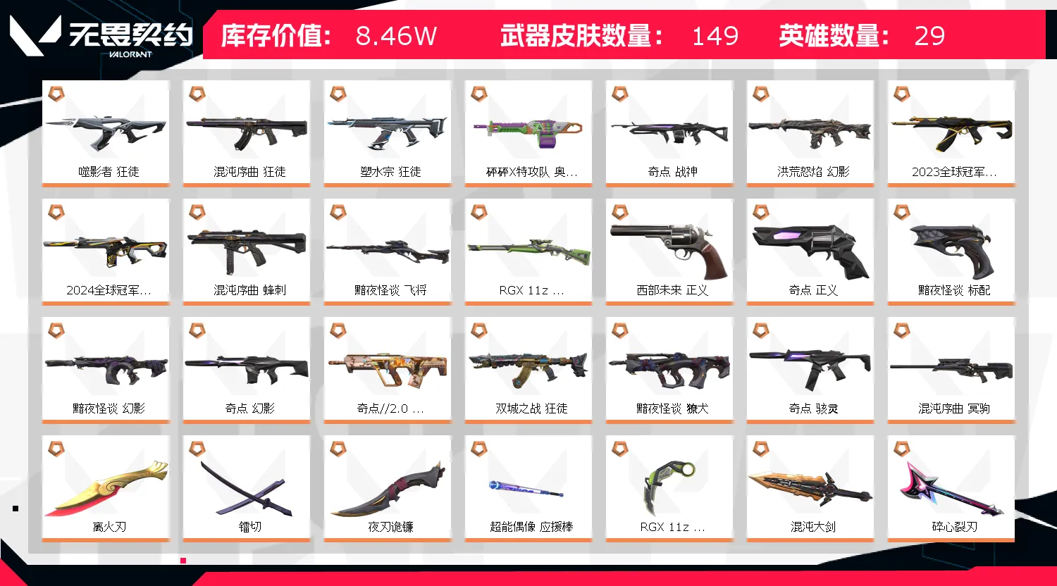 【当前段位:黄金II】8.5w库存|离火刃|24冠军套|奇点全套|黯夜套|混沌套|显卡3.0全套|23冠军ak|魔法棒|镭