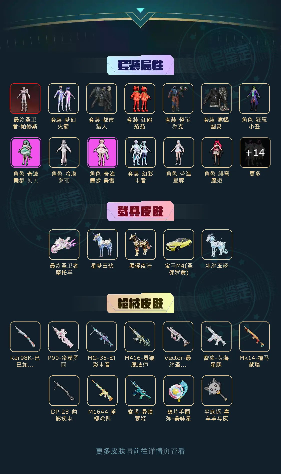 【稀有资产】最终圣卫者-帕修斯[3级]/套装-怪诞乔克/套装-甜梦小狐/破片手榴弹-美味星星糖/M416-灵猫魔法师/小丑红鼻头/套装-深海小丑鱼/套装-寒蝎幽灵/套装-都市猎人/套装-浪漫天命/套装-潮萌小黄鸭/套装-迅捷狂鲨/套装-糯粉咩咩/套装-兔兔白日梦/套装-荒原牛仔/套装-软软马卡龙/套装-红熊茄茄/套装-绒宝小鹅/套装-夜幕侵蚀/套装-墨青刃影/套装-圣穹绘梦/套装-次元竞界/套装-极光猎影/套装-香酥鲷鱼烧/套装-虚空漩涡/玩偶服-美羊羊/角色-六号稻草人/角色-灵公主/角色-时希公主/角色-乐音/信号枪-彩虹独角兽