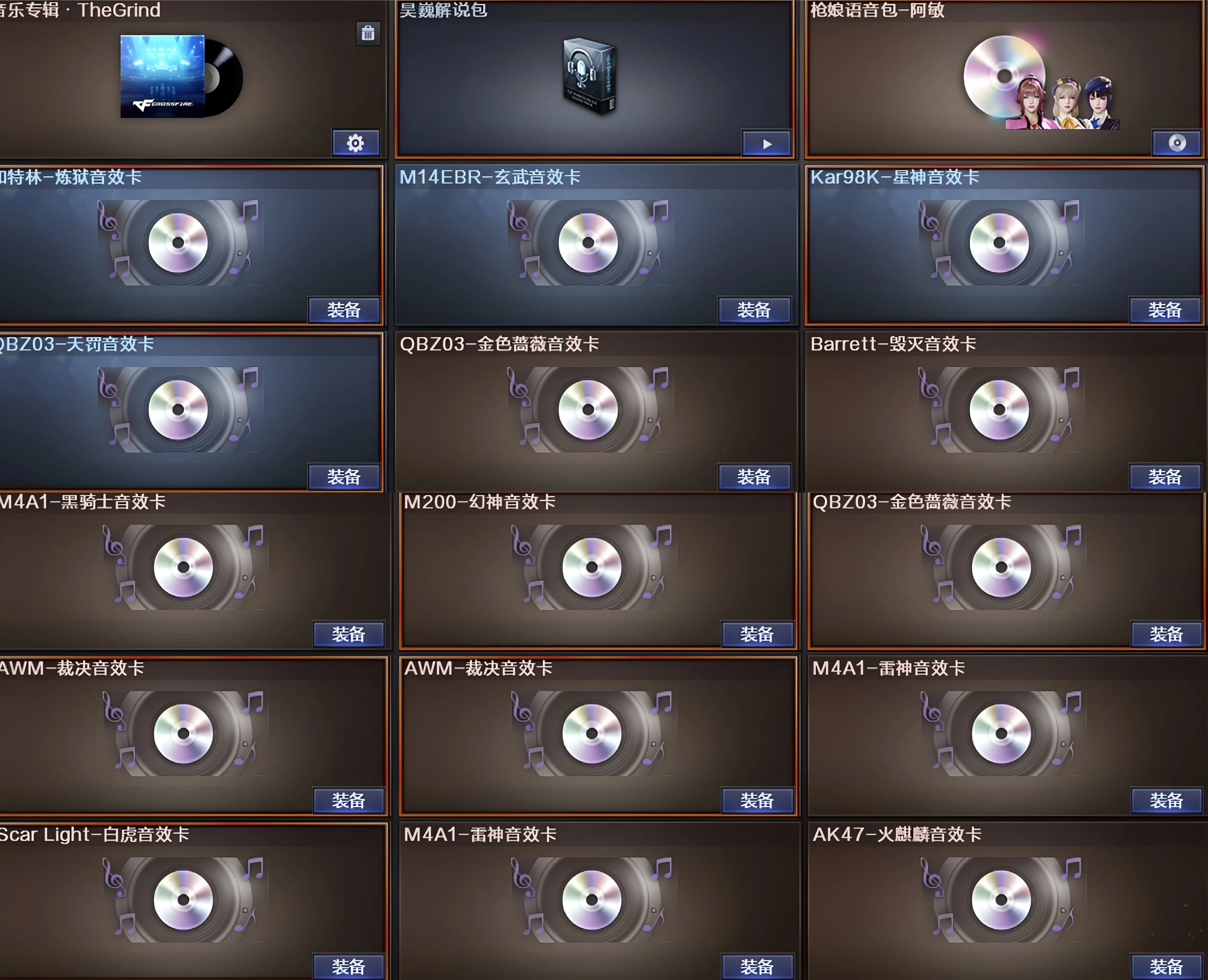 幻神音效卡,星神音效卡,白虎音效卡,金色蔷薇音效卡*2,天罚音效卡,毁灭音效卡,裁决音效卡*2,雷神,黑骑士,火麒麟,炼狱音效卡