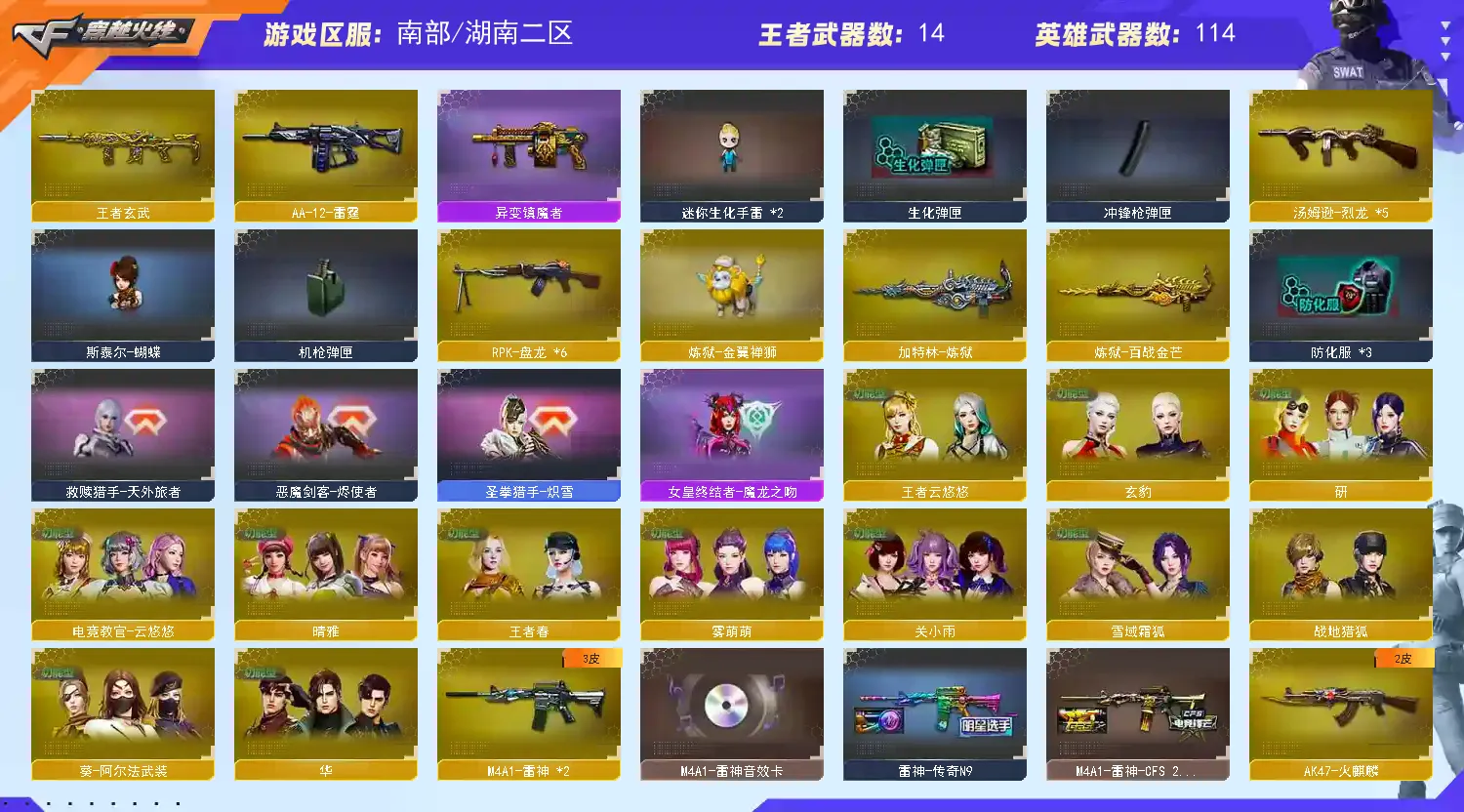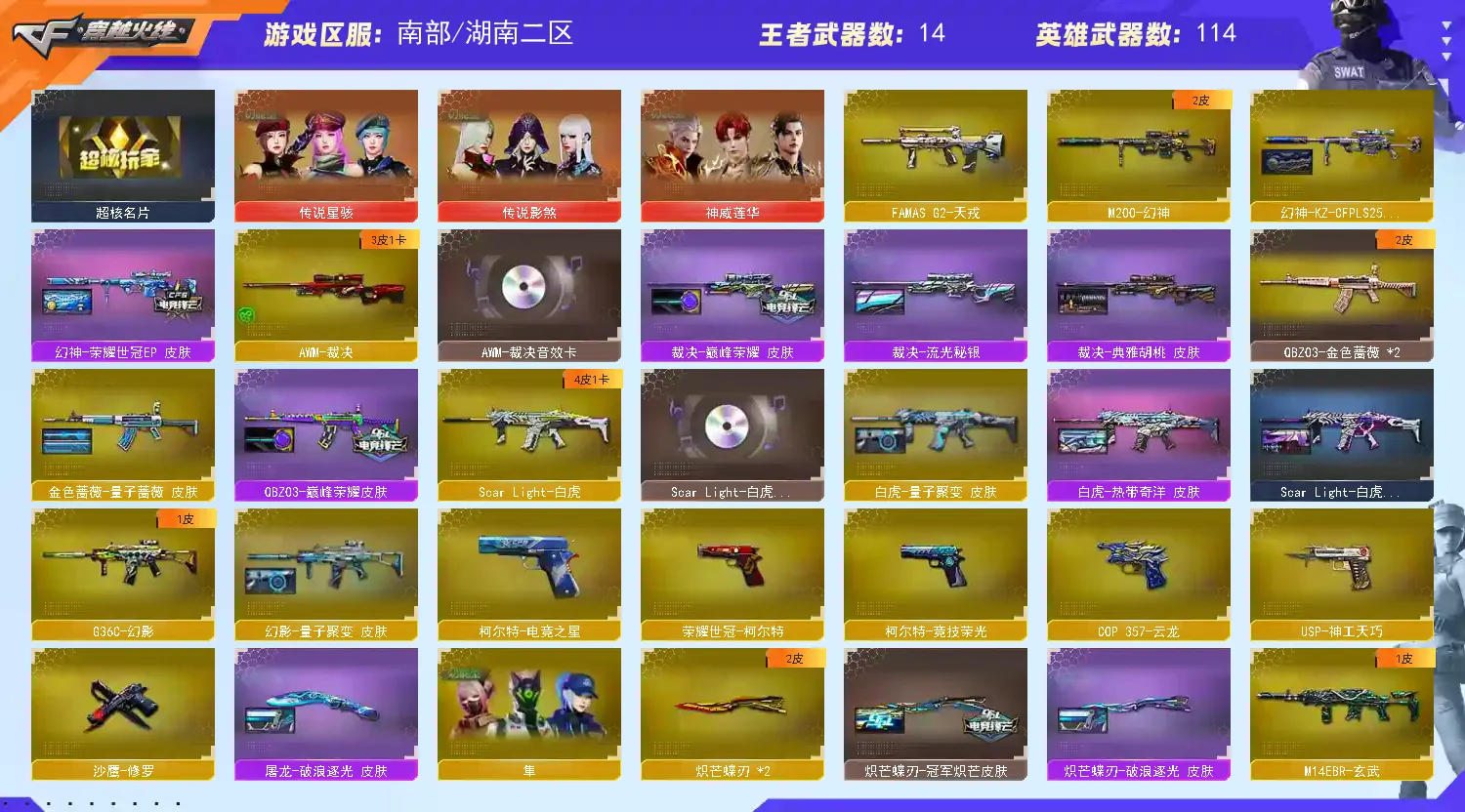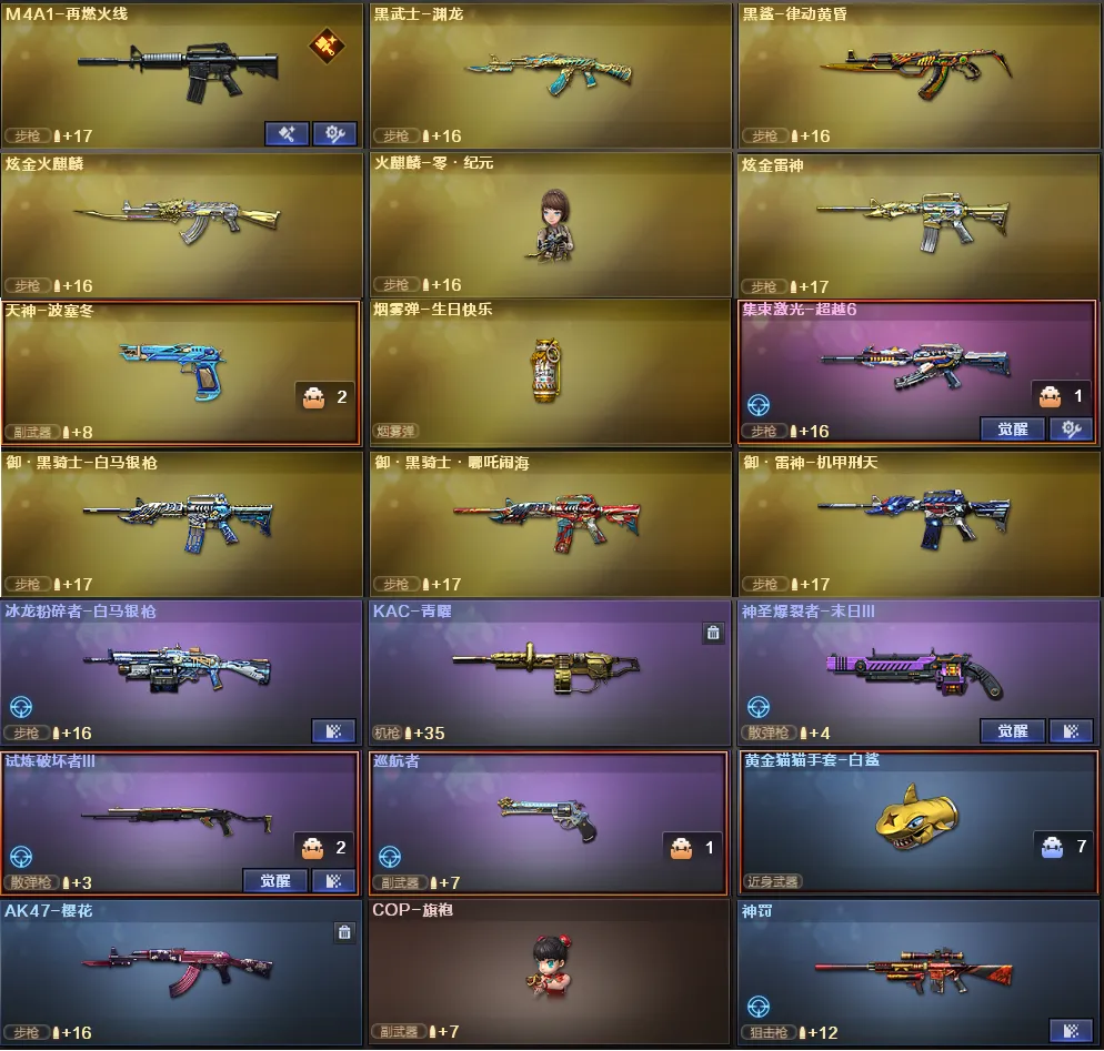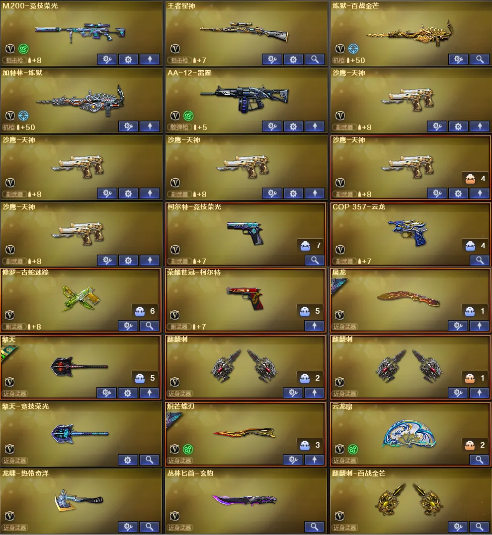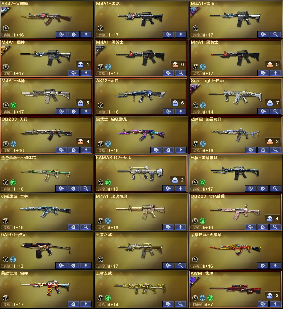 稀有武器:G36C幻影、FAMS G2天戎、M200幻神、M200竞技荣光、烈龙X5+斯泰尔蝴蝶、QBZ金色蔷薇、Scarlight白虎、QBZ天罚、炽芒蝶刃X2、荣耀世冠柯尔特、柯尔特电竞之星、荣耀世冠火麒麟、荣耀世冠雷神、神工天巧全套、火麒麟、黑龙、雷神X2、黑骑士X2、死神、天启、黑武士锦绣游龙、超新星热带奇洋、金色蔷薇古蛇迷踪、死神雪域霜狐、机械迷城穹宇、玫瑰精灵、9A91烈火、裁决、炼狱百战金芒、炼狱、A12雷霆、天神X2、柯尔特竞技荣光、COP云龙、修罗古蛇迷踪、屠龙、擎天、麒麟刺X2、擎天竞技荣光、云龙扇、龙啸热带奇洋、丛林匕首玄豹、麒麟刺百战金芒、荣耀世冠龙啸、M4赤狱骑士、M4苍鸣雷神、AK竞魂无影、Barrett碧霄极光、黑武士渊龙、黑鲨律动黄昏、天神波塞冬、集束激光-超越6、冰龙粉碎者-白马银枪、KAC青曜、神圣爆裂者-末日3、试炼破坏者3、巡航者、神罚