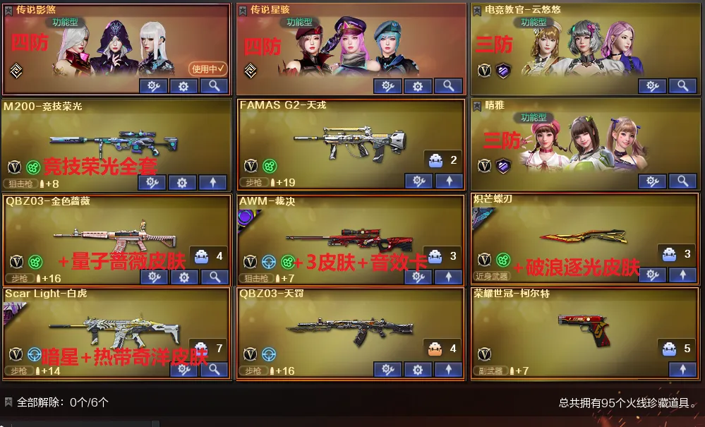 爆破性价比✅四防传说星骇影煞+法玛斯+带皮炽芒✅裁决4件套+QBZ量子蔷薇✅白虎双皮+天罚✅竞技荣光全套