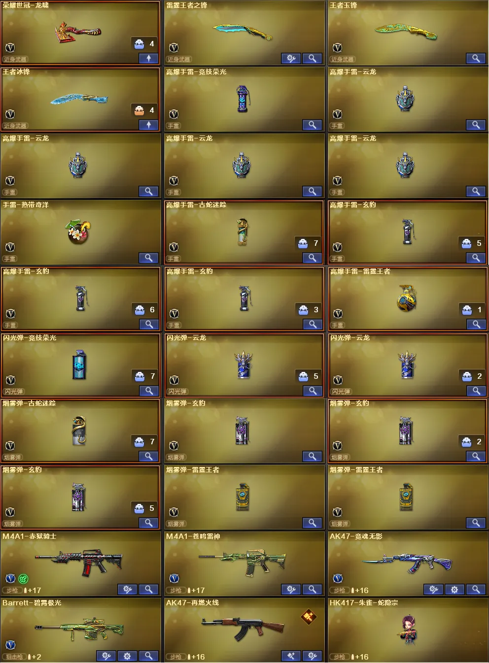 投掷套装:竞技荣光套、云龙套X4、玄豹套X6、雷霆王者套、手雷热带奇洋、高爆手雷古蛇迷踪、烟雾弹-生日快乐、音乐手雷