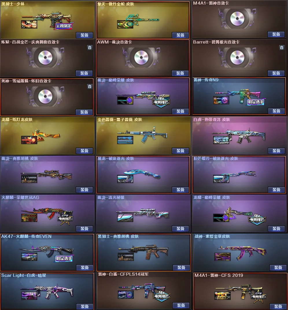 稀有皮肤:幻影量子聚变皮肤、炽芒蝶刃破浪逐光皮肤、金色蔷薇量子蔷薇皮肤、白虎量子聚变皮肤/暗星皮肤/热带奇洋皮肤、裁决典雅胡桃皮肤/流光秘银皮肤/巅峰荣耀皮肤、黑骑士少林皮肤/典雅胡桃皮肤、擎天傲竹皮肤、屠龙破浪逐光皮肤、火麒麟荣耀世冠AG皮肤/传奇EVEN皮肤、雷神传奇N9皮肤/白鲨-CFPLS14冠军皮肤/CFS2019皮肤