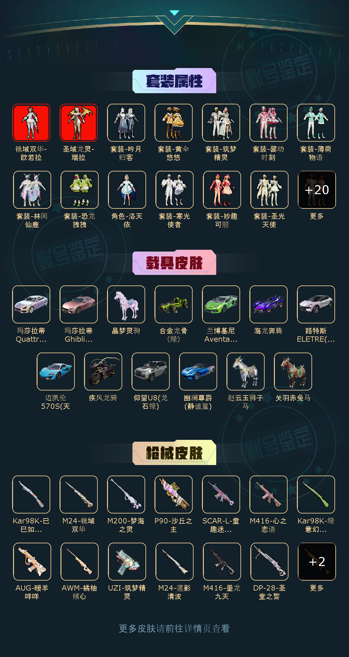 【稀有资产】镜域双华-欧若拉[4级]/圣域龙灵-瑞拉[2级]/玛莎拉蒂Quattroporte(幻星粉)[2级]/角色-小叽联名款/M416-心之恋语/AUG-暖羊咩咩/M416-墨龙九天/M416-风花雪月/角色-明日香款战斗服/套装-深海小丑鱼/套装-暗夜魅影/套装-粉红小猪/套装-龟仙人/套装-六号树人/套装-晶辉守护/套装-星兔领航员/套装-绒绒粉兔/玩偶服-美羊羊/角色-都市丽猫/角色-冰公主/大砍刀-青龙偃月刀/撬棍-龙胆亮银枪