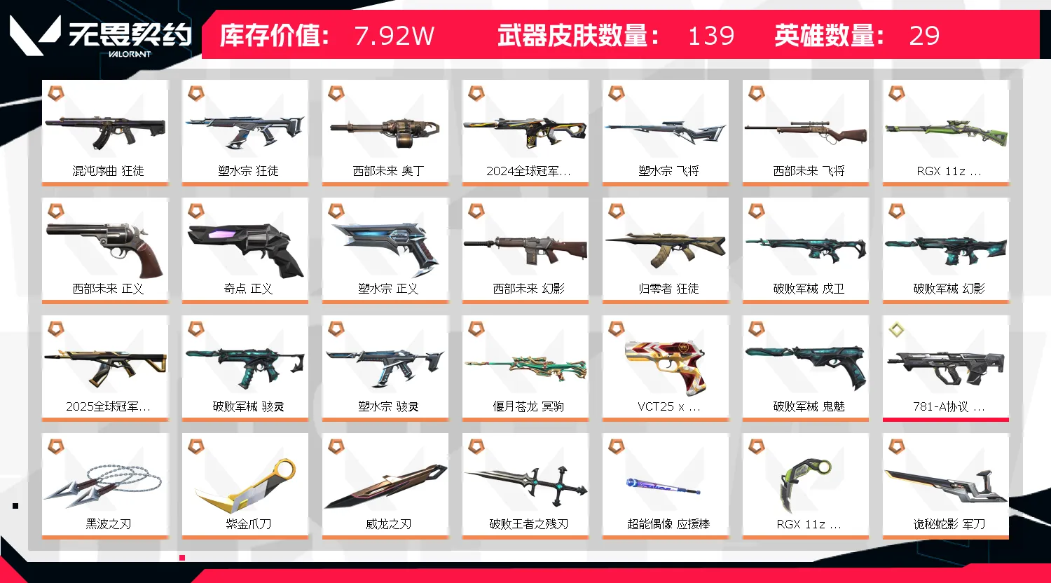 【当前段位:黄金I】8W精氪5套24冠军套25狂徒✨极品显卡紫金爪黑波威龙刃✨盖亚混沌塑水掠影紫阙归零者离子2✨侦查幻影