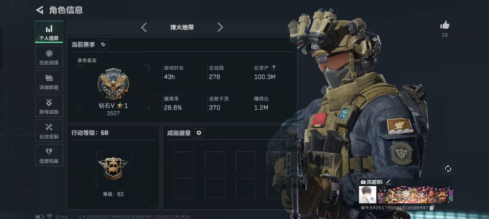 - 烽火地带段位: 钻石