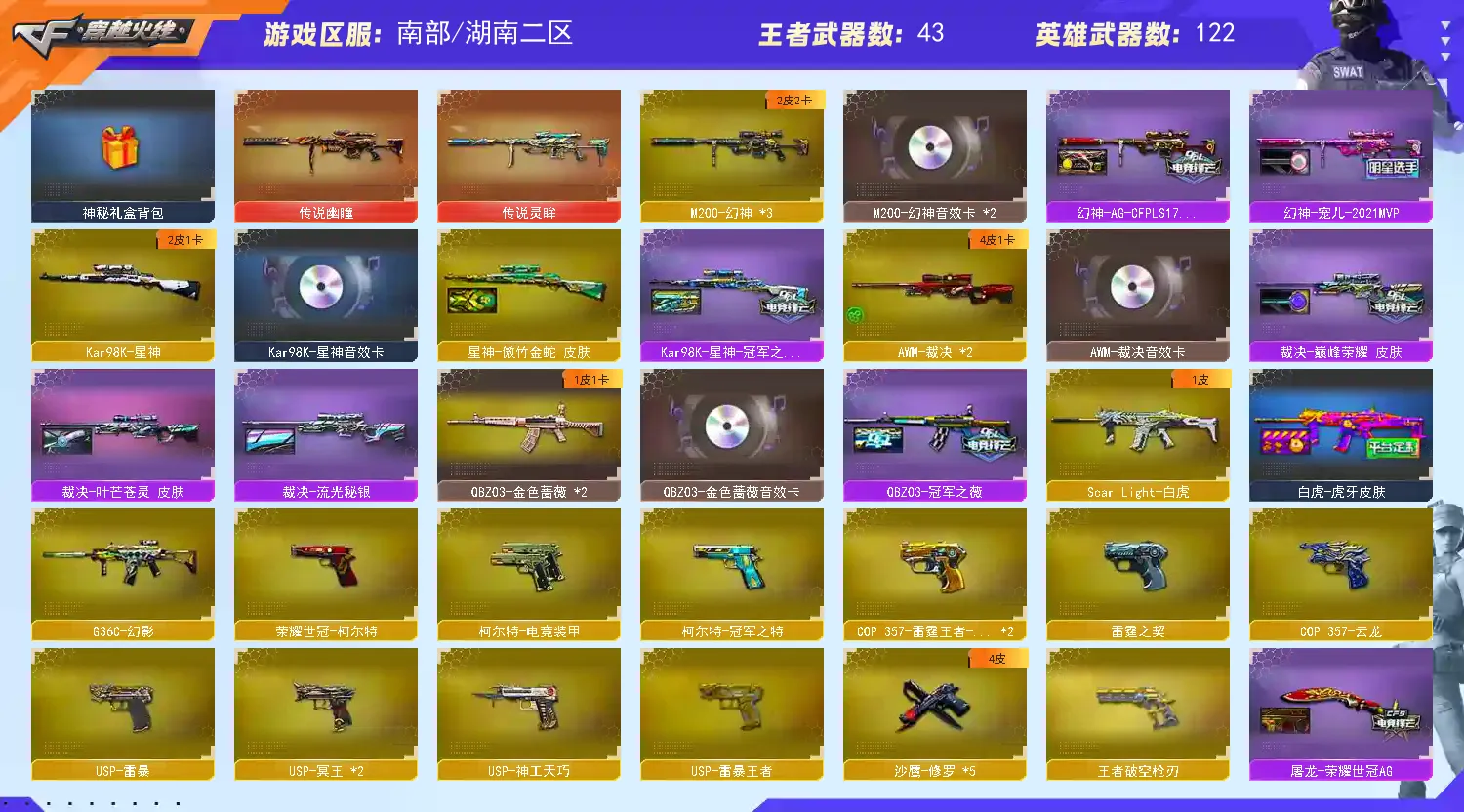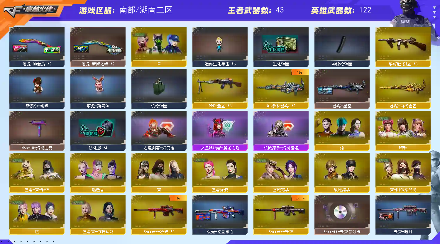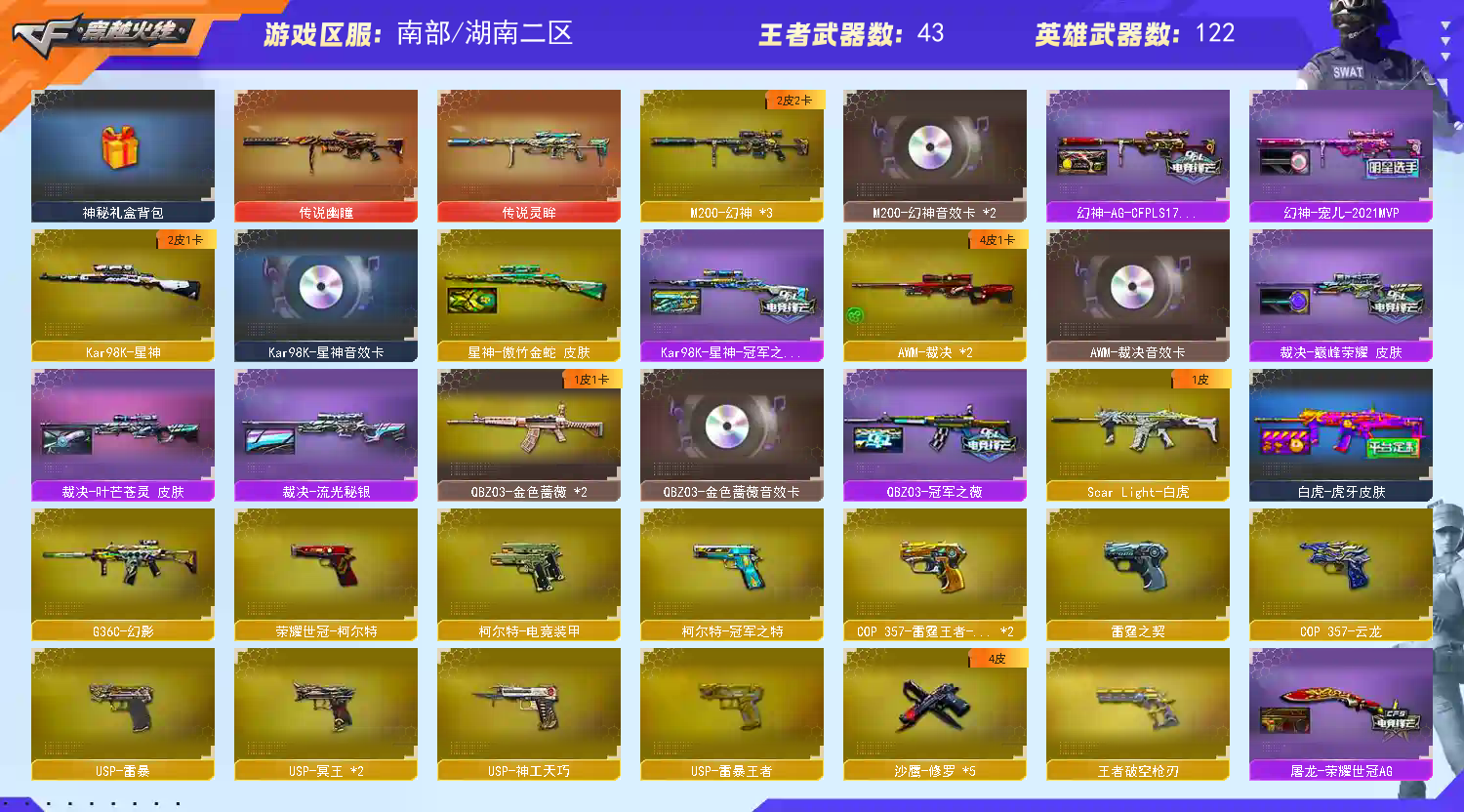 极品爆破生化号:传说灵眸、传说幽瞳、金色昵称字体、王者幻神、宠儿AG、冠军AG皮肤、3幻神双音效卡,王者破空枪刃(觉醒)、双usp冥王、双王者雷霆COP(觉醒,可配15发)、满配副武器,冠军之特、冠军之薇,6烈6盘双斯太尔小人枪,星神、裁决、QBZ金色蔷薇全部三件套,雷暴usp、王者猛虎、猫猫COP、白虎带虎牙皮肤、朱雀鹰隼晴雅等等。G36C幻影