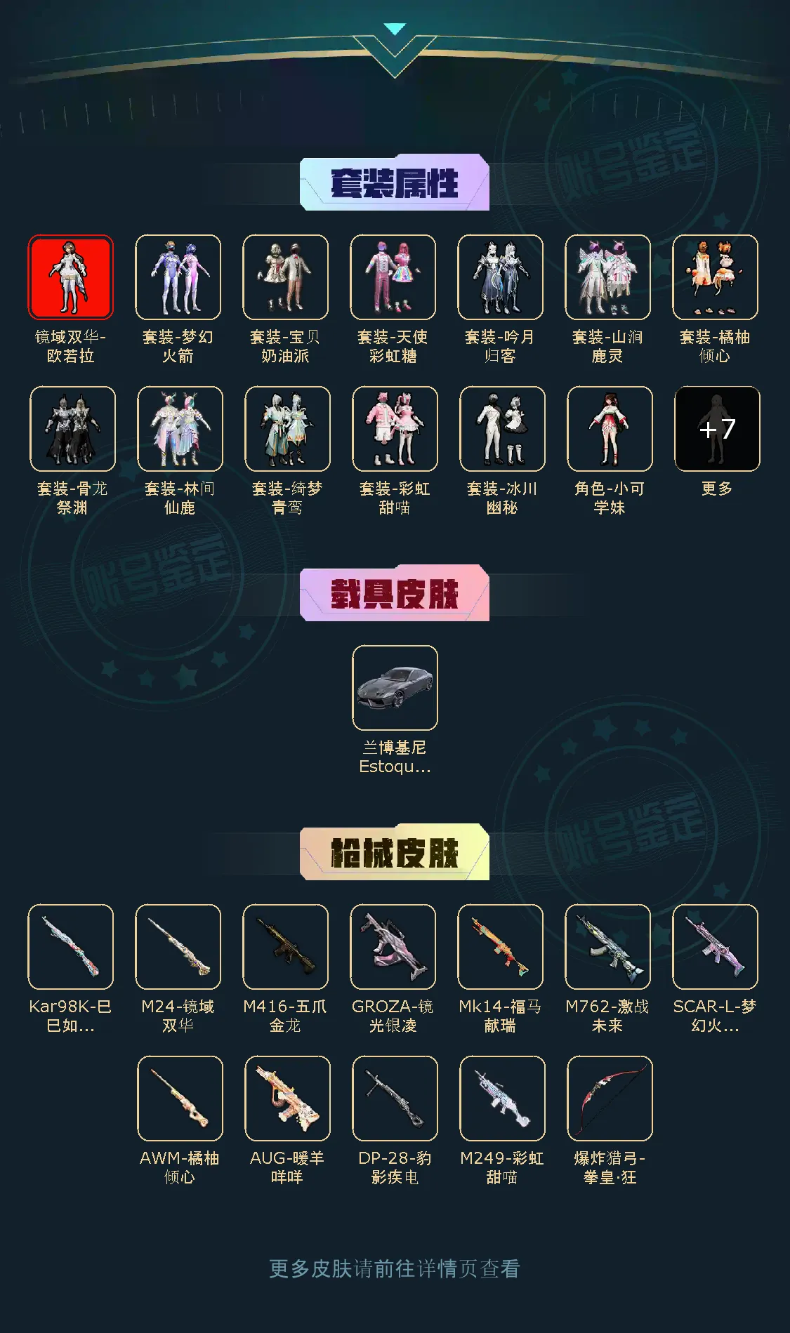 【稀有资产】镜域双华-欧若拉[3级]/套装-彩虹甜喵/角色-严莉莉/M416-五爪金龙/SCAR-L-梦幻火箭/AUG-暖羊咩咩/角色-8号机/角色-Mark.06/套装-粉红小猪/套装-浪漫天命/套装-暗影哥特/套装-龟仙人/套装-浪漫波比/套装-狂沙舞者/套装-青涩年华/角色-绊爱/角色-都市丽猫/角色-2B战斗服款/角色-海琴烟