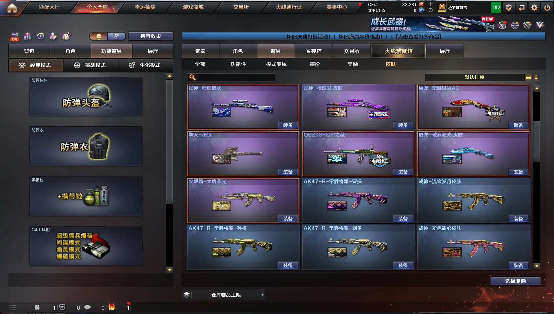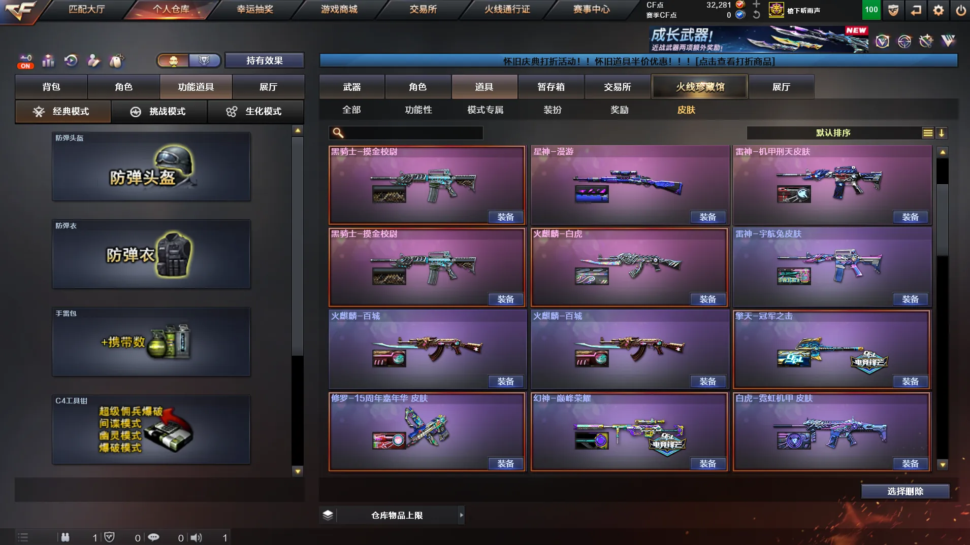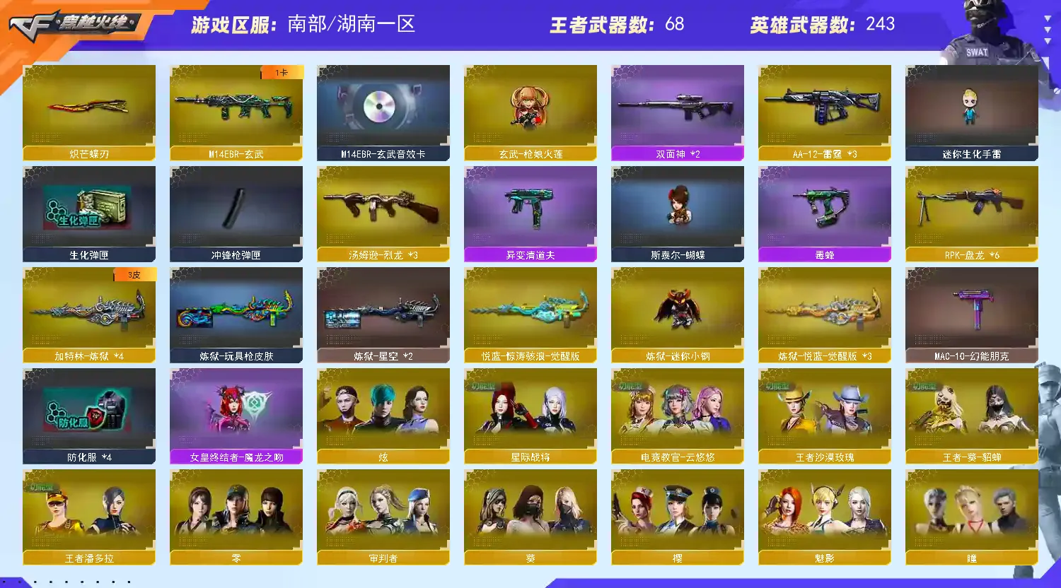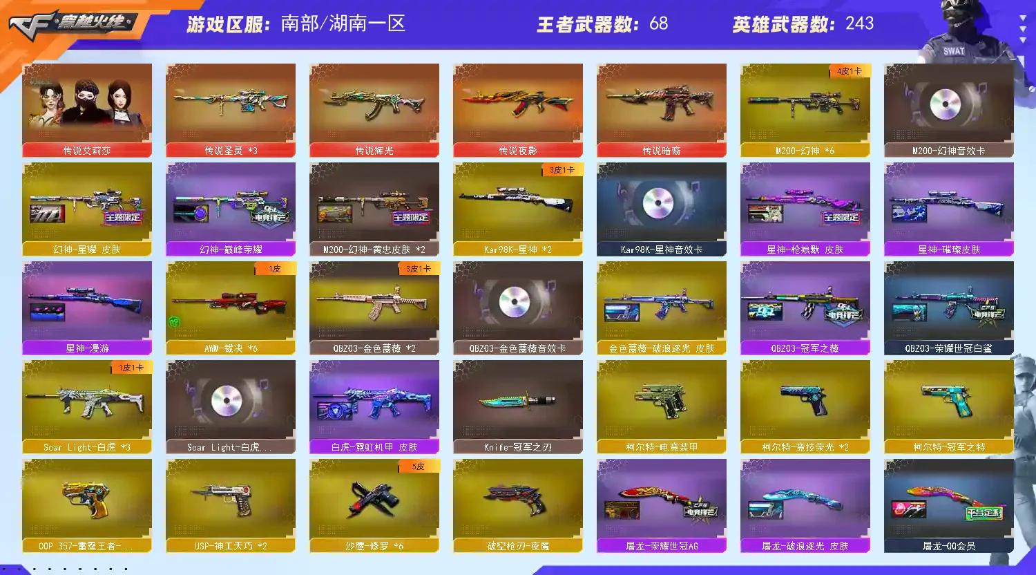南部天花板♥300V♥7传说♥6幻神♥星神三件套♥白虎三件套♥蔷薇三件套♥死亡蝴蝶毒蜂♥手枪齐♥装备多皮肤多