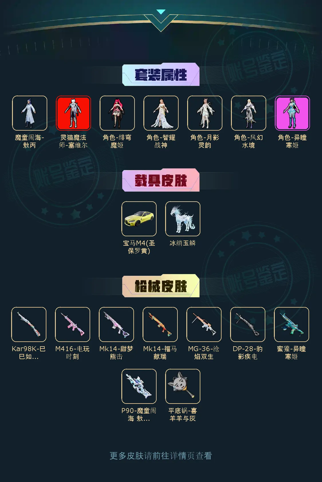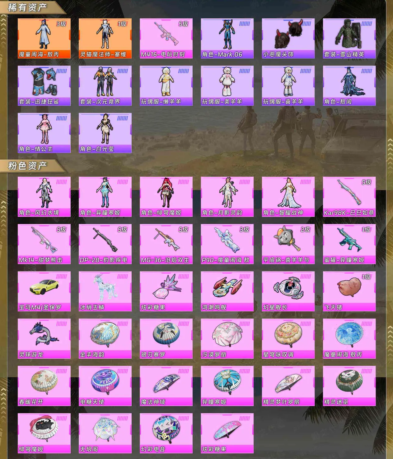 【稀有资产】角色-魔童闹海-敖丙[3级]/灵猫魔法师-塞维尔[1级]/M416-电玩时刻/角色-Mark.06/小恶魔头饰/套装-雪山精英/套装-迅捷狂鲨/套装-次元竞界/玩偶服-懒羊羊/玩偶服-美羊羊/玩偶服-喜羊羊/角色-敖闰/角色-情公主/角色-白光莹