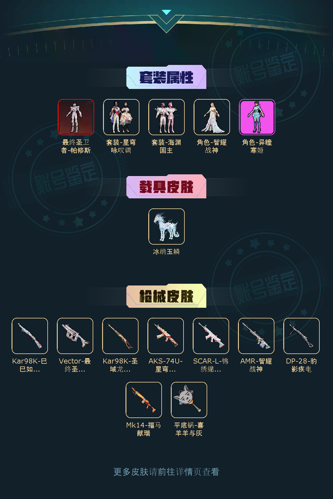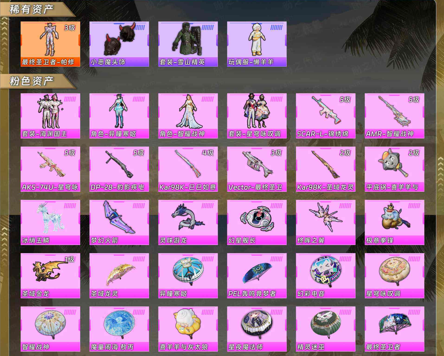 【粉色枪皮】SCAR-L-锦绣绵绵/AMR-智耀战神/AKS-74U-星穹咏叹调/DP-28-豹影疾电/Kar98K-巳巳如意/Vector-最终圣卫者/Kar98K-圣域龙灵/平底锅-喜羊羊与灰太狼