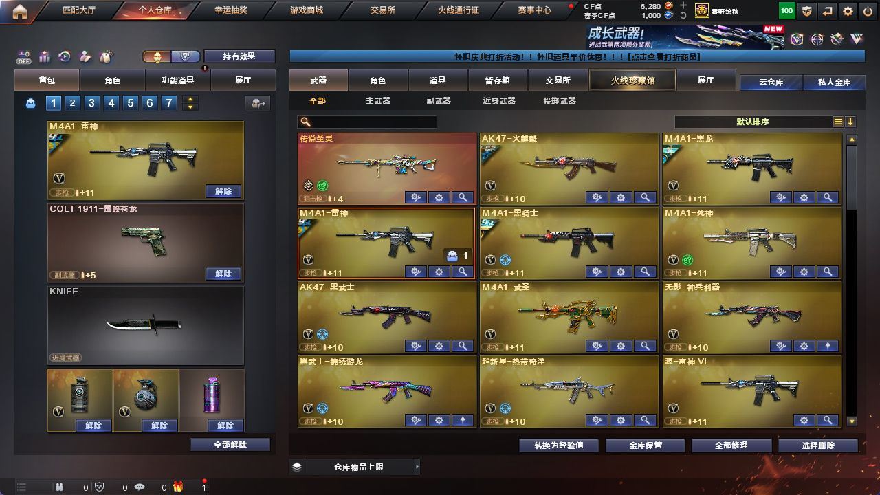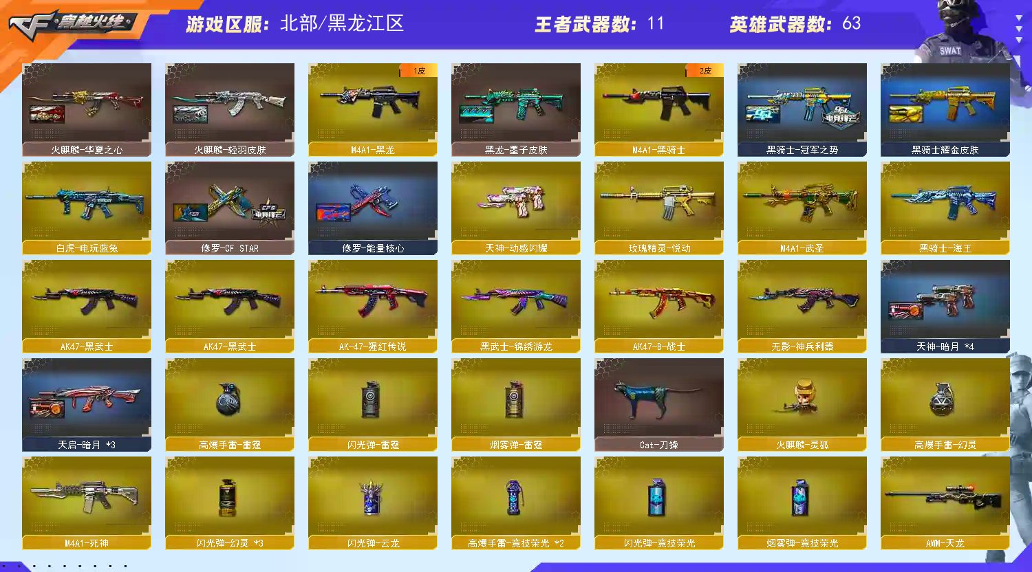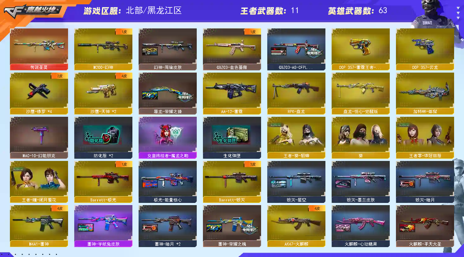 传说圣灵】【M200-幻神+幻神-周瑜皮肤+M200-幻神-动感闪耀音效】【白虎-电玩蓝图】【QBZ03-金色蔷薇+QBZ03-AG-CFPLS19冠军】【王者之势-觉醒版/王者之心-觉醒版】【COP 357-云龙/天神-动感闪耀/沙鹰-天神(2)/沙鹰-修罗(4)/Glock18-武圣/COP 357-雷霆王者】【麒麟刺/龙啸/龙啸-热带奇洋/龙啸-烈火龙威/擎天/擎天-云海游龙/屠龙(2)/屠龙-动感闪耀/雷霆之锋/马来剑-夜魔】【2盘龙/1烈龙/1炼狱】【王者之影/玫瑰精灵-悦动/王者玉锋】【葵/王者-葵-貂蝉/王者-瞳-闭月羞花/王者零-华冠丽服/奇洋探员/乔伊教练/云海玲珑/王者零-传说之路/幽/电竞少女/空/灵狐者-黄金海岸/初恋灵狐/飞虎队-X/斯沃特-X】【毁灭-星空/毁灭-墨兰皮肤/毁灭-暗月/极光-能量核心/火麒麟-AG战队皮肤/火麒麟-CFSTAR/火麒麟-华夏之心/火麒麟-平天大圣/火麒麟-心动糖果/火麒麟-轻羽皮肤/无影-暗月/雷神-荣耀之魄/雷神-宇航兔皮肤/雷神-暗月/黑骑士-冠军之势/黑骑士耀金皮肤/黑龙-墨子皮肤/黑龙-暗月/天启-暗月/战神-流金岁月皮肤/修罗-CFSTAR/修罗-能量核心/天神-暗月/麒麟刺-甜蜜糖果皮肤/屠龙-荣耀之锋】【Barrett-毁灭/Barrett-极光/AWM-天龙/M4A1-雷神/M4A1-死神/M4A1-黑龙/M4A1-黑骑士/黑骑士-海王/M4A1-武圣/AK47-火麒麟/无影-神兵利器/AK47-黑武士/AK-47-猩红传说/AK47-B-战士/烈火-动感闪耀/AA-12-雷霆/加特林-炼狱/超新星-热带奇洋/黑武士-锦绣游龙/烈龙-云海游龙】