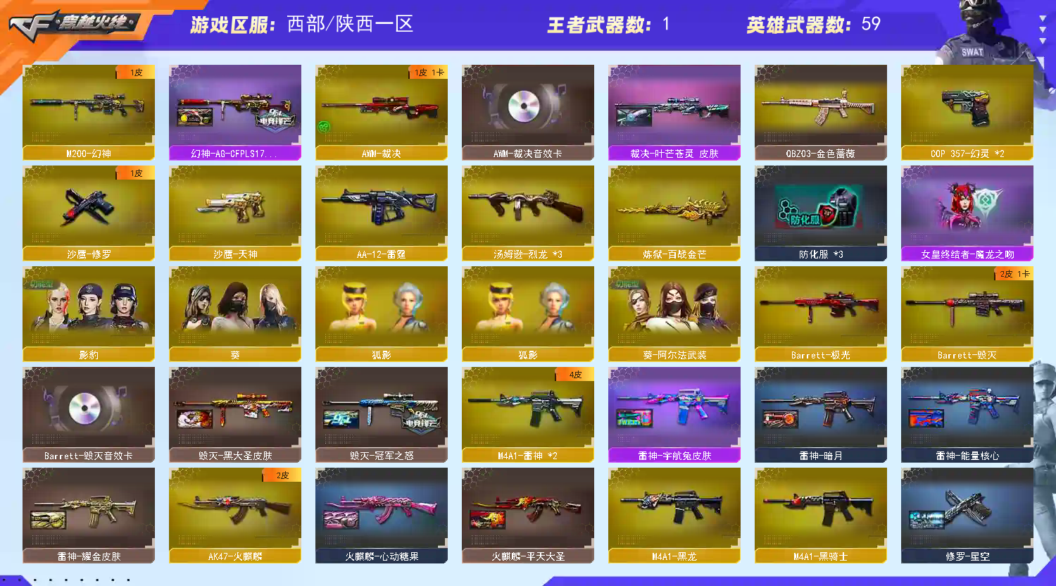 M200-幻神+幻神-AG-CFPLS17冠军皮肤,QBZ03-金色蔷薇,修罗-古蛇迷踪,死亡之眼*2,M4A1-黑骑士,汤姆逊-烈龙*3,雷神-小红,COP 357-幻灵*2,沙鹰-修罗【稀有套装】:幻灵套【音效卡】:Barrett-毁灭音效卡,AWM-裁决音效卡,Barrett-碧霄极光音效卡,炼狱-百战金芒-庆典舞曲音效卡【皮肤】:白虎-白鲨-CFPLS23冠军,裁决-叶芒苍灵 皮肤,雷神-暗月,雷神-能量核心,雷神-耀金皮肤,雷神-宇航兔皮肤,雷神-源计划2.0专属 皮肤,M4A1-再燃火线,火麒麟-平天大圣,火麒麟-心动糖果,毁灭-冠军之怒,毁灭-黑大圣皮肤,修罗-星空,轻型军用手斧-再燃火线【角色】:葵,影豹,狐影,蛇隐宗,乔伊教练,暗夜-X,风暴女*2,嘉年华灵狐,娟娟,灵狐者-X,潘多拉-X,蛇姬,斯沃特-X,铁骑荣耀,兔囡囡【人偶武器】:雷神-小红,海滩汪汪-巴雷特,夺魂,灵狐娃娃手雷【暴走生化】:死亡之眼*2【挑战大师】:激光毁灭者III,机甲撕裂者III*2【英雄级武器】:AK47-火麒麟,M4A1-黑龙,M4A1-雷神*2,M4A1-黑骑士,M4A1-幻灵,无影-神兵利器,黑武士-锦绣游龙,QBZ03-金色蔷薇,AK-47-猩红传说,AWM-天龙,Barrett-毁灭,Barrett-极光,AWM-裁决,M200-幻神,炼狱-百战金芒,汤姆逊-烈龙*3,AA-12-雷霆,沙鹰-修罗,沙鹰-天神,COP 357-幻灵*2,修罗-古蛇迷踪,屠龙*2,擎天*3,麒麟刺,幻灵之锋,擎天-竞技荣光,麒麟刺-百战金芒,高爆手雷-幻灵*7,高爆手雷-古蛇迷踪,闪光弹-幻灵*7,烟雾弹-幻灵*7,烟雾弹-古蛇迷踪,M4A1-赤狱骑士,Barrett-碧霄极光【道具】:BS战队炫彩背包,云山科技背包,古蛇迷踪炫彩背包,炫彩背包,百战金芒炫彩背包,超级背包*2,女皇终结者-魔龙之吻,救世主-黑桃战神,黄金生化钩,绿色巨人,灵魂忍者,迷雾幽灵,夺命之镰,防化服*3,金色流光-枪王排位*2,星辰流光-枪王排位,巅峰赛先锋-金色流光,流光-鎏金之域,枪王排位28赛季金色流光,枪王排位29赛季金色流光,语音特效-盛典烟火,萌萌小葵表情,动感闪耀表情,C4-红龙,防弹头盔*5,防弹衣*5,C4工具钳*5,手雷包*5