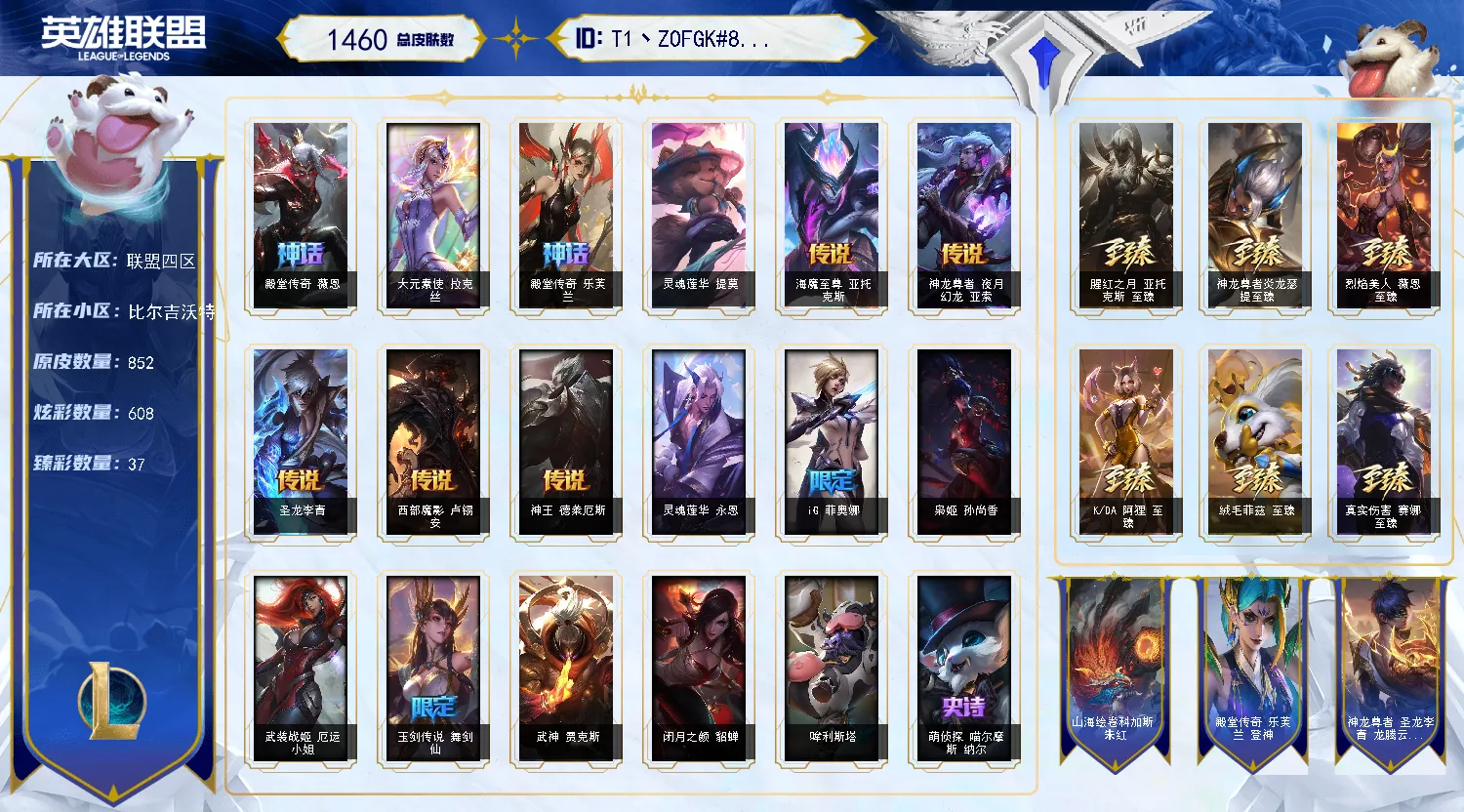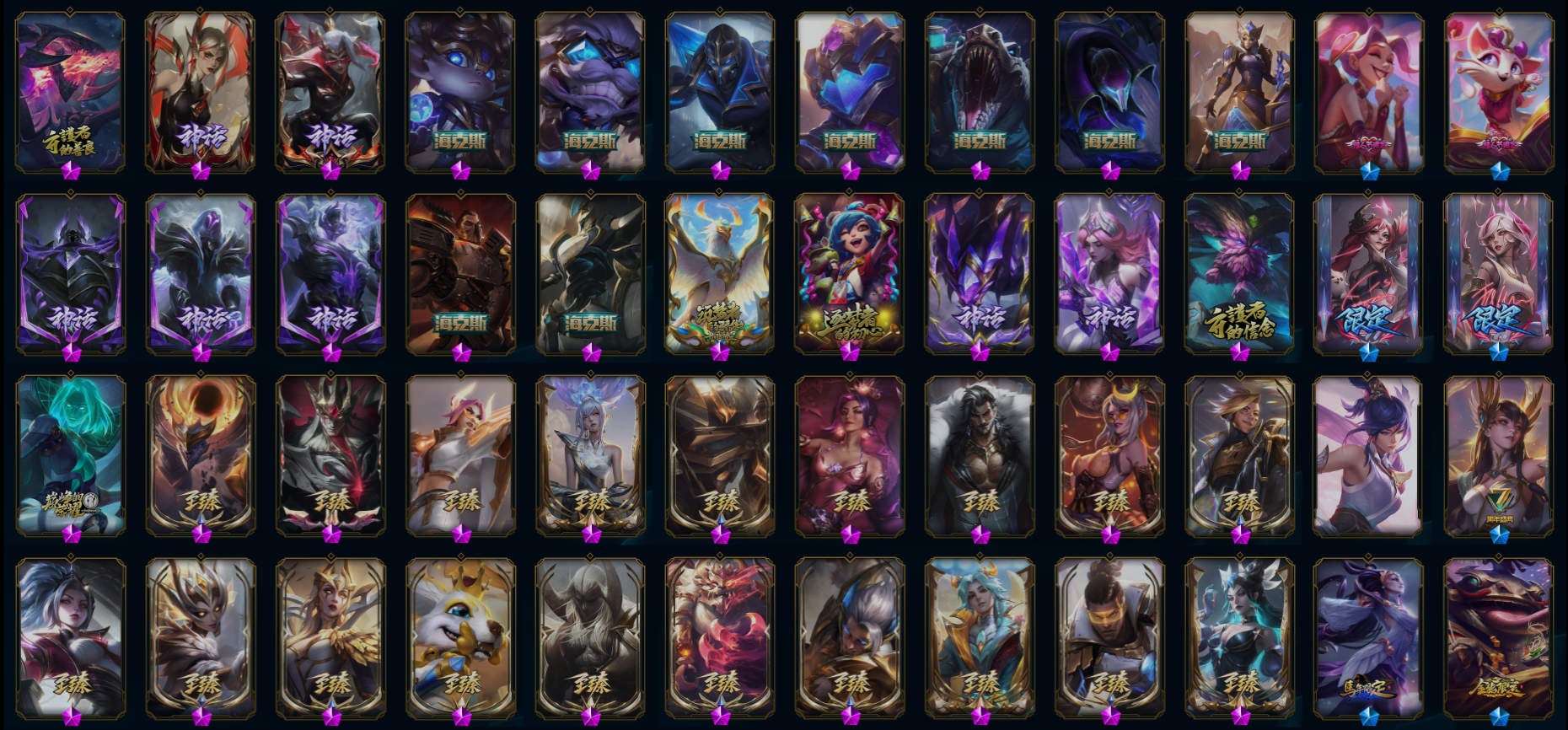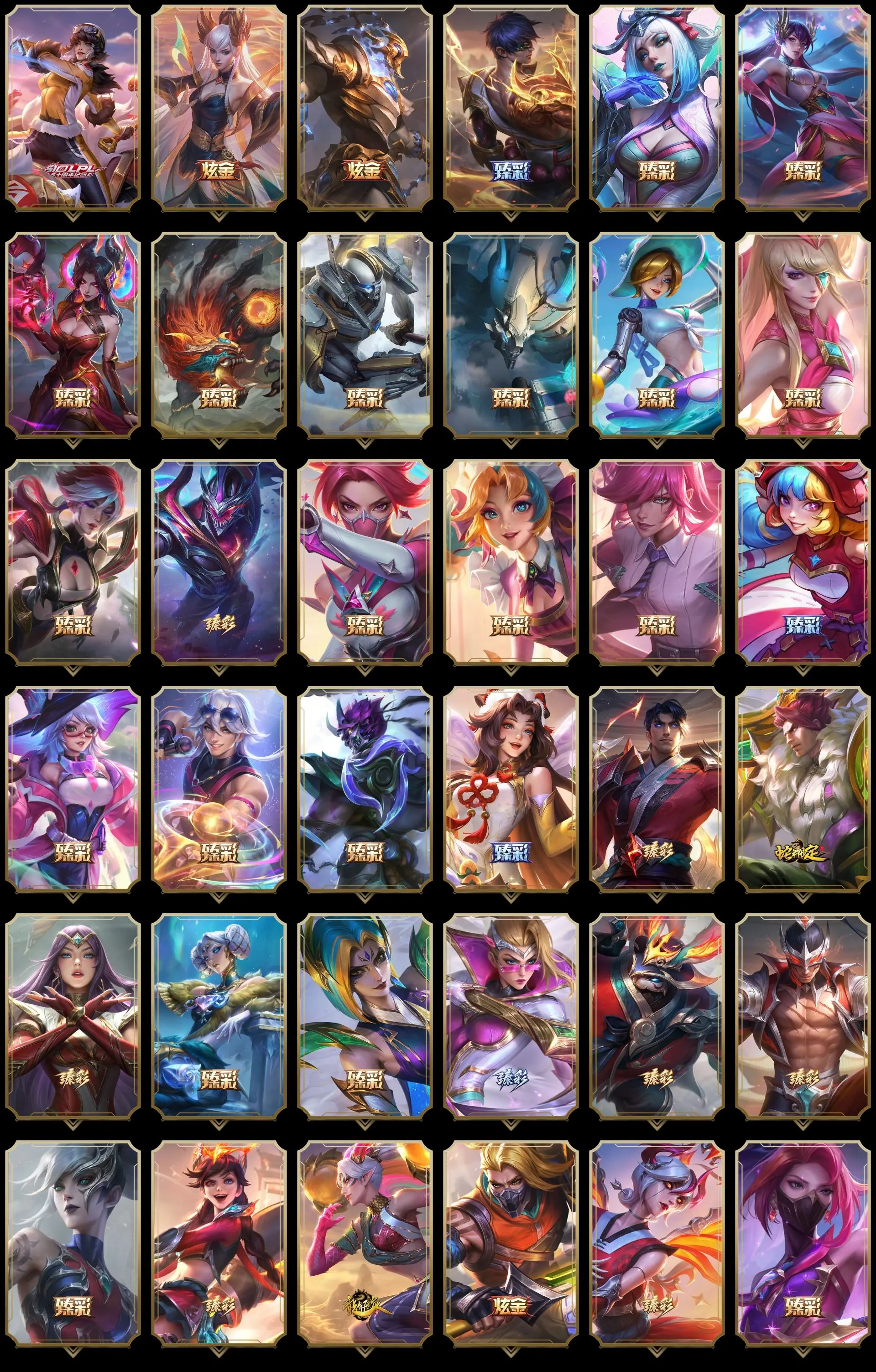 【重要皮肤】机神玄武盖伦至臻 永恒星灵佐伊至臻 暗裔英雄嘉文四世至臻 狼神英灵斯维因至臻 T1杰斯至臻 天龙之子伊泽瑞尔至臻 魔女阿卡丽至臻 剪纸仙灵希维尔至臻 至高天奎桑提至臻 海珀利安小队X09星环灵风迦娜至臻 星之守护者辛德拉至臻 魔女婕拉至臻 魔女乐芙兰至臻 未来战士卢锡安至臻 真实伤害赛娜至臻 灵能特工伊泽瑞尔至臻 福牛守护者菲奥娜至臻 源计划逆流塞拉斯至臻 暗星墨菲特至臻 神龙尊者炎龙瑟提至臻 神龙尊者均衡之龙沃利贝尔至臻 征服者贾克斯至臻 KDA二代卡莎至臻 KDA阿狸至臻 KDA阿狸2022至臻 KDA伊芙琳至臻 烈焰美人薇恩至臻 绒毛菲兹至臻 绒毛菲兹2022至臻 腥红之月亚托克斯至臻 腥红之月亚托克斯2022至臻 殿堂传奇薇恩 殿堂传奇乐芙兰 灰烬守护者慎 灰烬骑士莫德凯撒 灰烬骑士派克 海克斯科技瑟庄妮 海克斯科技雷克顿 海克斯科技吉格斯 海克斯科技波比 海克斯科技拉莫斯 海克斯科技魔腾 水晶掠夺者卡兹克 水晶圣骑蕾欧娜 永恒之森奥恩 暗星科加斯 恐惧新星德莱厄斯 零之枪骑赫卡里姆 胜利巨口克格莫 荣誉使者玛尔扎哈 养蜂人辛吉德 勇敢的心德莱厄斯 电玩女神厄运小姐 电玩勇者锐雯 玉剑传说舞剑仙 海珀利安小队Y03权天使卡蜜尔 女帝格温 点心宝贝萨勒芬妮 天龙之子斯莫德 剪纸仙灵艾瑞莉娅 龙腾虎跃瑟提 碧玉之牙卡西奥佩娅 你看见过我的熊猫吗安妮 广寒仙子嫦娥 张辽文远 烈焰美人薇恩 纳财大帝塔姆 胜利女神瑟庄妮 胜利机器人布里茨 胜利之剑亚托克斯 觅心女王艾希 觅心萝莉金克丝 觅心猫猫悠米 幽梦玫瑰辛德拉 北极星发明家塞拉斯 北极星使者彗 北极星使者萨科 寒冬精灵璐璐 冬季仙境奥莉安娜 冰雪女神辛德拉 夺命美人卡特琳娜 平安夜女神娑娜 魅惑女巫迦娜 魅惑女巫厄运小姐 魅惑女巫奈德丽 大魔法锅布里茨 灵魂收割者索拉卡 南瓜头王子阿木木 海之歌永恩 泳池派对佐伊 泳池派对普朗克 泳池派对奥莉安娜 泳池派对黑默丁格 泳池派对塔莉垭 泳池派对厄运小姐 泳池派对菲奥娜 泳池派对雷克顿 泳池派对瑟提 御星魔矢艾希 送披萨的小姐姐希维尔 克格汪 T1永恩 T1派克 T1纳尔 T1蔚 T1韦鲁斯 T1奥莉安娜 T1巴德 T1杰斯 T1金克丝 T1李青 DRX亚托克斯 DRX阿卡丽 DRX茂凯 EDG格雷福斯 DWG凯南 FPX普朗克 iG卡蜜尔 iG洛 iG艾瑞莉娅 iG菲奥娜 SSG纳尔 SKTT1扎克 SKTT1辛德拉 SKTT1艾克 SKTT1瑞兹 SKTT1阿兹尔 SKTT1雷克顿 SSW锤石 SSW图奇 SSW辛吉德 SKTT1劫 SKTT1李青 暗杀星奥莉安娜 暗杀星蒙多 暗杀星努努和威朗普 暗杀星慎 Fnatic古拉加斯 Fnatic嘉文四世 Fnatic卡尔萨斯 冰雪节辛吉德 冰雪兽纳尔 防暴士兵格雷福斯 防暴士兵辛吉德 冠军典狱长锤石 冠军之矛卡莉丝塔 冠军之血希瓦娜 春晖海神卡兹克 春晖神女艾希 鬼影森森茂凯 鬼影重重魔腾 胡桃夹子萨科 警用试作体K9内瑟斯 密林猎手提莫 南瓜头费德提克 破空枪骑孙悟空 圣诞精灵崔丝塔娜 圣诞狂欢基兰 圣诞老人古拉加斯 无头骑士赫卡里姆 邪恶圣诞老人维迦 幸福女神乐芙兰 雪默丁格 野兽猎人德莱文 野兽猎人瑟庄妮 英勇玩具兵普朗克 勇者奈德丽 征服者卡尔玛 暗影沃里克 冠军之箭艾希 阿木木主人不要我了 2021全球总决赛嘉文四世 都铎王朝图奇 十周年纪念安妮 源代码乐芙兰 神凰行者瑞羽圣凰艾尼维亚 机神白虎贾克斯 机神苍狼瑟提 暗裔英雄盖伦 大元素使拉克丝 灵魂守卫乌迪尔 武装战姬厄运小姐 绝息圣堂洛
