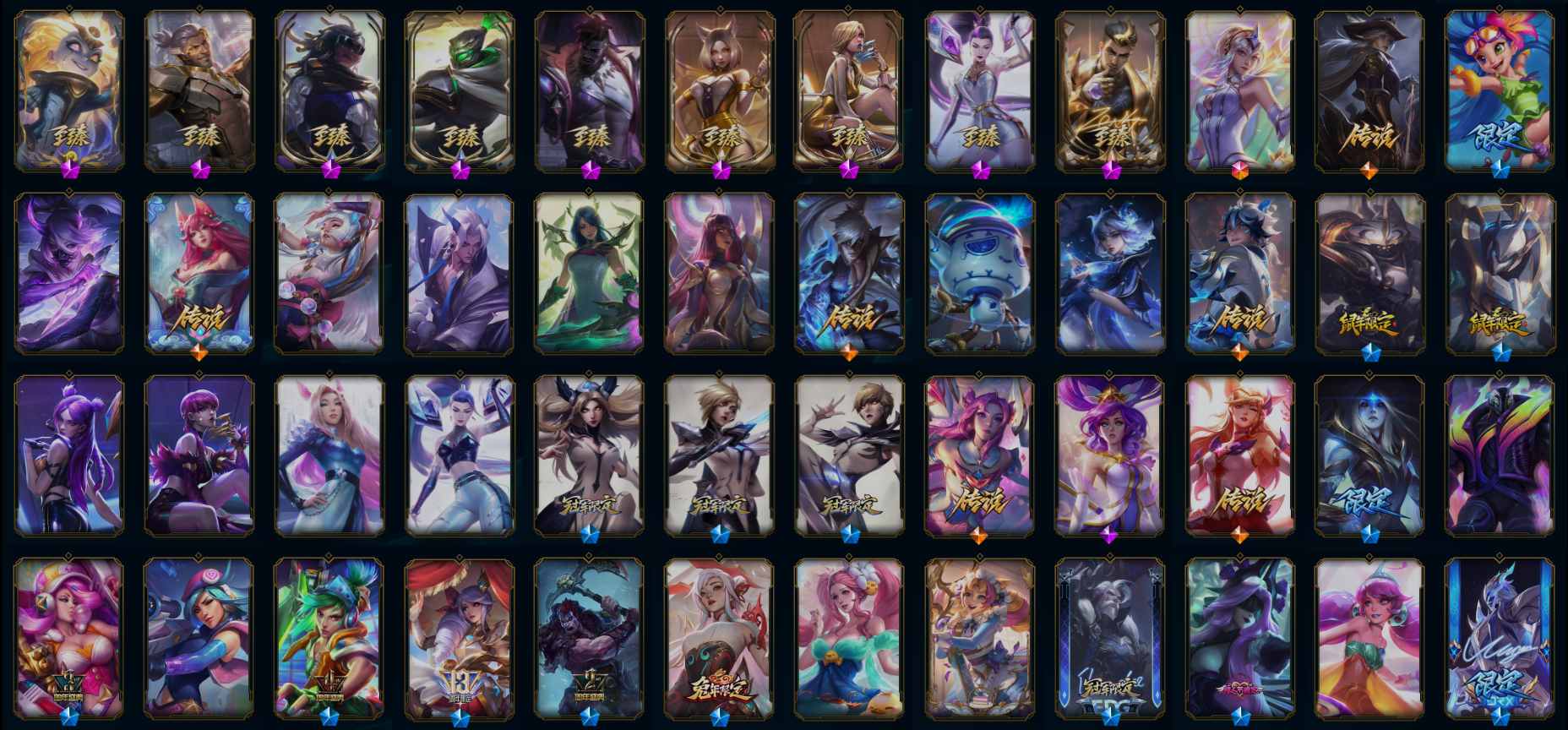 【传说皮肤】战斗学院伊泽瑞尔 太空律动律动队长提莫 钢铁军团盖伦 神王盖伦 真实伤害艾克 海魔至尊亚托克斯 暗星塞拉斯 至高天韦鲁斯 西部魔影永恩 金牌主播德莱文 霸天异形卡兹克 星之守护者金克丝 西部天使艾希 魔幻卡牌崔斯特 神龙尊者夜月幻龙亚索 青花瓷伊泽瑞尔 炼狱魔犬内瑟斯 星之守护者阿狸 红色男爵库奇 至高天派克 驯龙学者黑默丁格 星之守护者洛 铁哥们儿奥拉夫 星之守护者阿卡丽 焰尾妖狐阿狸 黎明使者索拉卡 星之守护者卡莎 地狱之门卫士加里奥 灌篮高手德莱厄斯 欧米伽小队幽灵特工 恶魔男爵瑞兹 约德尔国队长提莫 黯晶凤凰艾尼维亚 暗星尊烬 神龙尊者圣龙李青 源计划泯灭雷克顿 源计划联合艾希 源计划净化薇恩 黎明使者永恩 女校长菲奥娜 枯萎之壤泽拉斯 黑夜使者亚索 黎明使者锐雯 陆地王者4WD布里茨 宇航员诺提勒斯 恶魔之刃泰达米尔 屠龙勇士潘森 冰川巨兽墨菲特 源计划超体莫德凯撒 女皇艾希 腥红之月鬼武姬阿卡丽 地狱行者孙悟空 神王德莱厄斯 灵魂莲华阿狸 合金巨兽努努和威朗普 女警狙击凯特琳 苍穹之光韦鲁斯 冰霜亚龙希瓦娜 钢铁之翼凯尔 鬼魂新娘莫甘娜 蔷薇绅士杰斯 战场女武神凯尔 霸天零式赛恩 提莫约德尔人的一大步 黯黑魔龙希瓦娜 律政大亨蒙多 上古战魂魔腾 银河魔装机神兰博 西部魔影卢锡安 绅士科加斯 战地机甲厄加特 源计划毁灭派克 战地巨兽科加斯 符文战熊沃利贝尔 泳池派对吉格斯 星之守护者拉克丝 最终BOSS维迦 双重冰晶艾尼维亚 大天使长米迦勒凯尔