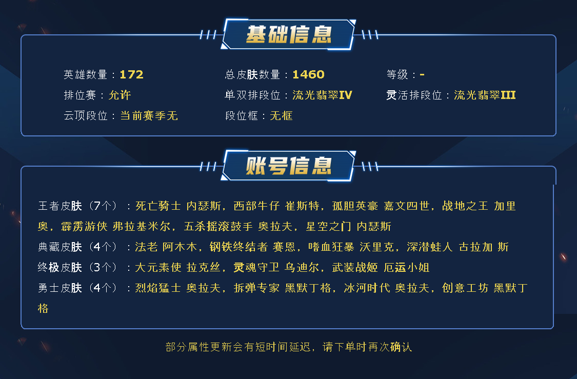 ~~喜欢记得收藏~~可排位~~1456皮全英雄~~租之前尽量查一下游戏ID,确保段位是您需要的,避免浪费您的时间~~请勿挂机逃跑故意送人头,谢谢合作,谢谢~~