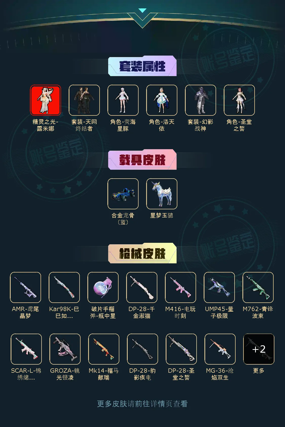 【稀有资产】精灵之光-露米娜[3级]/破片手榴弹-瓶中星球/M416-电玩时刻/GROZA-精灵之光/角色-Mark.06/套装-深海小丑鱼/套装-天网终结者/套装-暗影哥特/套装-龟仙人/套装-迅捷狂鲨/角色-粉雾星云/角色-都市丽猫/角色-摩登魅猫/角色-冰公主