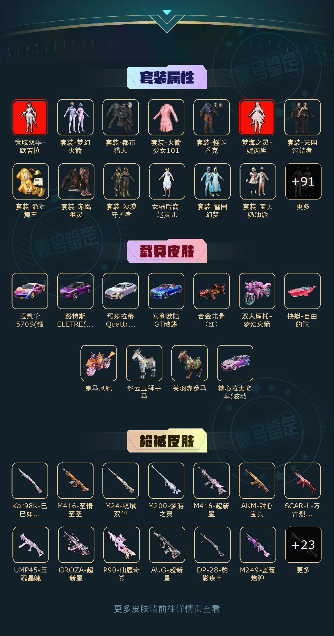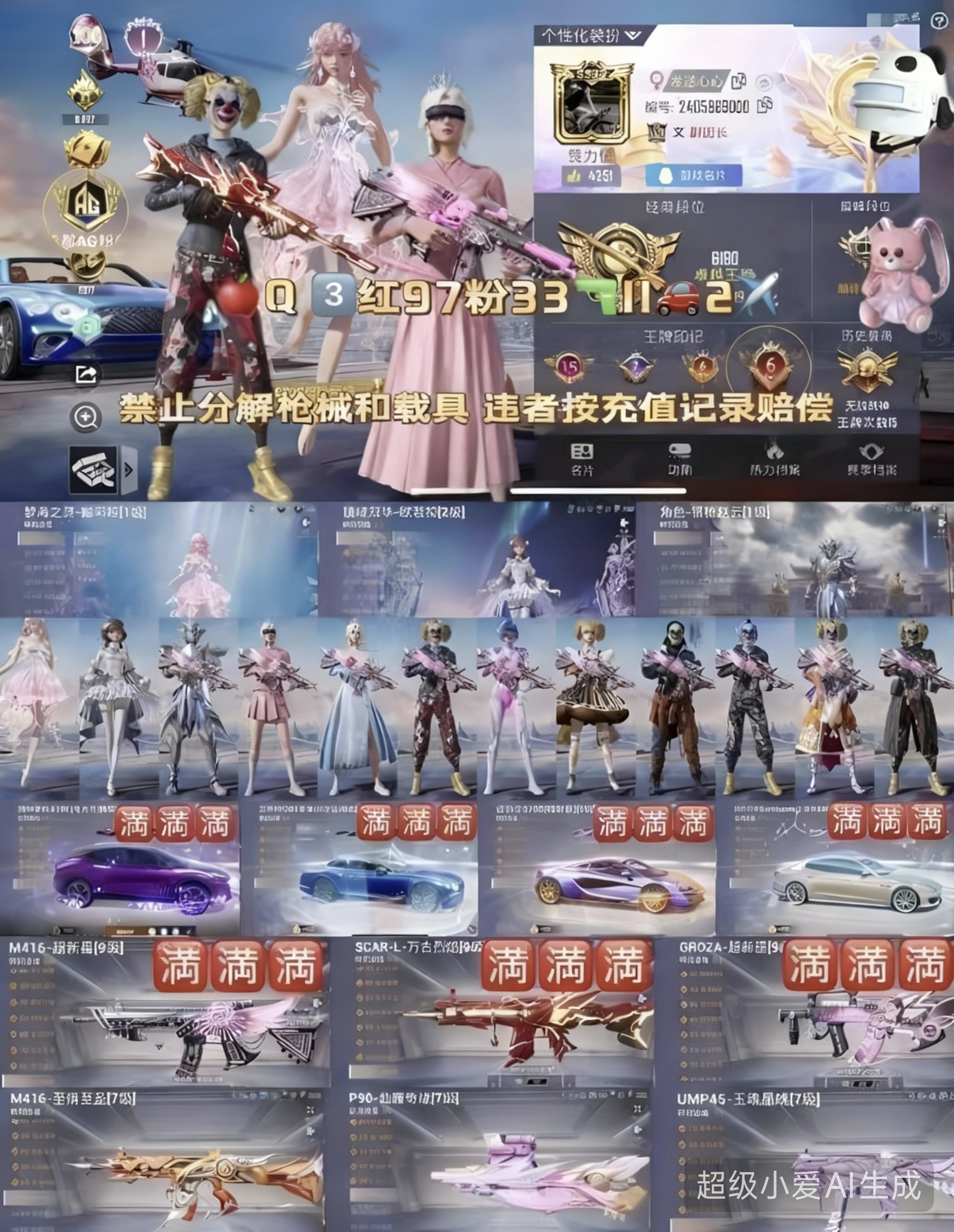 超级王牌3星98粉,11载具,414套装,22王牌印记,无敌战神历史最高段,263354热力值 平底锅-仲夏莫吉托/平底锅-林间仙鹿/AKM-甜心宝贝/SCAR-L-童趣迷兔/GROZA-旋转彩虹/GROZA-香水柠檬/M416-心之恋语/GROZA-超新星/AKM-魔法神域/M416-至情至圣/M762-甜蜜誓约/AUG-超新星/M416-超新星/SCAR-L-万古烈焰/AKM-梦之光华/M417-第五大道/Mk14-闲梦青缨/SLR-暗夜玫瑰/MK20-H-海螺星光/DP-28-暗夜鎏金/MG3-洛神天依/M249-蓝莓炮弹/DP-28-豹影疾电/P90-仙履奇缘/UMP45-相思残雪/汤姆逊-冰川粉黛/UMP45-玉魂晶魄/爆炸猎弓-雪梅暗香/烟雾弹-猫咪绅士/破片手榴弹-粉粉猫爪/AWM-花间之火/Kar98K-巳巳如意/M24-镜域双华/M200-梦海之灵/M24-莲影清波/玛莎拉蒂Quattroporte(幻星粉)/宾利欧陆GT敞篷(深空蓝)/路特斯ELETRE(电光紫)/鬼马风驰/快艇-自由的鲸/合金龙骨(红)/糖心拉力赛车(波动紫)/迈凯伦570S(镭射紫)/关羽赤兔马/赵云玉狮子马/照夜玉狮子/双人摩托-梦幻火箭/