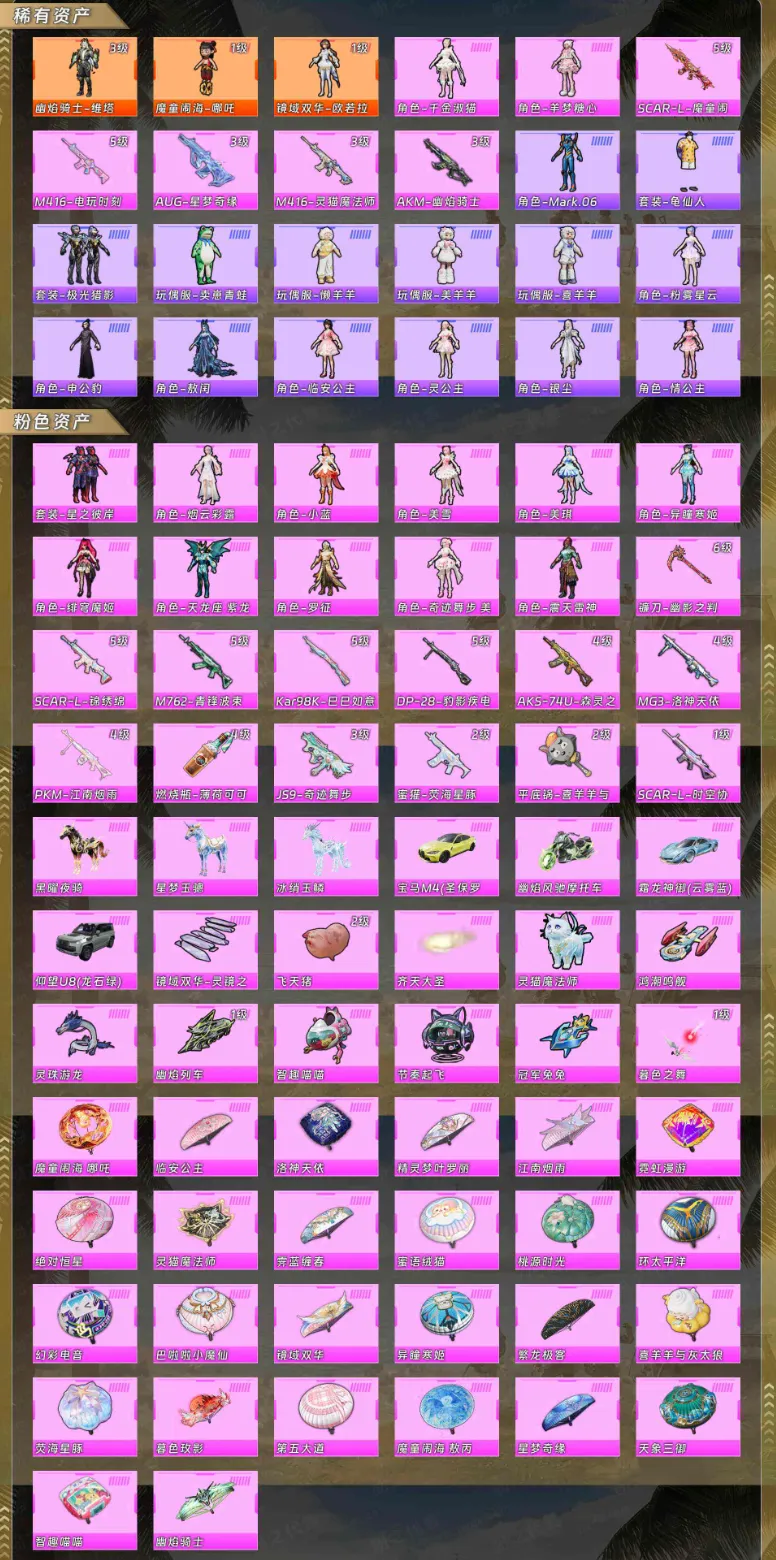 【稀有资产】幽焰骑士-维塔[1级]/角色-魔童闹海-哪吒[3级]/镜域双华-欧若拉[1级]/角色-千金淑猫/角色-羊梦糖心/SCAR-L-魔童闹海 哪吒/M416-电玩时刻/AUG-星梦奇缘/M416-灵猫魔法师/AKM-幽焰骑士/角色-Mark.06/套装-龟仙人/套装-极光猎影/玩偶服-卖崽青蛙/玩偶服-懒羊羊/玩偶服-美羊羊/玩偶服-喜羊羊/角色-粉雾星云/角色-申公豹/角色-敖闰/角色-临安公主/角色-灵公主/角色-银尘/角色-情公主