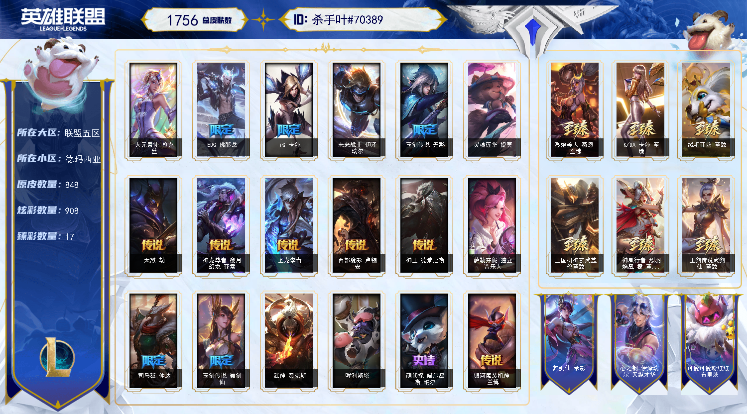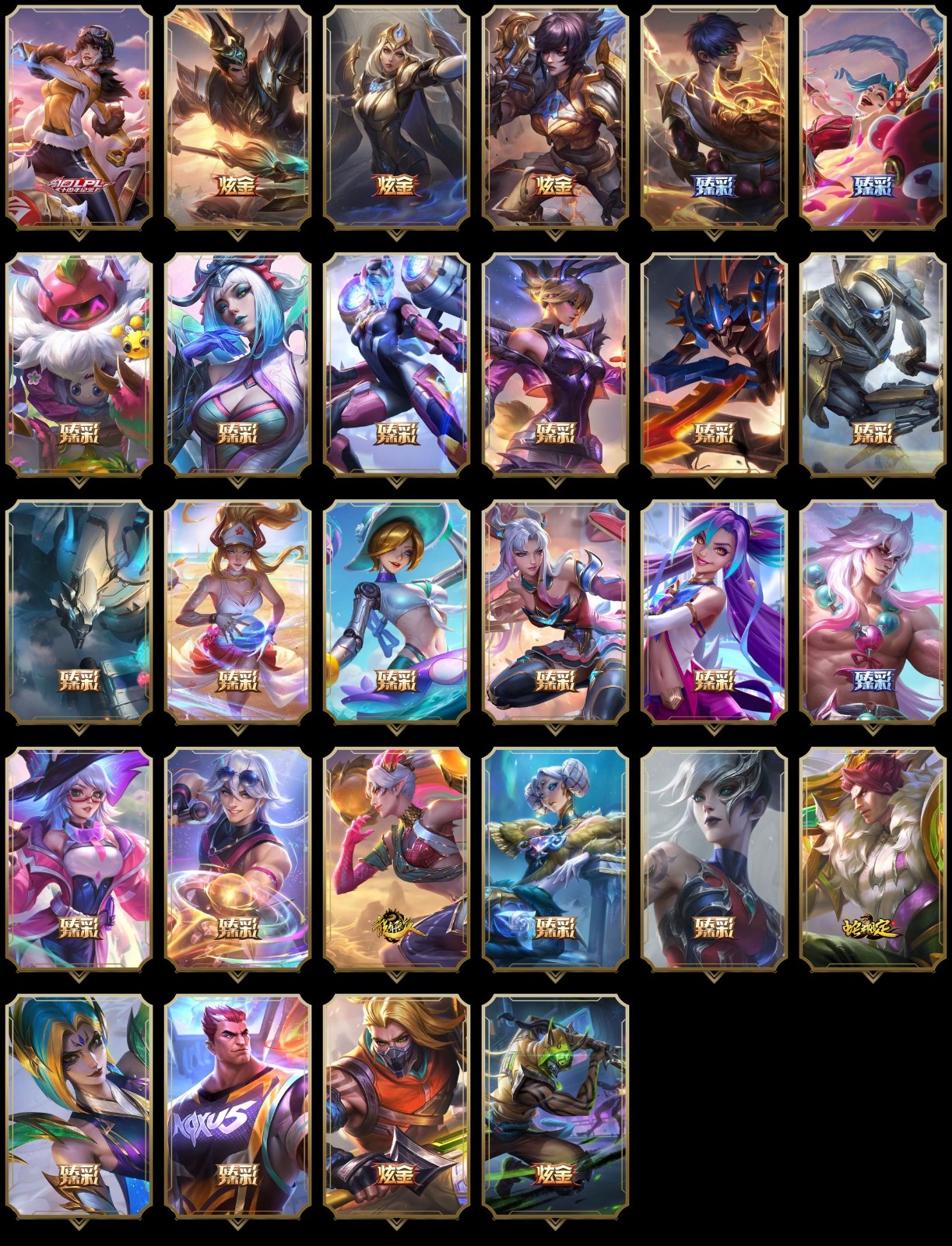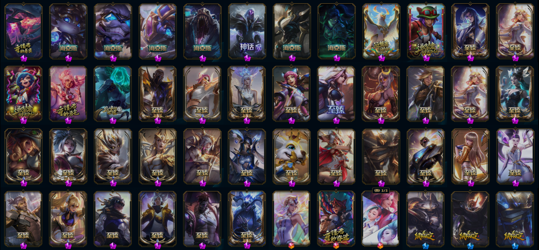 【重要皮肤】心之钢永恩至臻 魔女阿卡丽至臻 斗魂觉醒派克至臻 DRX亚托克斯至臻 绝息圣堂厄运小姐至臻 青花瓷丽桑卓至臻 至高天奎桑提至臻 海珀利安小队X09星环灵风迦娜至臻 星之守护者辛德拉至臻 幻灵战斗猫金克丝至臻 神凰行者烈羽焰凰霞至臻 魅惑女巫莫甘娜至臻 女帝黛安娜至臻 战斗学院蕾欧娜至臻 魔女婕拉至臻 魔女乐芙兰至臻 真实伤害亚索至臻 真实伤害赛娜至臻 星之守护者索拉卡至臻 灵能特工伊泽瑞尔至臻 福牛守护者菲奥娜至臻 源计划逆流塞拉斯至臻 王国机神玄武盖伦至臻 KDA二代卡莎至臻 KDA一代卡莎至臻 烈焰美人薇恩至臻 绒毛菲兹至臻 玉剑传说武剑仙至臻 未来战士锤石至臻 未来战士锤石2022至臻 灰烬骑士派克 海克斯科技雷克顿 海克斯科技克格莫 海克斯科技吉格斯 海克斯科技波比 星之守护者塔莉垭 暗星科加斯 零之枪骑赫卡里姆 摄魂使者薇恩 胜利剑圣易 胜利之王泰达米尔 胜利巨口克格莫 养蜂人辛吉德 电玩女神厄运小姐 电玩女神阿狸 玉剑传说无影 玉剑传说舞剑仙 神凰行者幽羽玄凰萨勒芬妮 玉剑传说神机花火 玉剑传说舞龙卫 玉剑传说翼剑仙 天龙之子李青 天龙之子斯莫德 南天之怒沃里克 定海神珍孙悟空 司马懿仲达 烈焰美人薇恩 王国机神青龙德莱文 王国机神白虎贾克斯 王国机神玄武盖伦 福牛守护者厄斐琉斯 福牛守护者德莱厄斯 胜利女神瑟庄妮 胜利之树茂凯 胜利机器人布里茨 胜利枪神格雷福斯 觅心游侠卢锡安 冬季仙境奥莉安娜 雪球也能爆炸吉格斯 圣诞捣蛋鬼金克丝 冬季仙境卡尔玛 魄罗骑士瑟庄妮 平安夜女神娑娜 大魔法锅布里茨 死亡誓约维克托 海之歌奈德丽 泳池派对凯特琳 泳池派对黑默丁格 泳池派对厄运小姐 泳池派对菲奥娜 泳池派对李青 泳池派对蕾欧娜 泳池派对雷克顿 电玩战魂赫卡里姆 送披萨的小姐姐希维尔 鸡里奥 克格汪 制胜金靴李青 EDG佛耶戈 EDG格雷福斯 EDG佐伊 DWG崔斯特 DWG烬 DWG凯南 DWG奈德丽 FPX李青 iG卡莎 iG艾瑞莉娅 iG乐芙兰 SSG纳尔 SSG嘉文四世 SKTT1扎克 SKTT1瑞兹 SKTT1阿兹尔 SKTT1雷克顿 SSW锤石 SSW雷恩加尔 SSW泰隆 SSW图奇 SSW辛吉德 SKTT1劫 SKTT1婕拉 SKTT1李青 暗杀星蒙多 暗杀星努努和威朗普 暗杀星慎 Fnatic迦娜 Fnatic古拉加斯 Fnatic卡尔萨斯 冰雪节格雷福斯 冰雪节辛吉德 防暴士兵辛吉德 防暴天使凯尔 冠军典狱长锤石 冠军掠夺者卡兹克 冠军之矛卡莉丝塔 冠军之刃锐雯 冠军之刃锐雯2016 冠军之血希瓦娜 冠军之隐劫 冠军之志瑞兹 鬼影森森茂凯 鬼影重重魔腾 红桃杰克崔斯特 胡桃夹子萨科 警用试作体K9内瑟斯 蒙多蒙多 密林猎手提莫 破空枪骑孙悟空 圣诞精灵崔丝塔娜 圣诞狂欢基兰 圣诞狂欢努努和威朗普 圣诞老人古拉加斯 圣诞玩偶波比 圣诞驯鹿克格莫 外星装甲库奇 无头骑士赫卡里姆 喜庆之树茂凯 邪恶圣诞老人维迦 幸福女神乐芙兰 雪默丁格 雪球也能爆炸吉格斯 野兽猎人德莱文 英勇玩具兵普朗克 勇者阿狸 暗影沃里克 魅惑女巫辛德拉 阿木木主人不要我了 波比的巧克力工坊 都铎王朝图奇 十五周年纪念希维尔 十周年纪念安妮 源代码乐芙兰 神凰行者瑞羽圣凰艾尼维亚 胜利凤凰艾尼维亚 斗魂觉醒莎弥拉 大元素使拉克丝 未来战士伊泽瑞尔 KDAALLOUT萨勒芬妮独立音乐人 KDAALLOUT萨勒芬妮明日新星 KDAALLOUT萨勒芬妮超级巨星 绝息圣堂洛