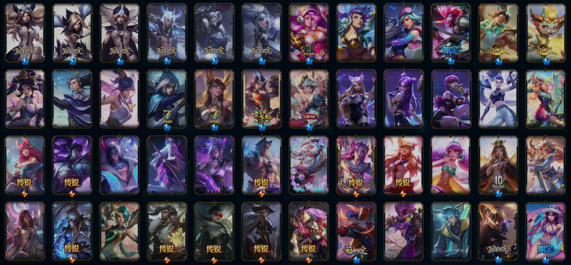 【传说皮肤】邪鸦魅影乐芙兰 灵能特工娑娜 死亡骑士盖伦 血石领主弗拉基米尔 灵魂莲华锤石 黎明使者永恩 灵魂莲华瑟提 源计划超体莫德凯撒 红色男爵库奇 提莫约德尔人的一大步 霸天零式赛恩 星之守护者金克丝 奥德赛凯隐 战场女武神凯尔 灌篮高手德莱厄斯 陆地王者4WD布里茨 腥红之月鬼武姬阿卡丽 黑夜使者索拉卡 黯晶凤凰艾尼维亚 双重冰晶艾尼维亚 黎明使者锐雯 蔷薇绅士杰斯 战地机甲厄加特 星之守护者阿卡丽 黑夜使者亚索 焰尾妖狐阿狸 至尊魔女莫甘娜 神拳李青 战斗学院伊泽瑞尔 战地巨兽科加斯 源计划泯灭雷克顿 驯龙炮手崔丝塔娜 神王德莱厄斯 西部天使赛娜 钢铁之翼凯尔 光明哨兵薇恩 泳池派对吉格斯 星之守护者霞 耀星女神拉克丝 上古战魂魔腾 最终BOSS维迦 电玩女神娑娜 合金巨兽努努和威朗普 屠龙勇士潘森 源计划联合艾希 真实伤害艾克 女警狙击凯特琳 星之守护者拉克丝 光明哨兵格雷福斯 符文战熊沃利贝尔 暗星锤石 炼狱魔犬内瑟斯 神龙尊者圣龙李青 源计划毁灭派克 欧米伽小队幽灵特工 恶魔之刃泰达米尔 银河魔装机神兰博 魔幻卡牌崔斯特 女帝卡特琳娜 绅士科加斯 天煞劫 约德尔国队长提莫 暗星尊烬 西部天使艾希 霸天异形卡兹克 钢铁军团盖伦 源计划净化薇恩 太空律动猫猫布里和里茨 地狱之门卫士加里奥 恶魔男爵瑞兹 第三类接触黑默丁格 宇航员诺提勒斯 女校长菲奥娜 灵魂莲华阿狸 偶像歌手阿狸 神王盖伦 驯龙学者黑默丁格 黯黑魔龙希瓦娜 女主播迦娜 星之守护者卡莎 丧尸布兰德 星之守护者阿狸 神龙尊者昼日真龙亚索 苹果机器人布里茨 律政大亨蒙多 女皇艾希 金牌主播德莱文 西部魔影大小姐蕾欧娜 大天使长米迦勒凯尔 苍穹之光韦鲁斯 西部魔影卢锡安 战斗学院凯特琳 烈焰雄心崔丝塔娜 铁哥们儿奥拉夫 神龙尊者夜月幻龙亚索 鬼魂新娘莫甘娜 源计划林易 未来战士凯特琳