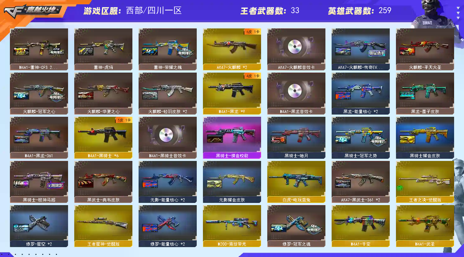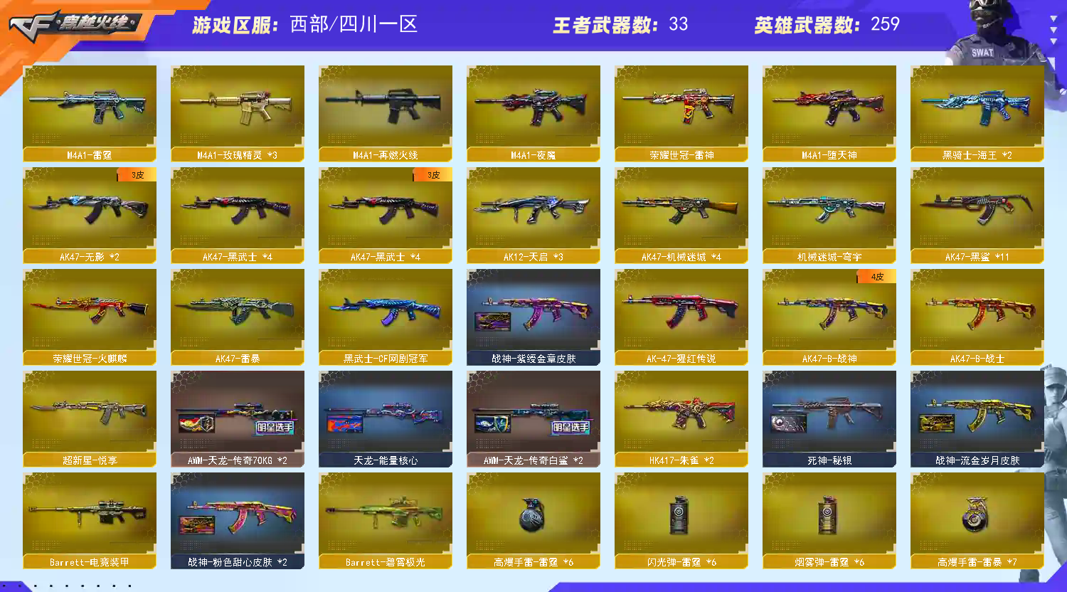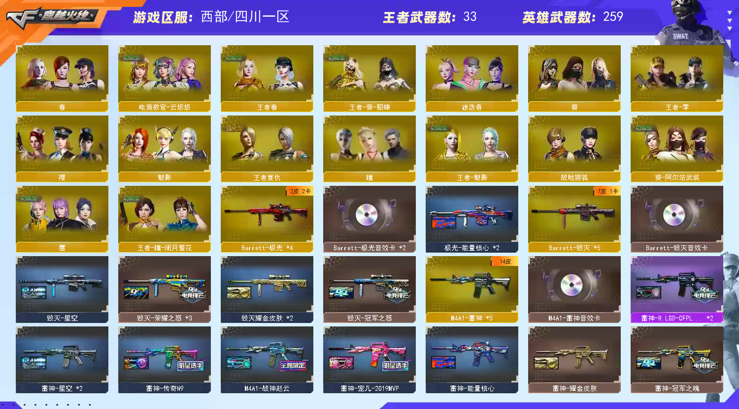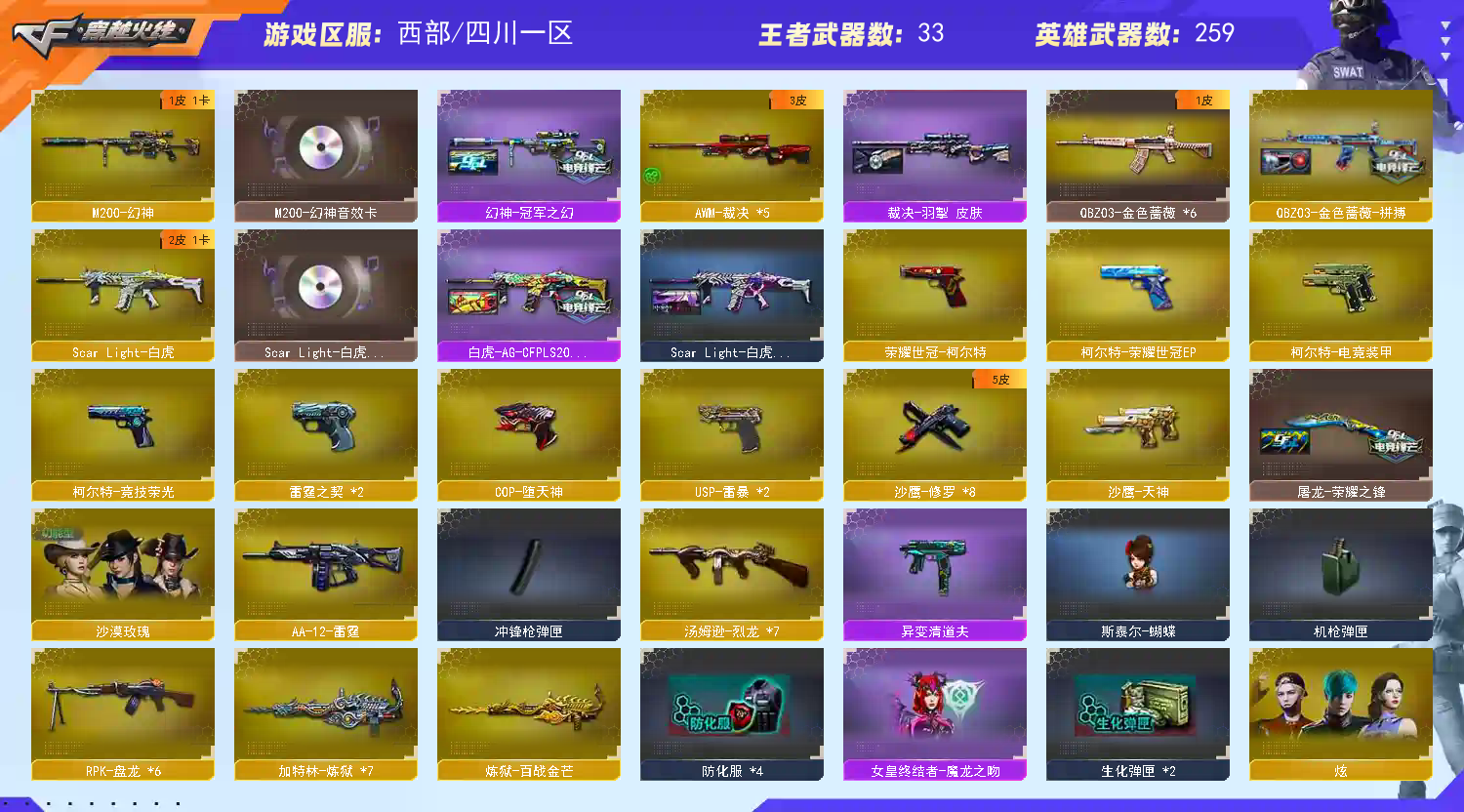 【四川一区】【幻神三件套】【白虎三件套】【6烈龙】【异变清道夫】【斯泰尔-蝴蝶】【死亡之眼】【6盘龙】【竞技荣光套装X3套】【雷暴套装X7套】【夜魔套装X1套】【堕天神套装X6套】【堕天神套装X6套】【雷霆套装X6套】【M200-幻神】【幻神-冠军之幻】【M200-幻神音效卡】【M200-竞技荣光】【王者星神-觉醒版】【AWM-裁决】【裁决-羽掣 皮肤】【Scar Light-白虎】【白虎-AG-CFPLS20冠军】【Scar Light-白虎-暗星】【Scar Light-白虎音效卡】【白虎-电玩蓝兔】【QBZ03-金色蔷薇】【QBZ03-金色蔷薇-拼搏】【M4A1-雷霆】【AK47-雷暴】【HK417-朱雀】【M4A1-堕天神】【M4A1-夜魔】【USP-雷暴】【荣耀世冠-柯尔特】【柯尔特-竞技荣光】【雷霆之契】【COP-堕天神】【加特林-炼狱】【RPK-盘龙】【炼狱-百战金芒】【汤姆逊-烈龙】【斯泰尔-蝴蝶】【异变清道夫】【死亡之眼】【春】【电竞教官-云悠悠】【葵】【迷迭香】【沙漠玫瑰】【瞳】【王者春】【王者-葵-貂蝉】【王者-零】【王者-瞳-闭月羞花】【王者-魅影】【王者复仇】【樱】【鹰】【炫】【魅影】【空】【M4A1-雷神】【雷神-荣耀之魄】【雷神-宠儿-2019MVP】【M4A1-雷神-CFS 2019】【雷神-R.LGD-CFPLS18冠军】【M4A1-雷神-白鲨皮肤】【雷神-冠军之魄】【M4A1-战神赵云】【雷神-传奇N9】【雷神-虎将】【雷神-能量核心】【雷神-耀金皮肤】【雷神-星空】【M4A1-雷神音效卡】【AK47-火麒麟】【AK47-火麒麟-传奇EVEN】【火麒麟-冠军之心】【火麒麟-华夏之心】【火麒麟-轻羽皮肤】【火麒麟-平天大圣】【火麒麟-CFSTAR】【AK47-火麒麟音效卡】【M4A1-黑骑士】【黑骑士-冠军之势】【黑骑士耀金皮肤】【黑骑士-战神马超】【黑骑士-摸金校尉】【黑骑士-暗月】【M4A1-黑骑士音效卡】【M4A1-黑龙】【黑龙-墨子皮肤】【M4A1-黑龙-361】【黑龙-能量核心】【黑龙-暗月】【M4A1-黑龙音效卡】【Barrett-毁灭】【毁灭-荣耀之怒】【毁灭-冠军之怒】【巴雷特-毁灭-CFPL冠军】【毁灭耀金皮肤】【毁灭-星空】【Barrett-毁灭音效卡】