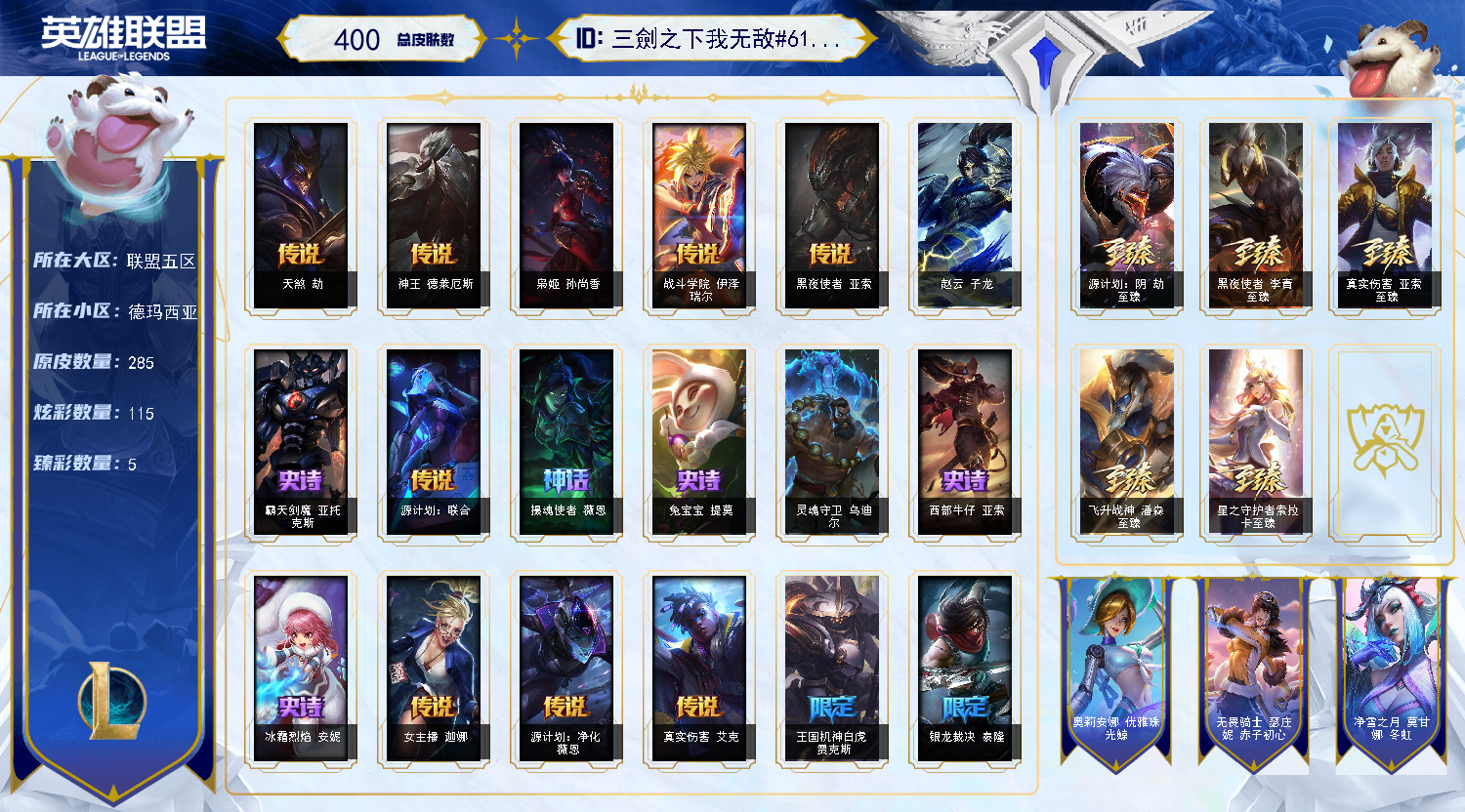 1894皮肤〓可排位白银青铜妹子号〓全英雄〓39神话〓18臻彩〓至臻亚索李青潘森摄魂〓黑夜亚索神王龙刀守护者源计划灵魂莲华耀星〓斗魂觉醒青铜黄金排位号虐菜