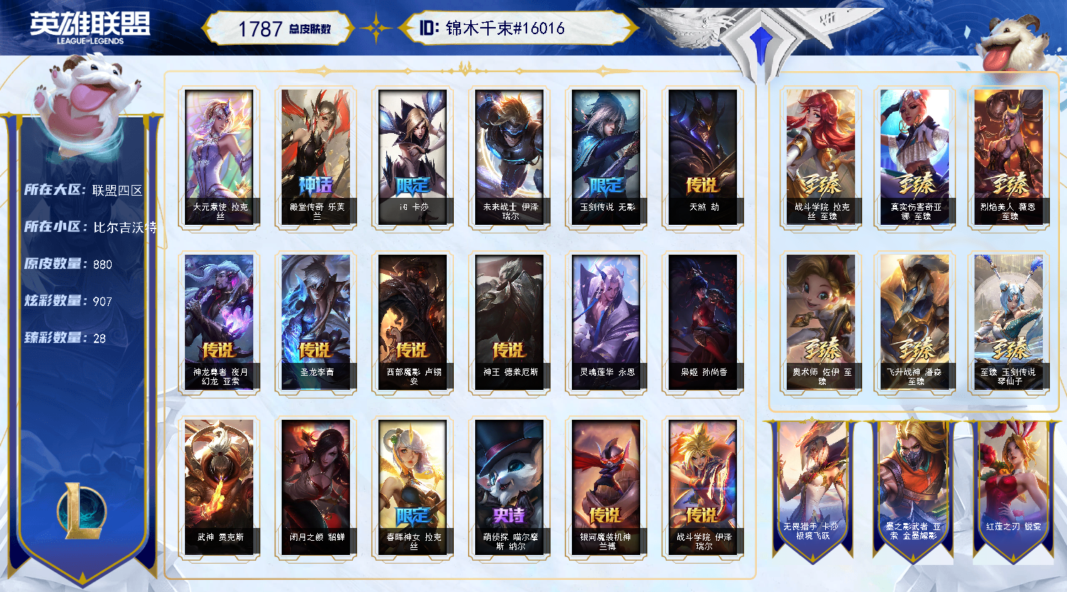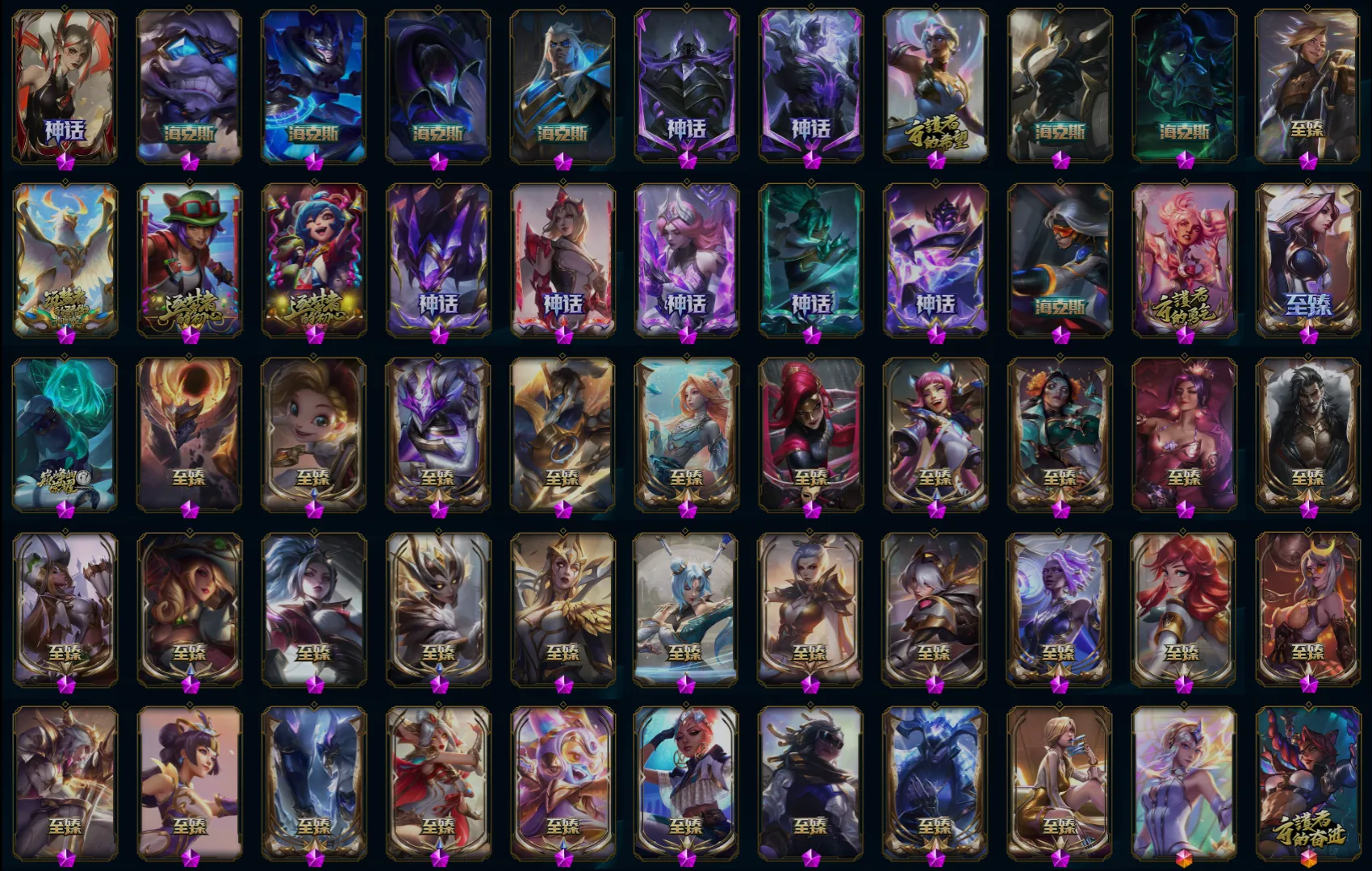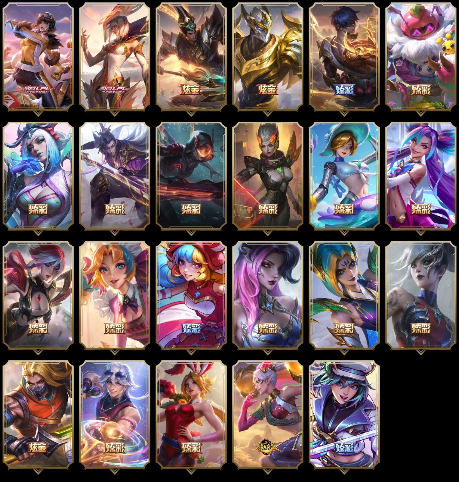 【重要皮肤】黑色玫瑰假面舞会卡特琳娜至臻 狼神英灵斯维因至臻 西部魔影伊芙琳至臻 青花瓷千珏至臻 魔女阿卡丽至臻 魂蔷薇烈娜塔至臻 玉剑传说琴仙子至臻 斗魂觉醒萨科至臻 DRX亚托克斯至臻 绝息圣堂厄运小姐至臻 剪纸仙灵希维尔至臻 星之守护者辛德拉至臻 星之守护者艾克至臻 海之歌萨勒芬妮至臻 月蚀骑士赛娜至臻 幻灵战斗猫金克丝至臻 青花瓷拉克丝至臻 神凰行者烈羽焰凰霞至臻 魅惑女巫莫甘娜至臻 女帝黛安娜至臻 太空律动璐璐至臻 魔女婕拉至臻 魔女乐芙兰至臻 奥术师佐伊至臻 真实伤害赛娜至臻 灵能特工伊泽瑞尔至臻 王国机神玄武盖伦至臻 暗星墨菲特至臻 飞升战神潘森至臻 KDA伊芙琳至臻 战斗学院拉克丝至臻 烈焰美人薇恩至臻 烈焰美人薇恩2022至臻 魅惑女巫厄运小姐至臻 星之守护者妮蔻至臻 源计划正义艾瑞莉娅至臻 真实伤害奇亚娜至臻 玉剑传说武剑仙至臻 殿堂传奇乐芙兰 水晶巫灵泽拉斯 灰烬守护者慎 灰烬骑士莫德凯撒 海克斯科技斯维因 海克斯科技吉格斯 海克斯科技嘉文四世 海克斯科技魔腾 水晶掠夺者卡兹克 水晶圣骑艾希 水晶圣骑塔莉垭 水晶圣骑蕾欧娜 星之守护者塔莉垭 黎明使者卡尔玛 零之枪骑赫卡里姆 摄魂使者薇恩 新创战纪希维尔 胜利剑圣易 胜利女神娑娜 胜利女神希维尔 胜利之王泰达米尔 胜利巨口克格莫 冰原核弹古拉加斯 养蜂人辛吉德 电玩勇者锐雯 星之守护者伊泽瑞尔 玉剑传说无影 女帝格温 玉剑传说无劫 玉剑传说舞龙卫 玉剑传说星仙子 玉剑传说翼剑仙 星之守护者佐伊 点心宝贝阿木木 天龙之子斯莫德 剪纸仙灵艾瑞莉娅 春晖神女拉克丝 南天之怒沃里克 金猪烈焰瑟庄妮 醒狮克格莫 王国机神青龙德莱文 胜利女神瑟庄妮 胜利之树茂凯 胜利机器人布里茨 胜利女神奥莉安娜 胜利枪神格雷福斯 胜利枪神卢锡安 胜利女神莫甘娜 胜利之剑亚托克斯 黯然心伤阿木木 水晶玫瑰迦娜 甜心之翎洛 觅心游侠卢锡安 觅心女王艾希 双城之战2微光实验室辛吉德 冬季仙境奥莉安娜 雪球也能爆炸吉格斯 圣诞捣蛋鬼金克丝 冰雪驯鹿波比 冰雪风暴希维尔 狂心冰王图奇 魄罗骑士瑟庄妮 平安夜女神娑娜 魅惑女巫伊莉丝 伯爵卡萨丁 克烈古拉伯爵 泳池派对凯特琳 泳池派对普朗克 泳池派对辛德拉 泳池派对奥莉安娜 泳池派对塔莉垭 泳池派对厄运小姐 泳池派对塔里克 泳池派对李青 泳池派对瑟提 泳池派对布隆 电玩战魂赫卡里姆 送披萨的小姐姐希维尔 DRX茂凯 EDG悠米 iG卡莎 SSG纳尔 SSG塔莉垭 SKTT1扎克 SKTT1辛德拉 SKTT1阿利斯塔 SKTT1瑞兹 SKTT1阿兹尔 SSW雷恩加尔 SSW泰隆 SSW图奇 SSW辛吉德 SKTT1劫 SKTT1李青 暗杀星蒙多 Fnatic迦娜 Fnatic嘉文四世 冰雪节辛吉德 防暴士兵格雷福斯 防暴天使凯尔 冠军典狱长锤石 冠军之矛卡莉丝塔 冠军之血希瓦娜 春晖神女艾希 春晖神女奇亚娜 鬼影森森茂凯 鬼影重重魔腾 胡桃夹子萨科 惊悚派对阿木木 警用试作体K9内瑟斯 蓝色忧郁崔斯特 密林猎手提莫 南瓜头费德提克 女猎手希维尔 圣诞精灵崔丝塔娜 圣诞开心鬼提莫 圣诞狂欢基兰 圣诞狂欢努努和威朗普 圣诞老人古拉加斯 圣诞玩偶波比 圣诞驯鹿克格莫 喜庆之树茂凯 邪恶圣诞老人维迦 幸福女神乐芙兰 雪球也能爆炸吉格斯 永恒之森乐芙兰 勇者阿狸 勇者奈德丽 暗影沃里克 波比的巧克力工坊 都铎王朝图奇 十五周年纪念希维尔 十周年纪念安妮 源代码乐芙兰 神凰行者瑞羽圣凰艾尼维亚 斗魂觉醒莎弥拉 大元素使拉克丝 未来战士伊泽瑞尔 绝息圣堂洛
