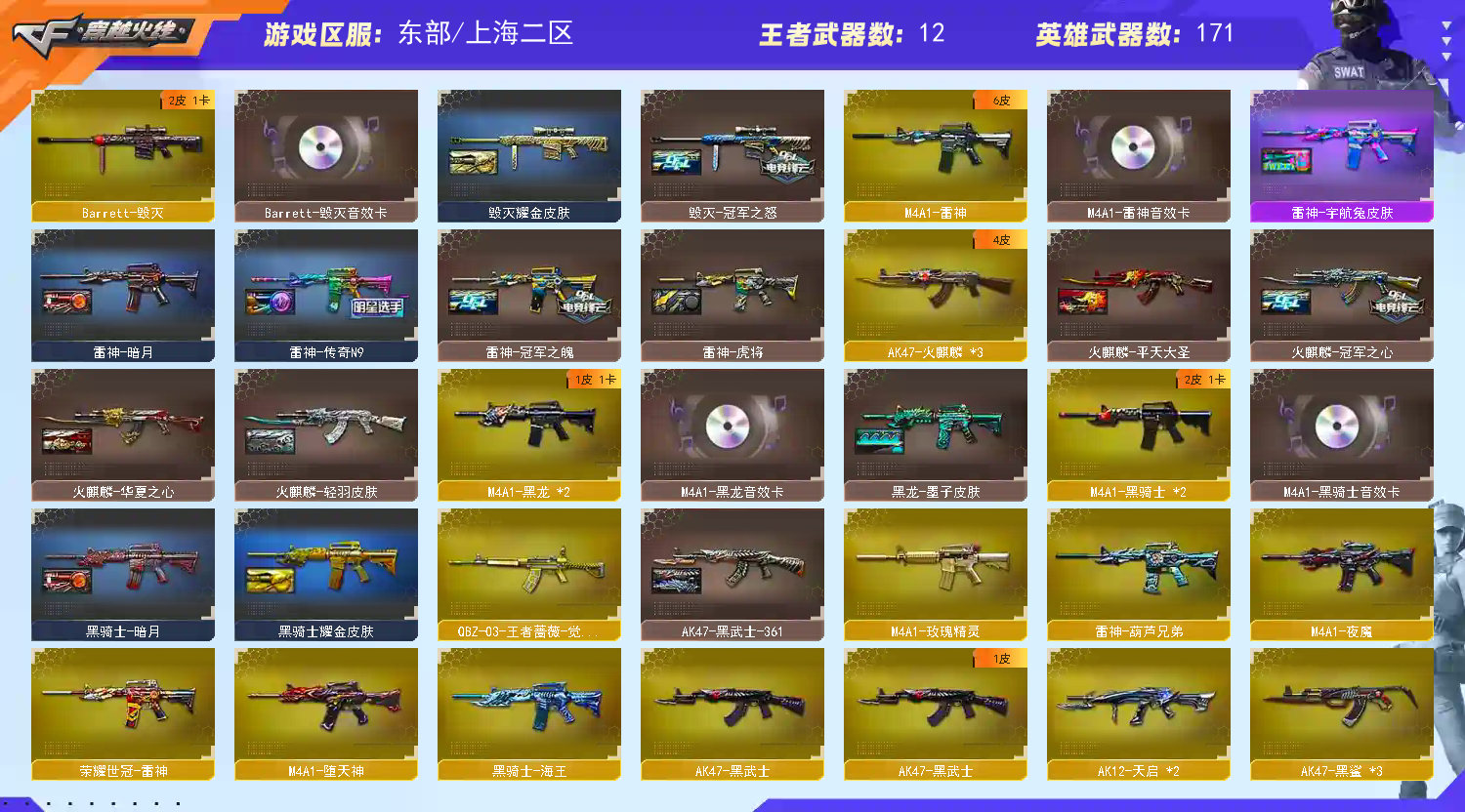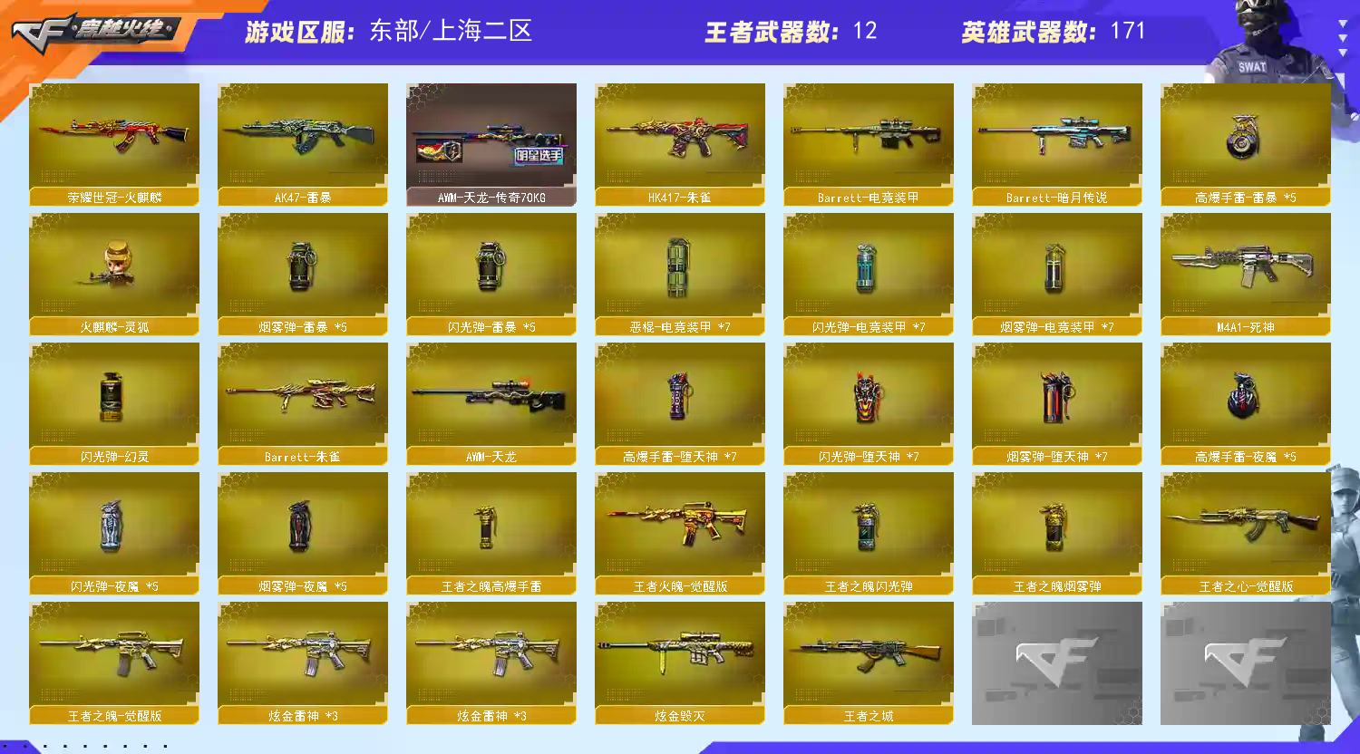 【上海二区】【可排位】【幻神三件套】【幻神1皮】【白虎三件套】【6烈龙】【斯泰尔-蝴蝶】【6盘龙】【堕天神套装X7套】【堕天神套装X7套】【雷暴套装X5套】【夜魔套装X5套】【M200-幻神】【幻神-冠军之幻】【M200-幻神音效卡】【Kar98K-星神】【AWM-裁决】【Scar Light-白虎】【白虎-电玩粉兔皮肤】【Scar Light-白虎音效卡】【QBZ03-金色蔷薇】【QBZ-03-王者蔷薇-觉醒版】【AK47-雷暴】【HK417-朱雀】【M4A1-堕天神】【M4A1-夜魔】【USP-雷暴】【柯尔特-冠军之特】【荣耀世冠-柯尔特】【COP-堕天神】【破空枪刃-夜魔】【Knife-冠军之刃】【加特林-炼狱】【RPK-盘龙】【汤姆逊-烈龙】【斯泰尔-蝴蝶】【零】【迷迭香】【沙漠玫瑰】【王者春】【王者-迷迭香】【王者-瞳-闭月羞花】【王者玲珑】【樱】【炫】【魅影】【M4A1-雷神】【雷神-冠军之魄】【雷神-传奇N9】【雷神-赛博朋克】【雷神-宇航兔皮肤】【雷神-虎将】【雷神-暗月】【M4A1-雷神音效卡】【AK47-火麒麟】【火麒麟-冠军之心】【火麒麟-华夏之心】【火麒麟-轻羽皮肤】【火麒麟-平天大圣】【火麒麟-CFSTAR】【M4A1-黑骑士】【黑骑士耀金皮肤】【黑骑士-摸金校尉】【黑骑士-暗月】【M4A1-黑骑士音效卡】【M4A1-黑龙】【黑龙-墨子皮肤】【黑龙-暗月】【M4A1-黑龙音效卡】【Barrett-毁灭】【毁灭-冠军之怒】【毁灭耀金皮肤】【Barrett-毁灭音效卡】
