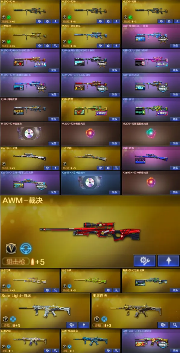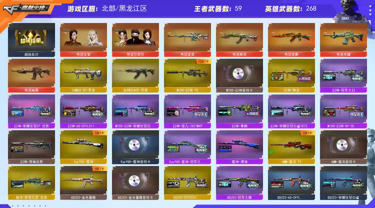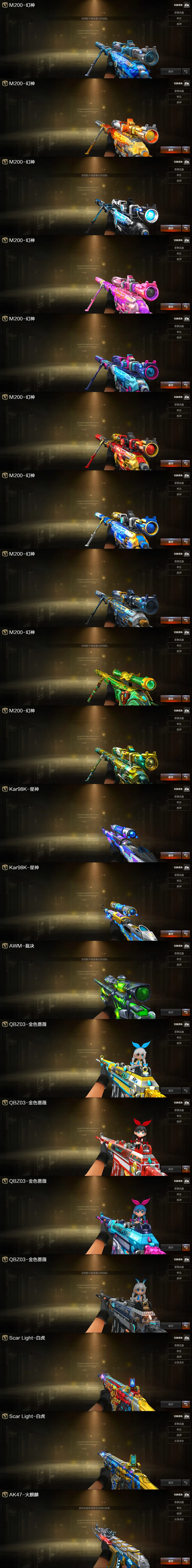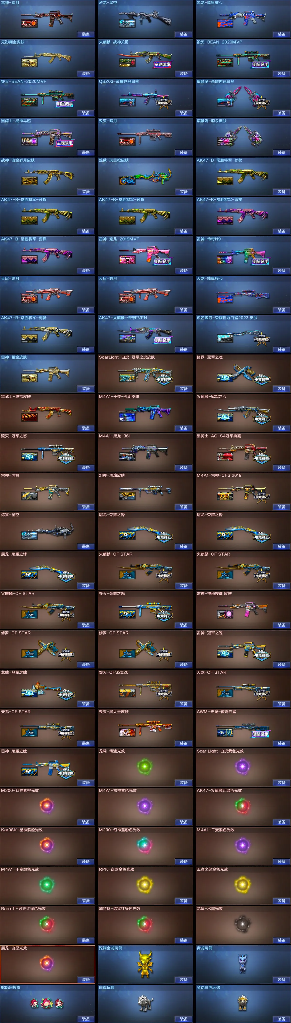 【稀有武器】:传说光耀/传说暗裔/传说辉光/传说夜影/传说圣灵/M200-幻神(3)/Kar98K-星神/G36C-幻影/ScarLight-白虎/M14EBR-玄武/M4A1-青龙(3)/HK417-朱雀/QBZ03-天罚/M4A1-幻灵/M4A1-雷霆/M4A1-堕天神/雷霆之契/USP-雷暴/COP-堕天神/柯尔特-电竞装甲/COP357-幻灵(2)/柯尔特-竞技荣光/天神-动感闪耀/柯尔特-荣耀世冠白鲨2023/柯尔特-无冕之王/修罗-古蛇迷踪/沙鹰-幻兽/荣耀世冠-柯尔特/COP357-雷霆王者-觉醒版/柯尔特-冠军之特(2)/金色蔷薇-古蛇迷踪/QBZ03-金色蔷薇/AK47-火麒麟(3)/M4A1-黑龙(2)/M4A1-雷神(6)/M4A1-黑骑士(3)/AK47-无影/AK47-黑武士/荣耀世冠-火麒麟/荣耀世冠-雷神/白虎-电玩蓝兔/Barrett-毁灭(8)/Barrett-极光/AWM-裁决(2)/M200-竞技荣光/加特林-炼狱(4)/炼狱-风暴/悦蓝-惊涛骇浪-觉醒版/汤姆逊-烈龙(6)/AA-12-雷霆/炽芒蝶刃/麒麟刺-堕天神/龙啸-堕天神/幻灵之锋(2)/擎天-竞技荣光/唐刀-神工天巧/女皇利刃-幻兽