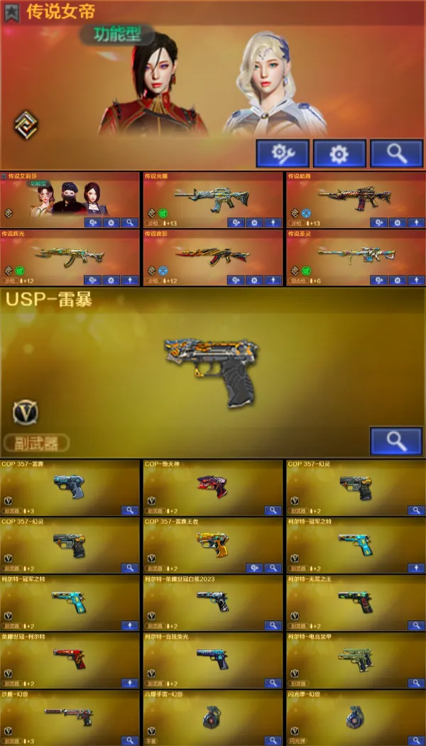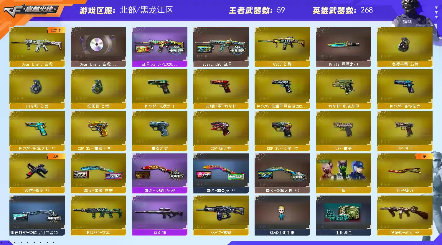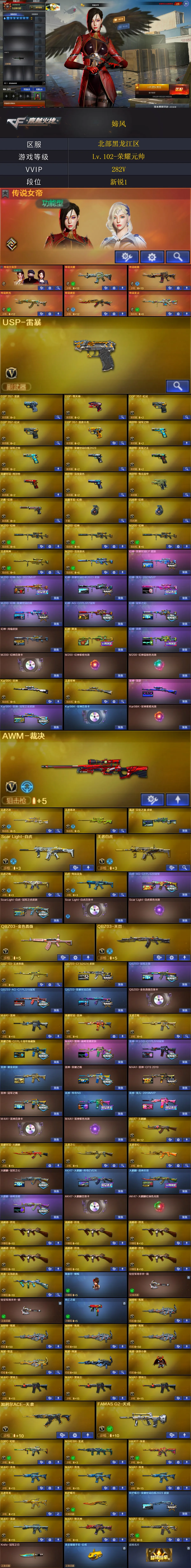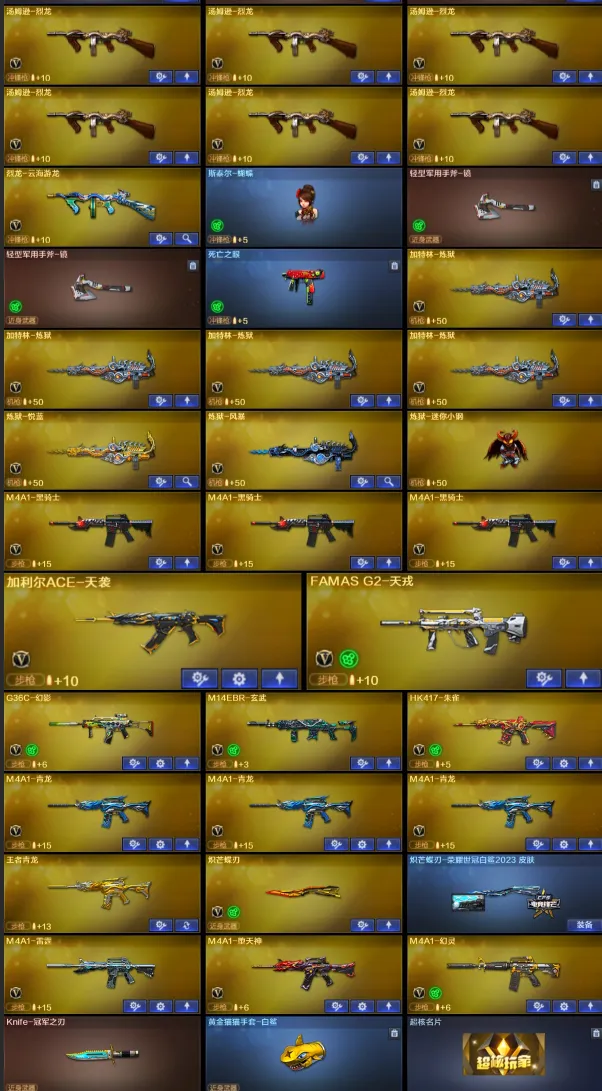 【稀有武器】:传说光耀/传说暗裔/传说辉光/传说夜影/传说圣灵/M200-幻神(3)/Kar98K-星神/G36C-幻影/ScarLight-白虎/M14EBR-玄武/M4A1-青龙(3)/HK417-朱雀/QBZ03-天罚/M4A1-幻灵/M4A1-雷霆/M4A1-堕天神/雷霆之契/USP-雷暴/COP-堕天神/柯尔特-电竞装甲/COP357-幻灵(2)/柯尔特-竞技荣光/天神-动感闪耀/柯尔特-荣耀世冠白鲨2023/柯尔特-无冕之王/修罗-古蛇迷踪/沙鹰-幻兽/荣耀世冠-柯尔特/COP357-雷霆王者-觉醒版/柯尔特-冠军之特(2)/金色蔷薇-古蛇迷踪/QBZ03-金色蔷薇/AK47-火麒麟(3)/M4A1-黑龙(2)/M4A1-雷神(6)/M4A1-黑骑士(3)/AK47-无影/AK47-黑武士/荣耀世冠-火麒麟/荣耀世冠-雷神/白虎-电玩蓝兔/Barrett-毁灭(8)/Barrett-极光/AWM-裁决(2)/M200-竞技荣光/加特林-炼狱(4)/炼狱-风暴/悦蓝-惊涛骇浪-觉醒版/汤姆逊-烈龙(6)/AA-12-雷霆/炽芒蝶刃/麒麟刺-堕天神/龙啸-堕天神/幻灵之锋(2)/擎天-竞技荣光/唐刀-神工天巧/女皇利刃-幻兽