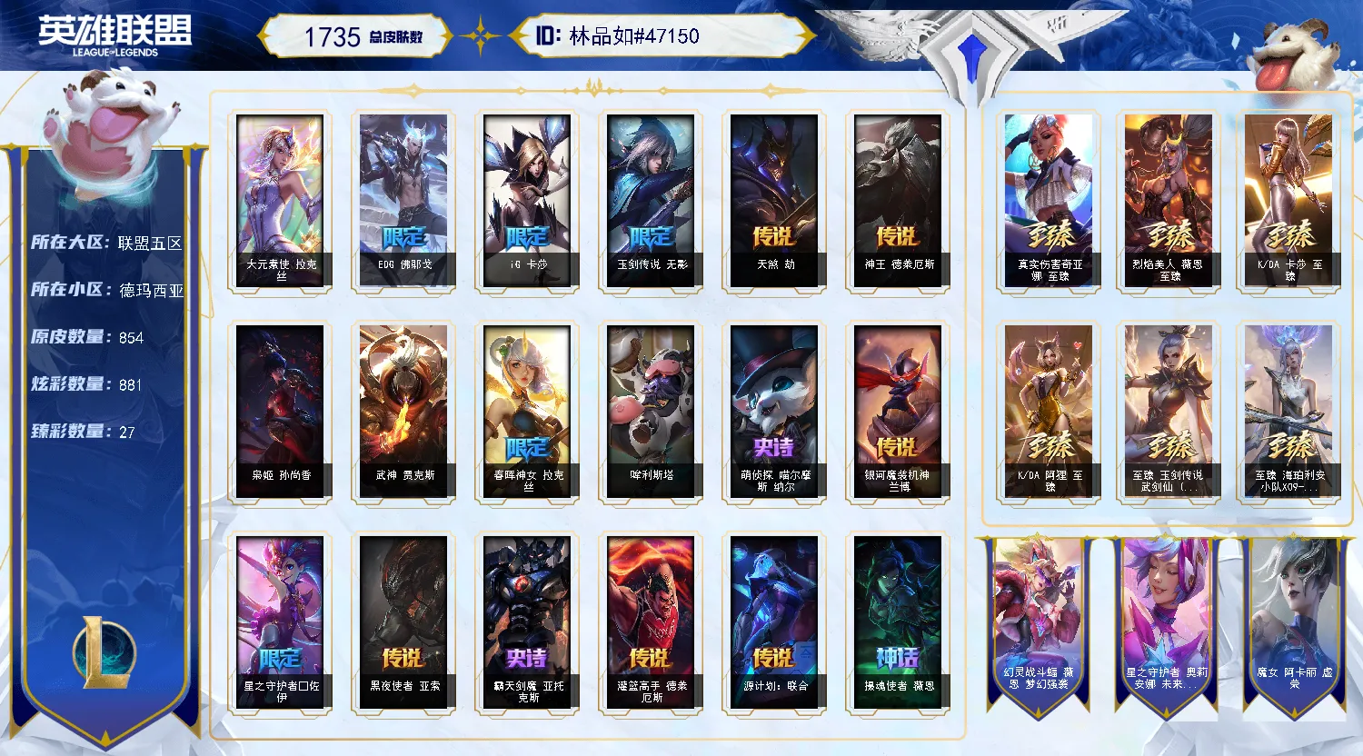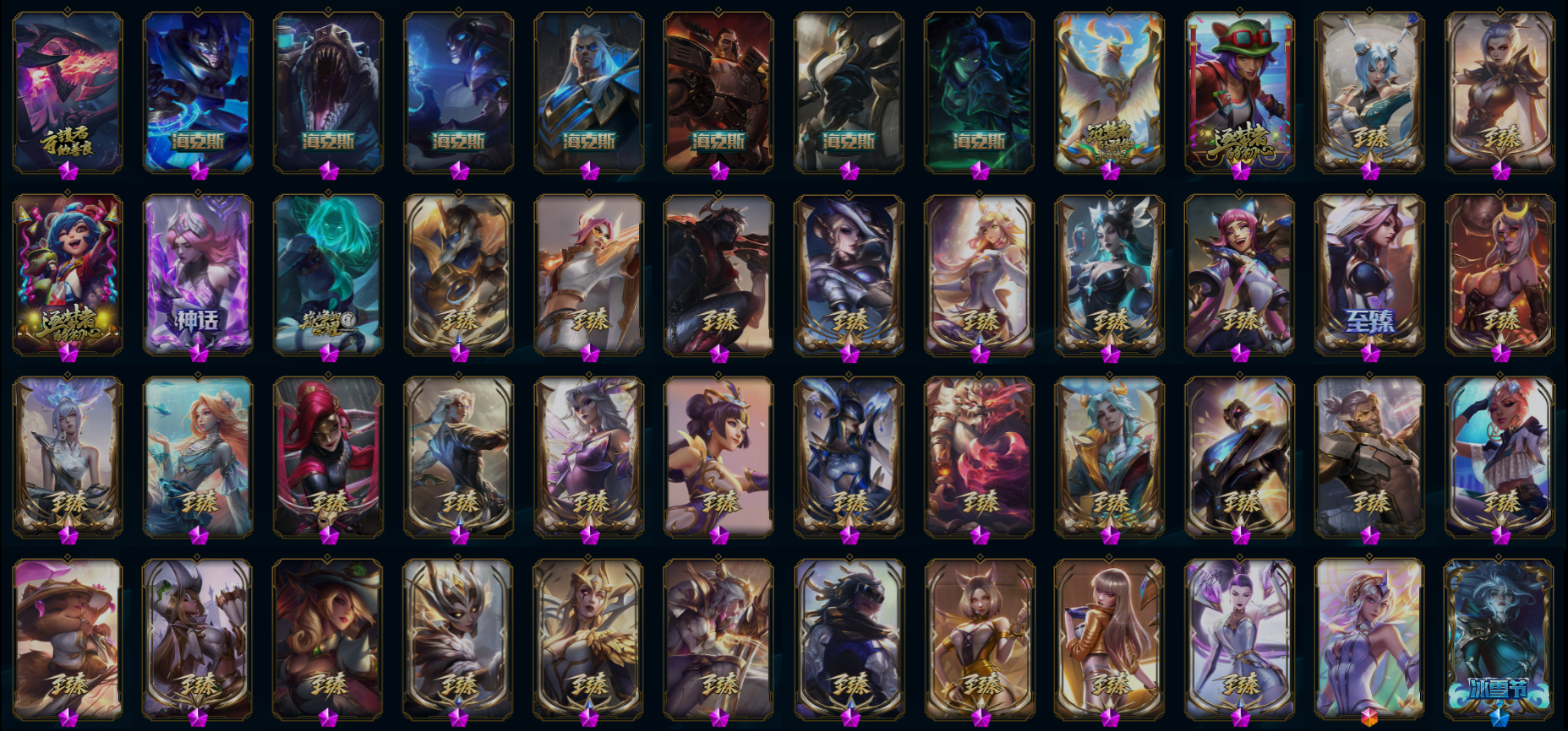 【重要皮肤】黑色玫瑰假面舞会卡特琳娜至臻 西部魔影伊芙琳至臻 天龙之子伊泽瑞尔至臻 玉剑传说琴仙子至臻 花仙使者卡特琳娜至臻 绝息圣堂厄运小姐至臻 青花瓷丽桑卓至臻 海珀利安小队X09星环灵风迦娜至臻 星之守护者辛德拉至臻 海之歌萨勒芬妮至臻 西部魔影猎天使恶魔泰隆至臻 幻灵战斗猫金克丝至臻 青花瓷拉克丝至臻 魅惑女巫莫甘娜至臻 女帝黛安娜至臻 魔女婕拉至臻 魔女乐芙兰至臻 真实伤害赛娜至臻 星之守护者索拉卡至臻 灵魂莲华提莫至臻 福牛守护者菲奥娜至臻 源计划逆流塞拉斯至臻 黑夜使者凯隐至臻 神龙尊者均衡之龙沃利贝尔至臻 飞升战神潘森至臻 KDA二代卡莎至臻 KDA一代卡莎至臻 KDA阿狸至臻 KDA阿狸2022至臻 烈焰美人薇恩至臻 烈焰美人薇恩2022至臻 魅惑女巫厄运小姐至臻 真实伤害奇亚娜至臻 玉剑传说武剑仙至臻 玉剑传说武剑仙2022至臻 未来战士锤石至臻 未来战士锤石2022至臻 海克斯科技雷克顿 海克斯科技斯维因 海克斯科技玛尔扎哈 海克斯科技嘉文四世 水晶圣骑蕾欧娜 暗星科加斯 恐惧新星德莱厄斯 零之枪骑赫卡里姆 摄魂使者薇恩 胜利女神娑娜 胜利巨口克格莫 黑夜使者弗拉基米尔 勇敢的心德莱厄斯 电玩女神厄运小姐 电玩女神阿狸 玉剑传说无影 神凰行者幽羽玄凰萨勒芬妮 玉剑传说星仙子 玉剑传说翼剑仙 星之守护者佐伊 点心宝贝阿木木 点心宝贝辛德拉 天龙之子斯莫德 替父从军花木兰 春晖神女拉克丝 张辽文远 神龙之翼库奇 福牛守护者嘉文四世 福牛守护者菲奥娜 胜利女神瑟庄妮 胜利机器人布里茨 胜利女神奥莉安娜 胜利枪神卢锡安 胜利之剑亚托克斯 怦然心动凯特琳 水晶玫瑰阿克尚 甜心之羽霞 甜心宝贝娑娜 觅心猫猫悠米 水晶玫瑰婕拉 水晶玫瑰斯维因 北极星神黛安娜 冬境仙灵索拉卡 寒冬精灵璐璐 雪球也能爆炸吉格斯 冰雪风暴希维尔 魄罗骑士瑟庄妮 平安夜女神娑娜 圣诞糖果棒厄运小姐 魅惑女巫莫甘娜 泳池派对厄运小姐 泳池派对塔里克 泳池派对李青 泳池派对雷克顿 泳池派对瑟提 泳池派对布隆 斩星魔剑易 御星魔矢艾希 送披萨的小姐姐希维尔 EDG佛耶戈 EDG悠米 FPX普朗克 iG洛 iG卡莎 iG乐芙兰 SSG霞 SKTT1烬 SSW图奇 SSW辛吉德 SKTT1婕拉 暗杀星奥莉安娜 暗杀星蒙多 暗杀星努努和威朗普 Fnatic迦娜 Fnatic库奇 Fnatic嘉文四世 冰雪节辛吉德 防暴士兵辛吉德 防暴天使凯尔 冠军典狱长锤石 冠军蔷薇乐芙兰 冠军之矛卡莉丝塔 冠军之刃锐雯2016 冠军之隐劫 春晖海神卡兹克 鬼影森森茂凯 鬼影重重魔腾 胡桃夹子萨科 惊悚派对费德提克 警用试作体K9内瑟斯 魅惑女巫娜美 魅惑女巫悠米 密林猎手提莫 南瓜头费德提克 女猎手希维尔 圣诞精灵崔丝塔娜 圣诞狂欢基兰 圣诞狂欢努努和威朗普 圣诞老人古拉加斯 圣诞玩偶波比 圣诞驯鹿克格莫 外星装甲库奇 无头骑士赫卡里姆 邪恶圣诞老人维迦 幸福女神乐芙兰 雪默丁格 雪装奈德丽 永恒之森乐芙兰 勇者阿狸 勇者奈德丽 暗影沃里克 阿木木主人不要我了 2023全球总决赛雷克顿 波比的巧克力工坊 都铎王朝图奇 十五周年纪念希维尔 十周年纪念安妮 源代码乐芙兰 神凰行者瑞羽圣凰艾尼维亚 大元素使拉克丝 灵魂守卫乌迪尔 绝息圣堂洛 魔女娜美